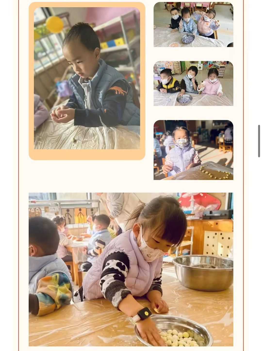 小班的萌娃们率先开启了 “舌尖上的冬至” 之旅!伴着欢快的笑声,老师与孩子们合作榨汁,把饱满的果实变成香甜汁水,再将汁水拌入细腻的糯米粉。“小手搓一搓,圆子圆溜溜~”在老师的耐心指导下,萌娃们洗净小手,小心翼翼地拿起面团,揉一揉、搓一搓,虽然动作略显笨拙,有的圆子扁扁的,有的大小不一,但每一个都藏着孩子们的认真与可爱。看着自己亲手搓的五彩小圆子,宝贝们脸上满是成就感。