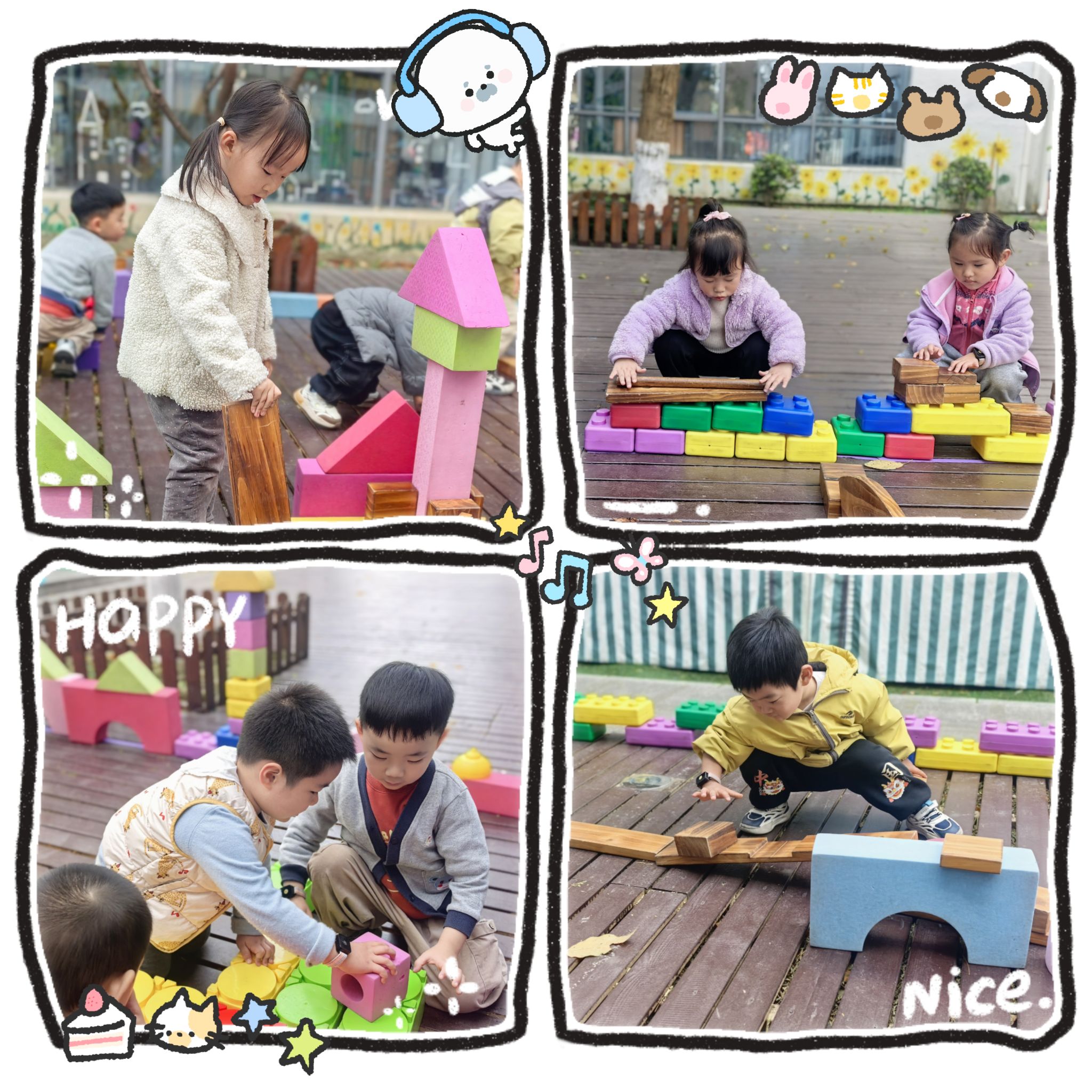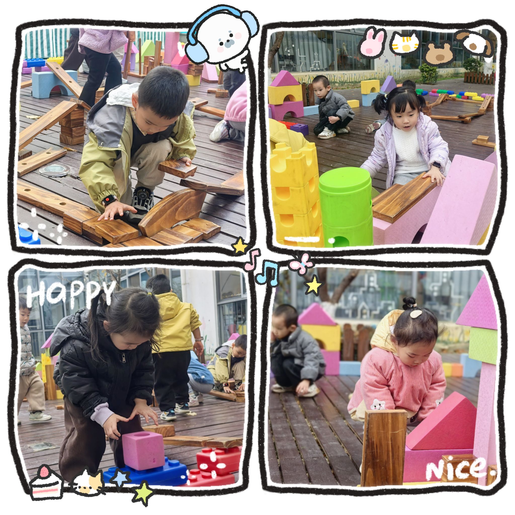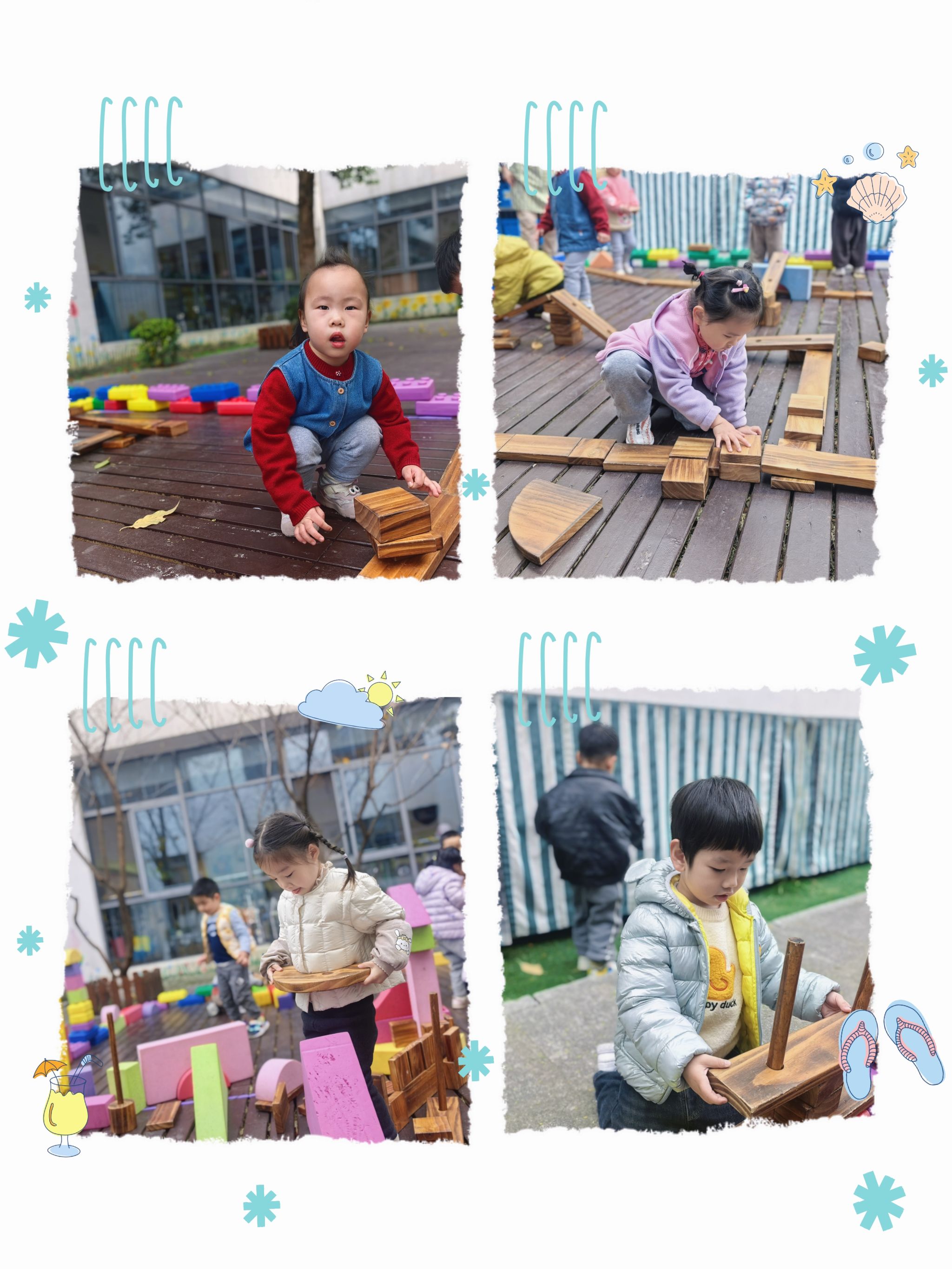 看!我们的户外建构师,小手多厉害,不但能搭城墙,还能搭高高的小房子。