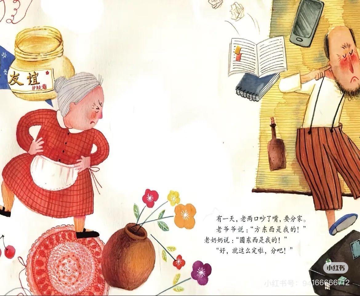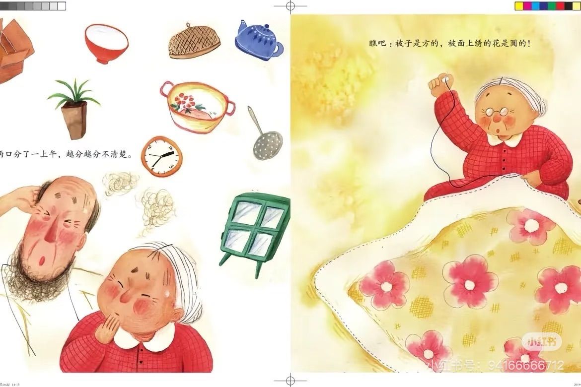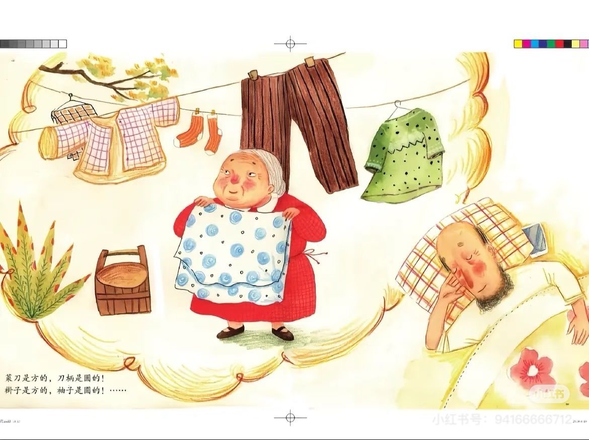 但很多物品都是由方形和圆形组成的。有一天他们吵嘴了,要分家。方形的物品归方爷爷,圆形的物品归方奶奶。可是,分着分着,他们发现分不清了。。。。。。