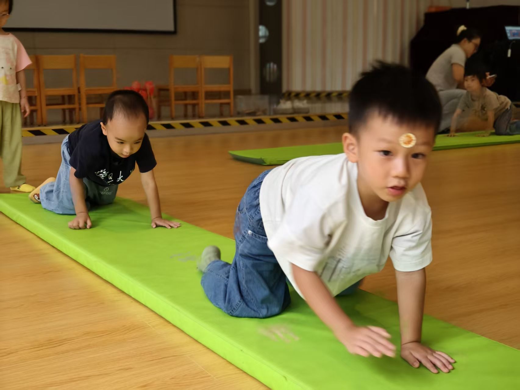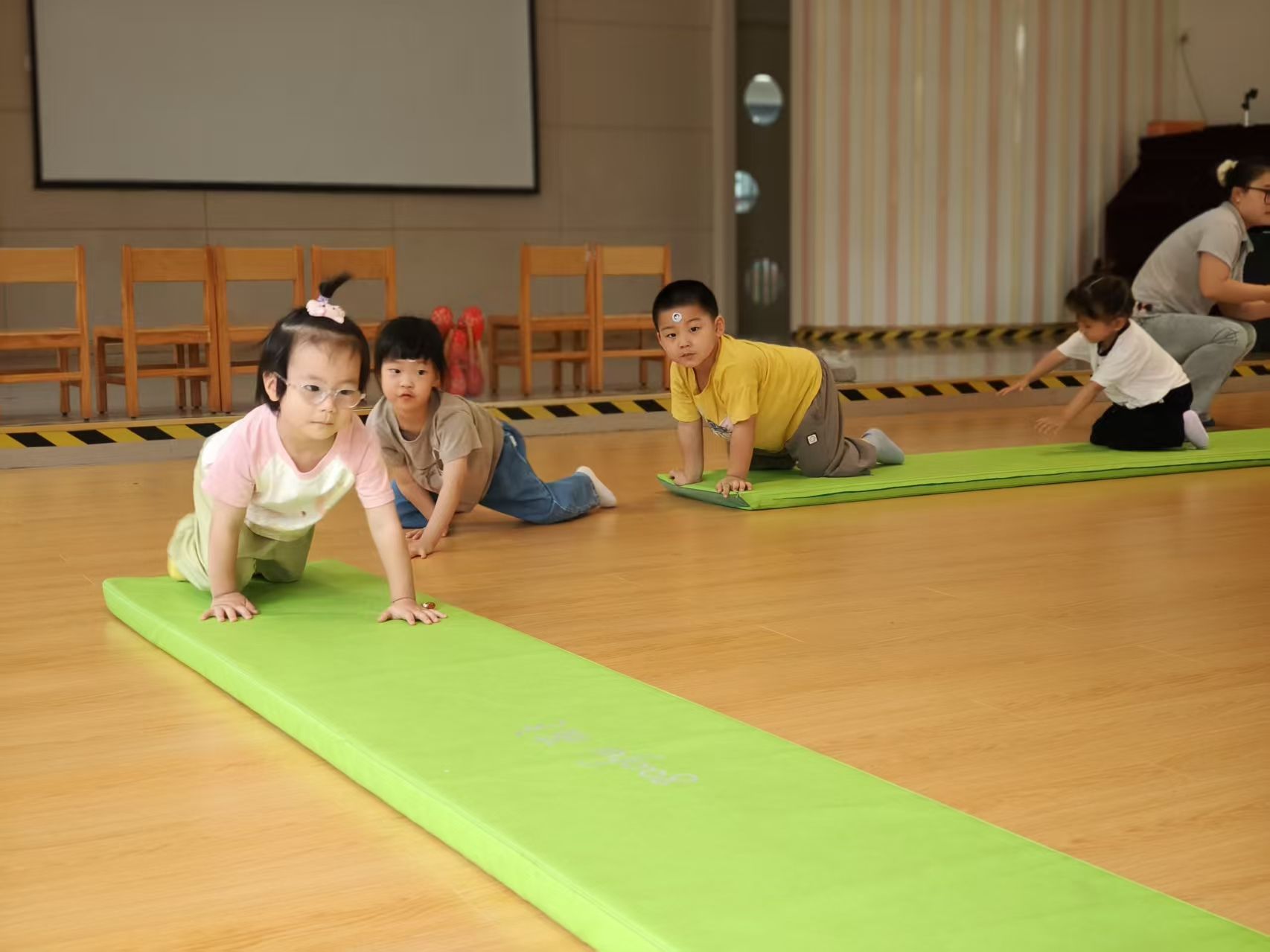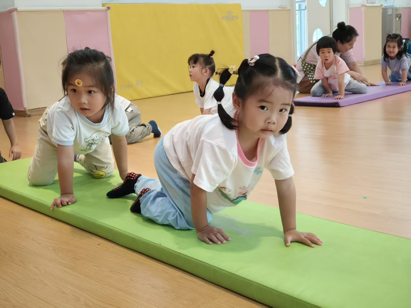 第一次快乐体操,我们挑战了自己上楼梯,自己穿地板袜。今天我们还伪装成小蚂蚁去蚂蚁王国探险。