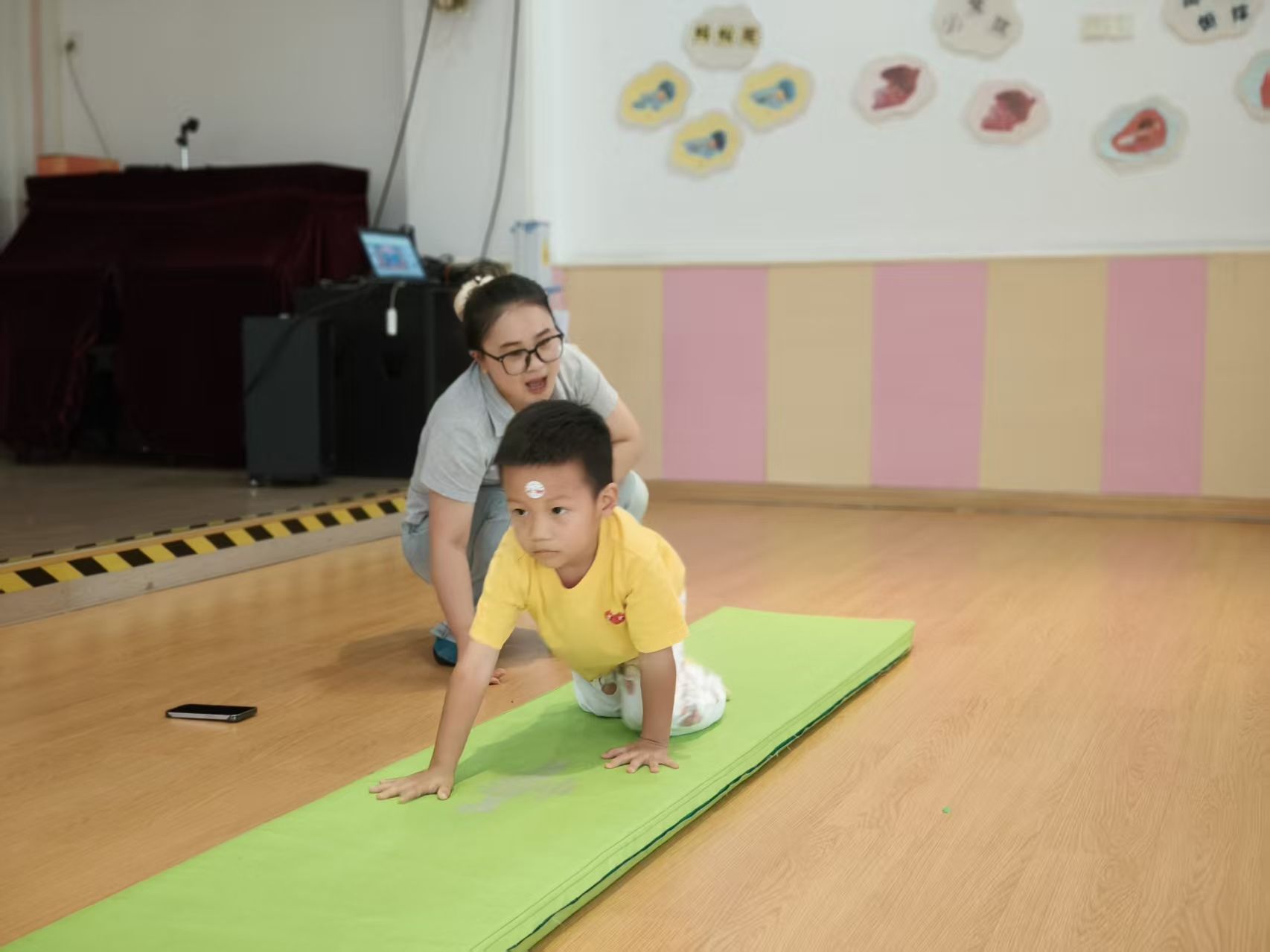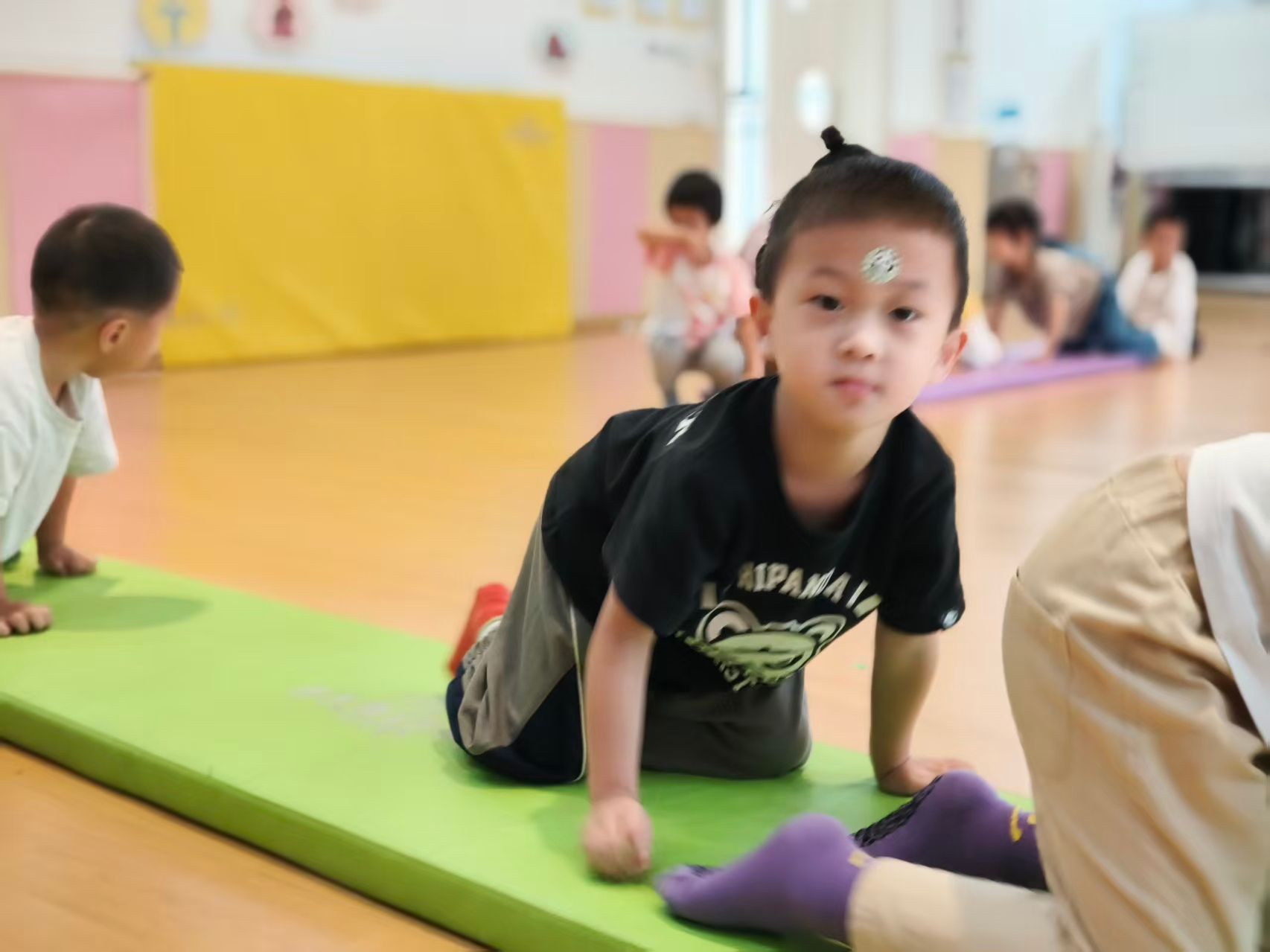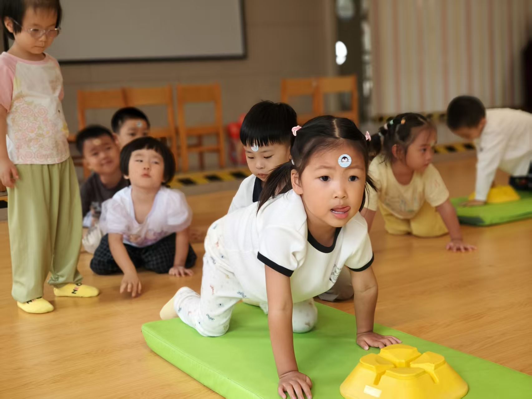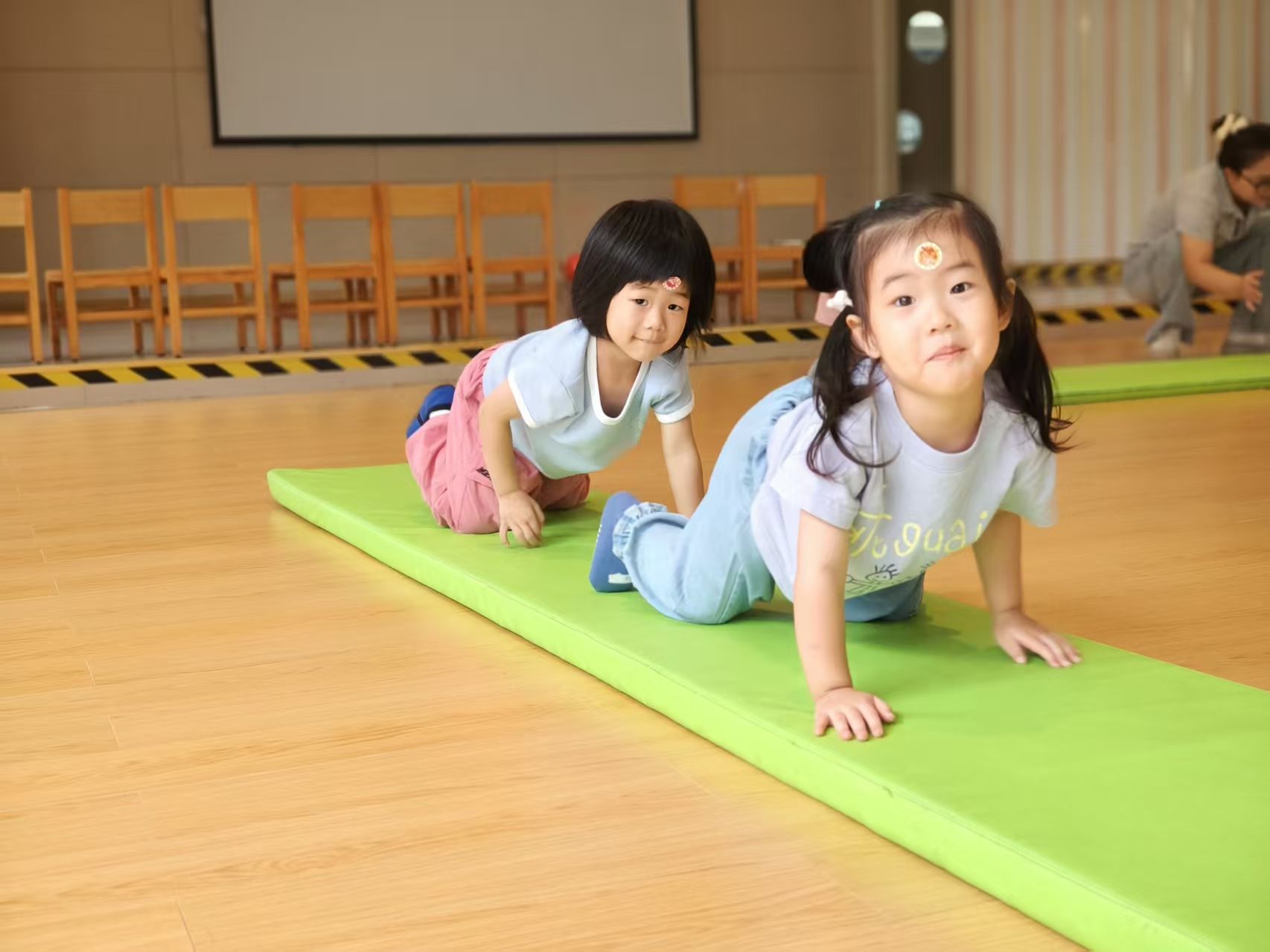 第一次快乐体操,我们挑战了自己上楼梯,自己穿地板袜。今天我们还伪装成小蚂蚁去蚂蚁王国探险。
