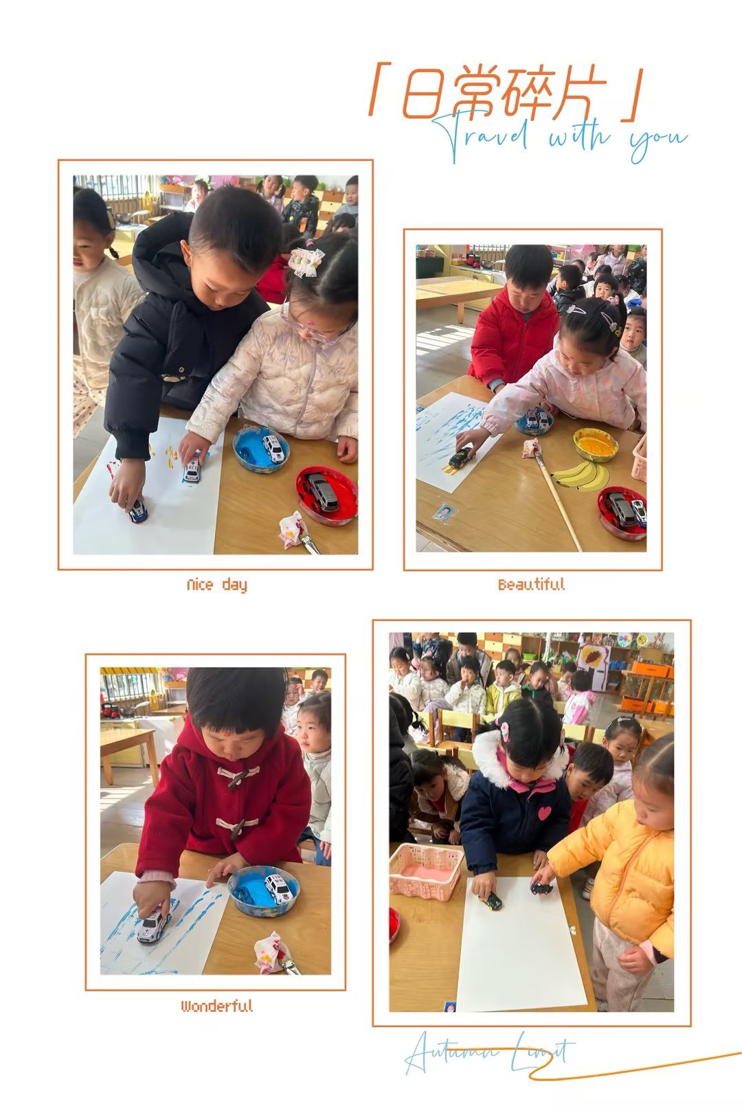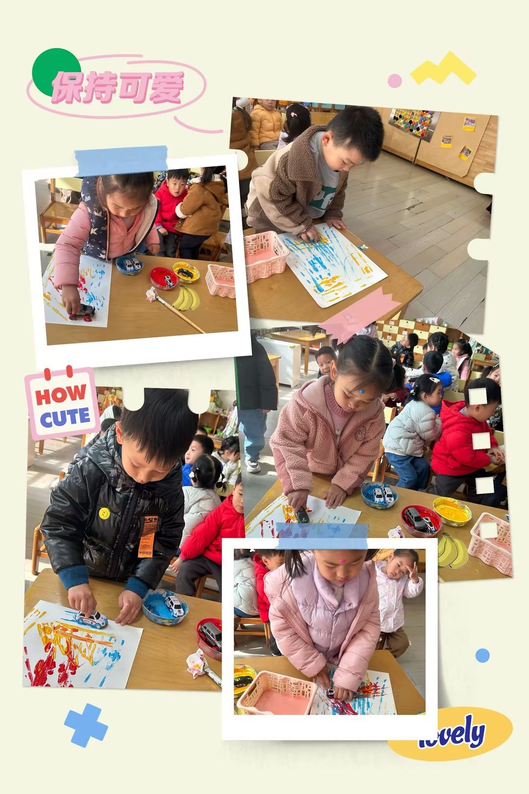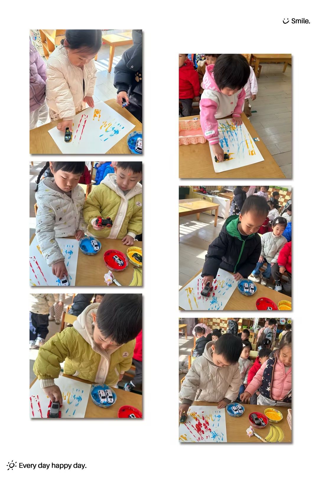 原来小汽车轮胎也能作画,拿出小汽车,涂抹好看的颜料在轮胎上,一起创作吧!