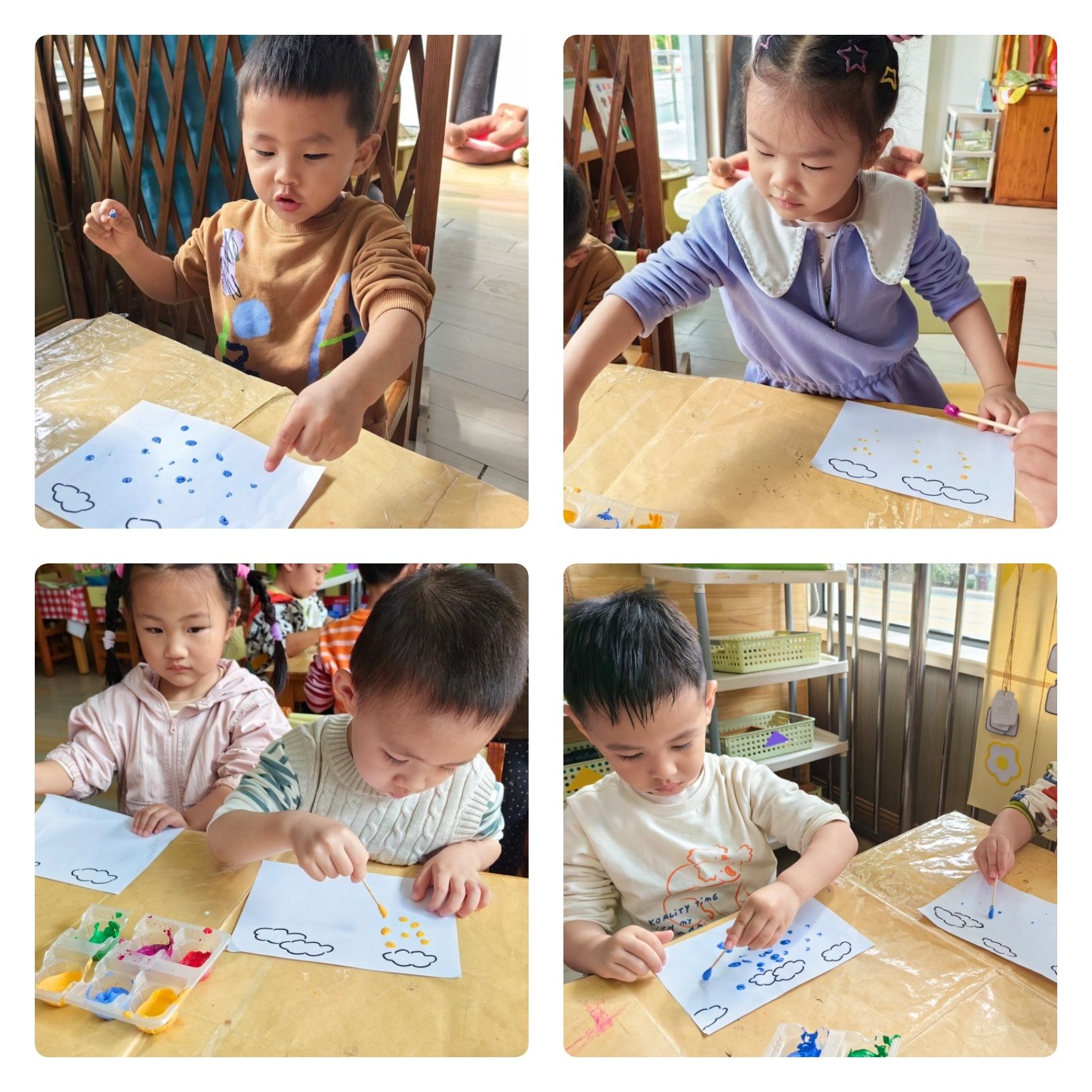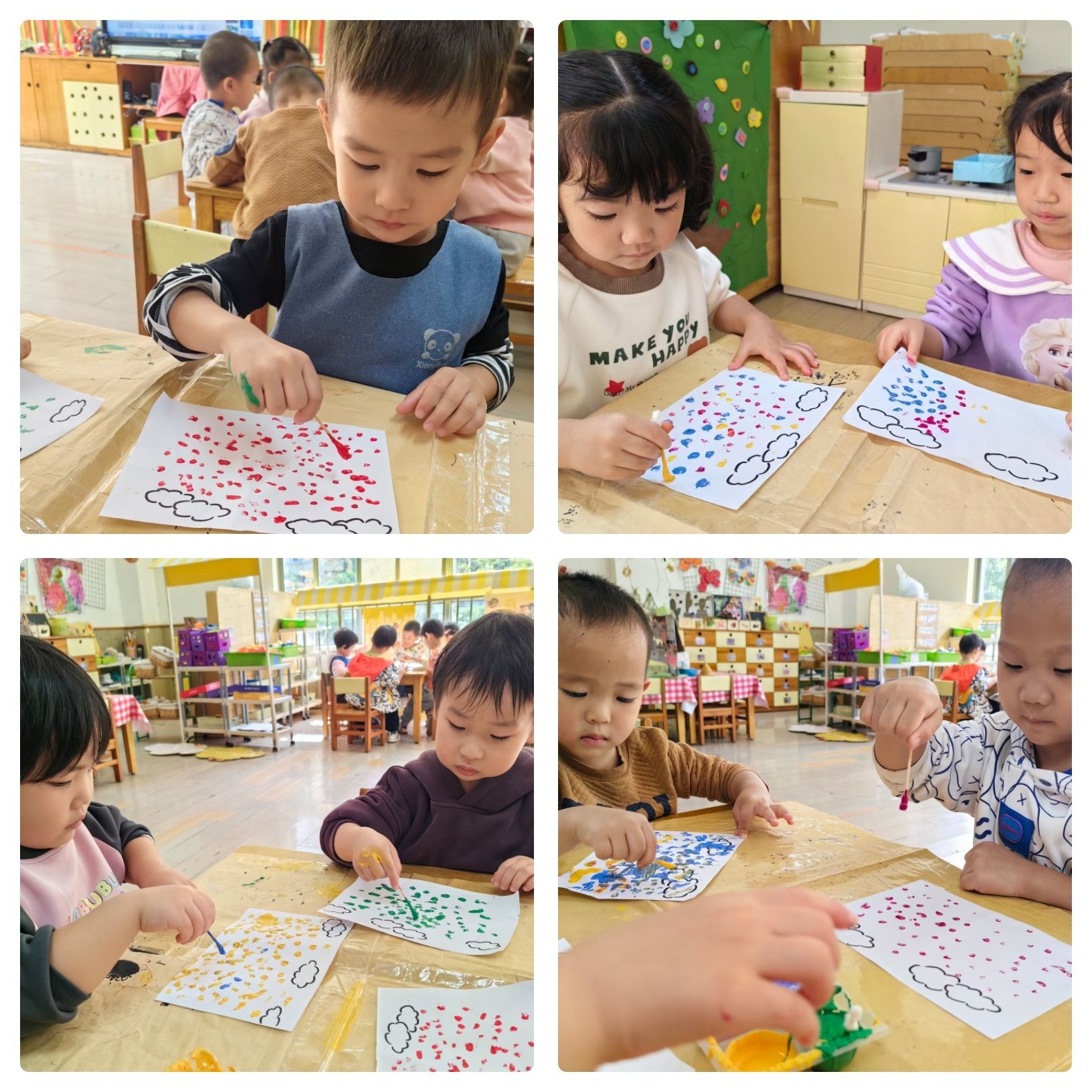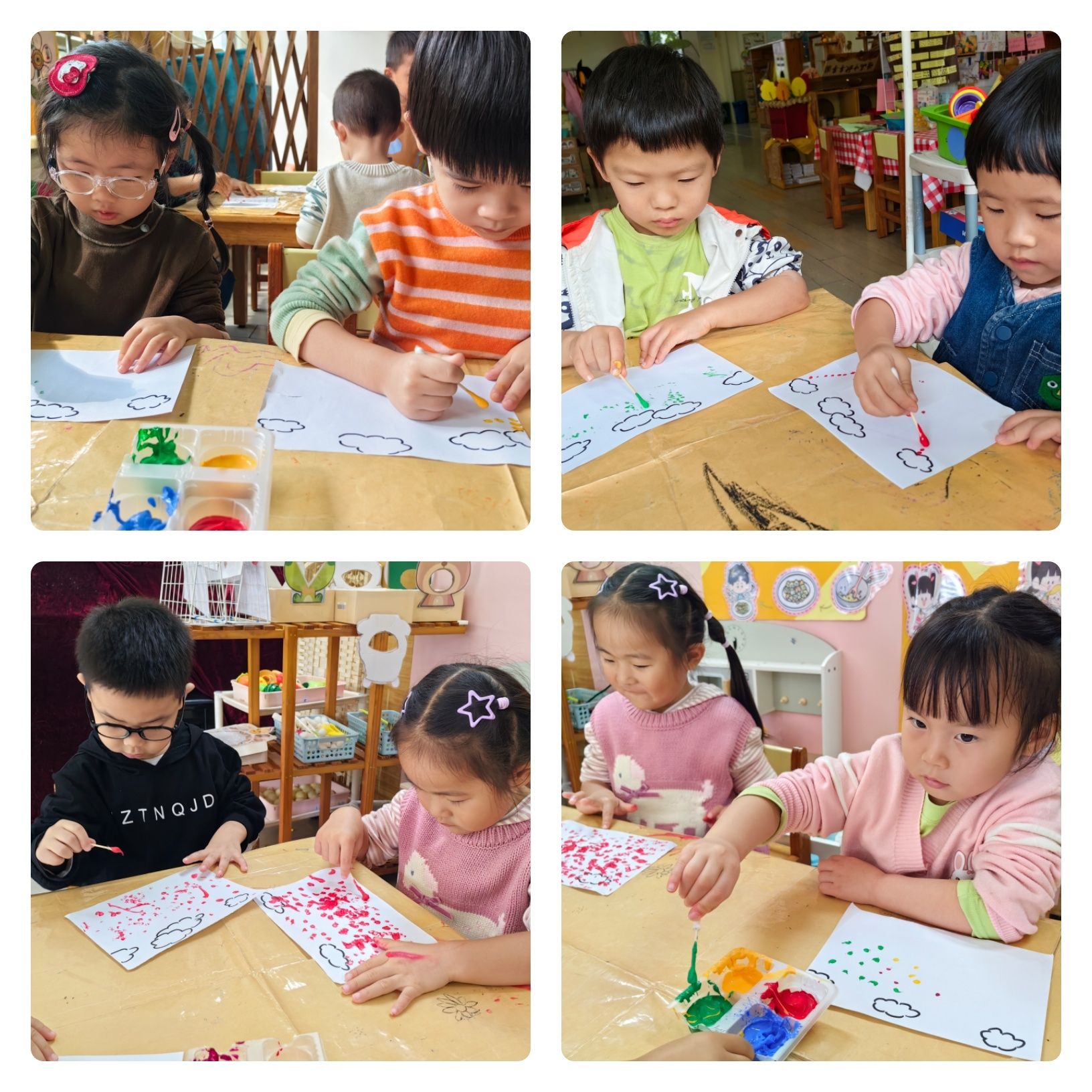 今天,一场别开生面的"颜料点画"活动在此展开,孩子们用棉签蘸取颜料,在画纸上点染出属于自己的天空。 活动中,老师提前为孩子们准备了印有云朵轮廓的画纸和红、黄、蓝、绿等多种颜料。小朋友们化身"小小艺术家",专注地在画纸上创作:红色的"雨点"、蓝色的"星光"、黄色的"阳光"在云朵间绽放,每一幅作品都充满天马行空的想象力。此次活动不仅锻炼了孩子们的动手能力,更让他们在色彩游戏中感受艺术创作的快乐。