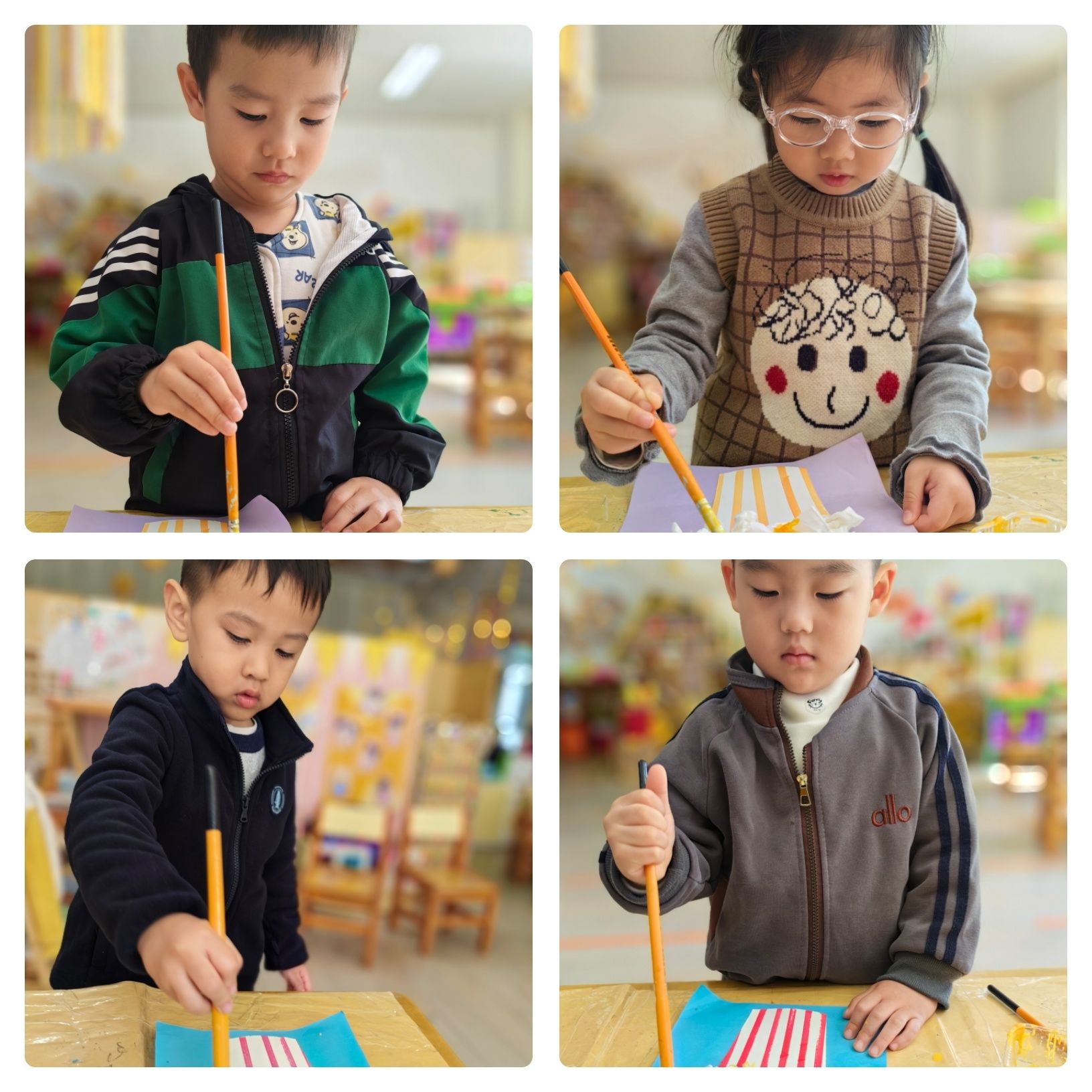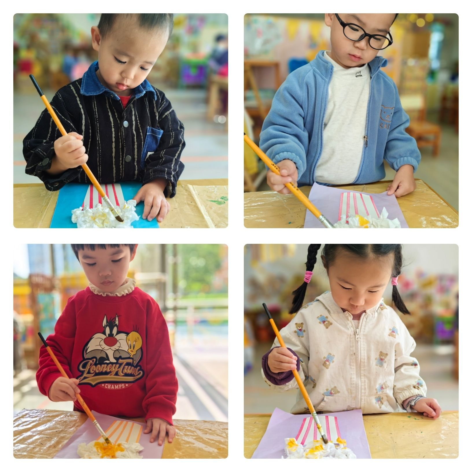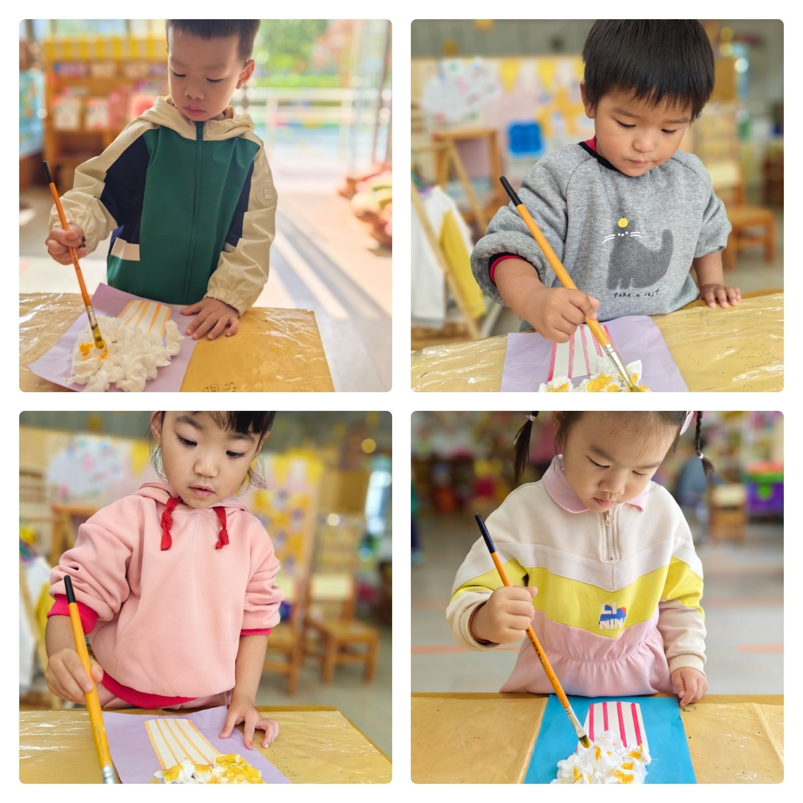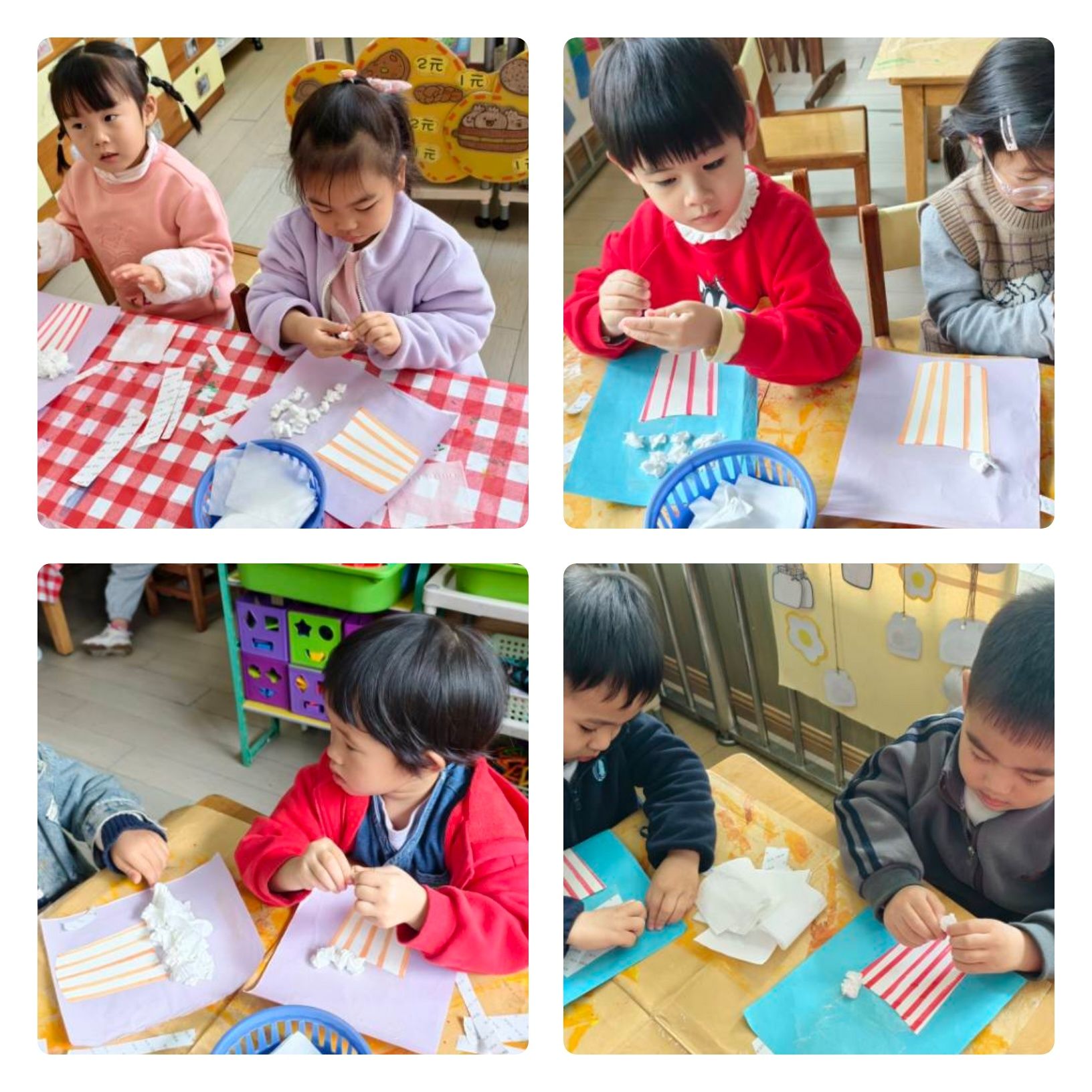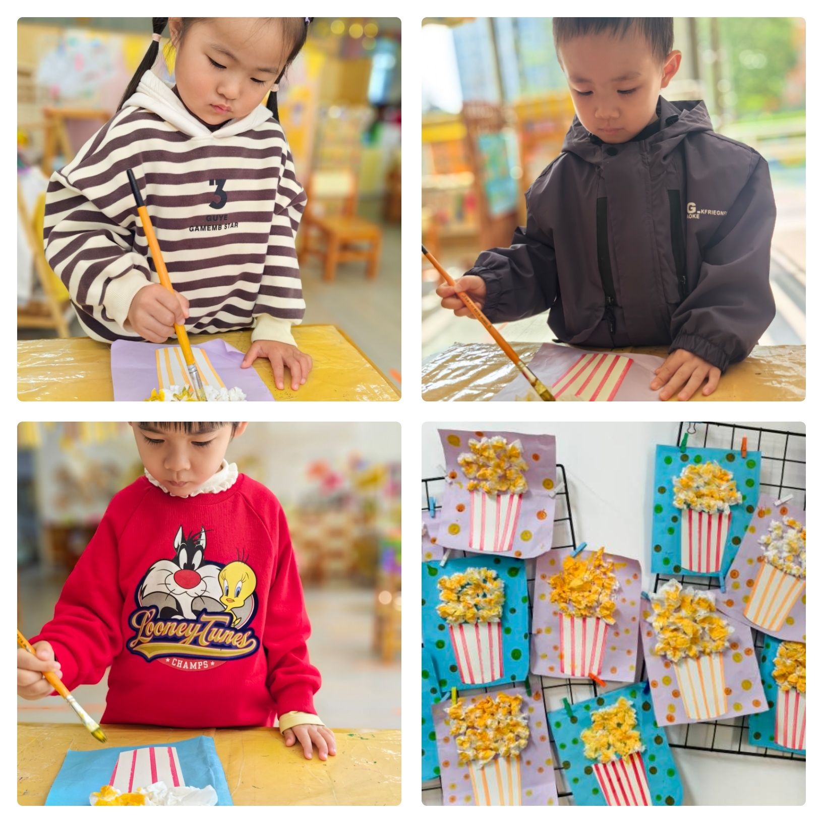 今天在小三班的教室里,宝贝们化身“小厨师”,用纸巾制作了一份份十分神似的爆米花哦~宝贝们用纸巾搓揉、粘贴、上色,在锻炼小手灵活度的同时,更是培养了艺术创作的能力呢!