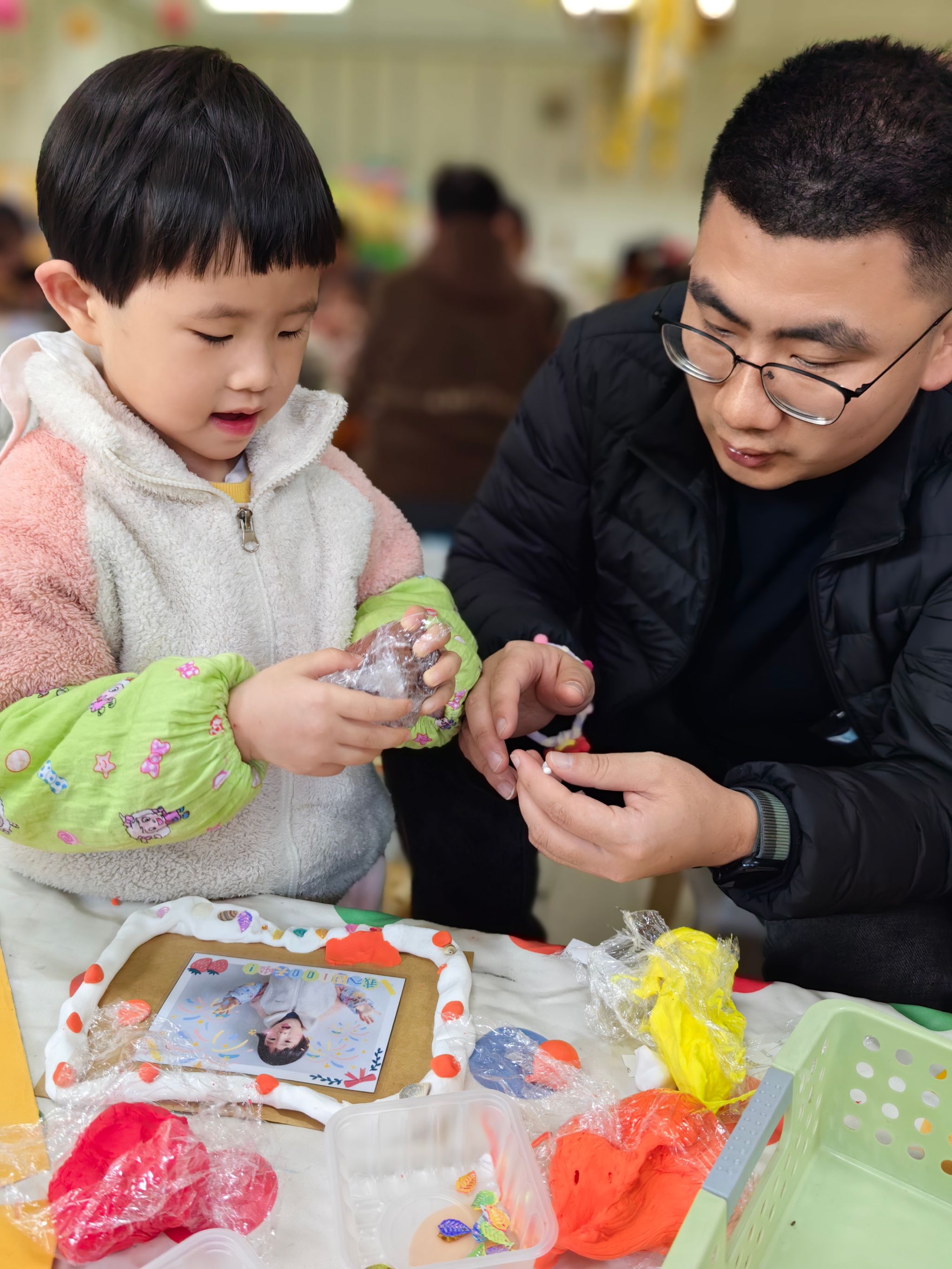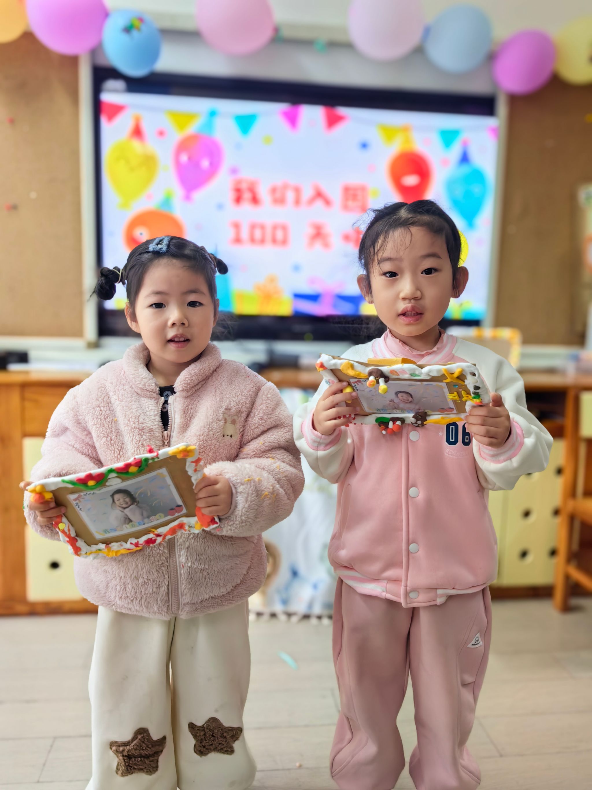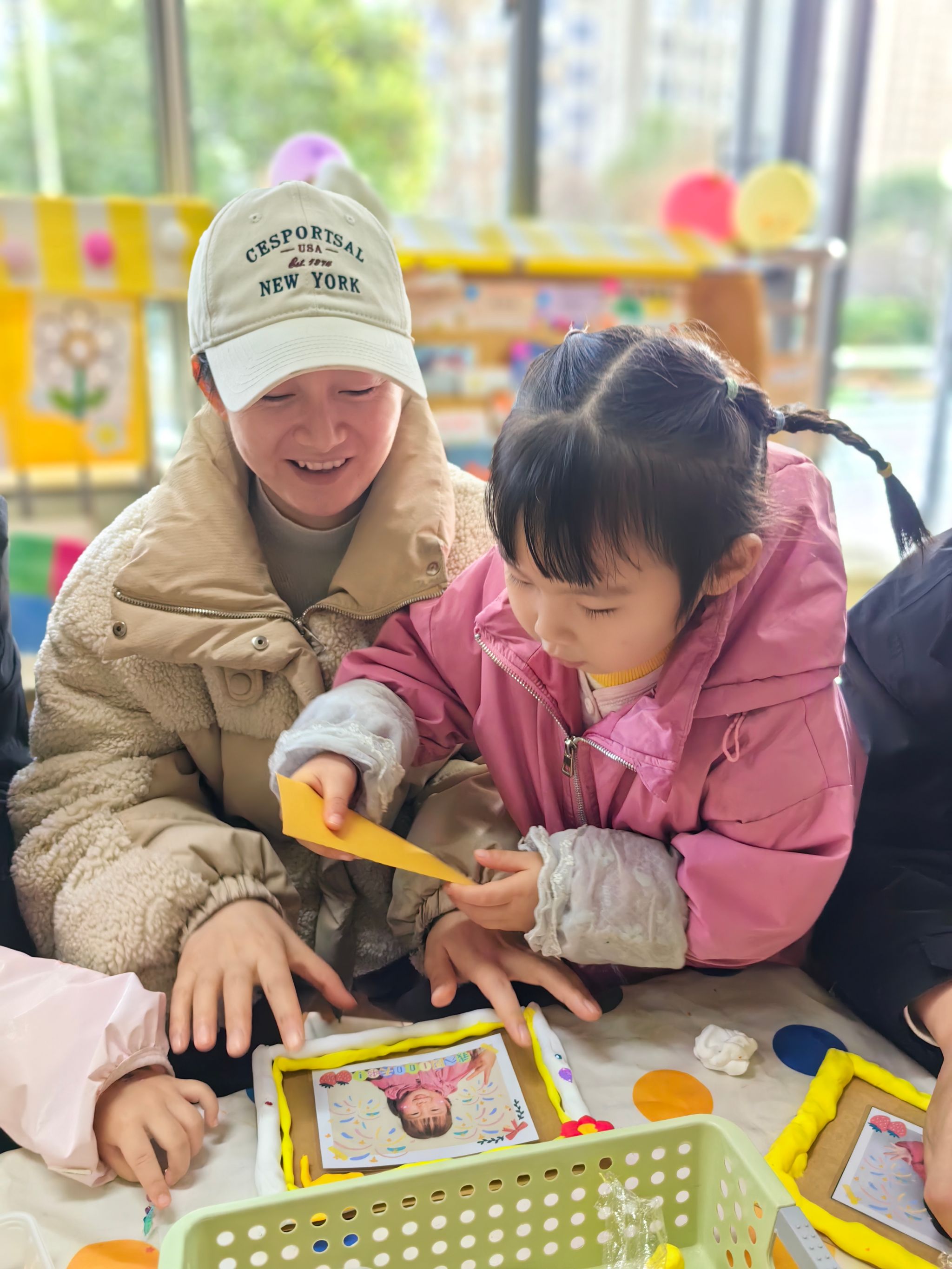 在孩子们入园百日之际,我们组织了一次亲子活动。孩子们看见爸爸妈妈来到幼儿园和自己一起参加活动都特别开心,我们先进行了亲子粘泡泡糖游戏,家长与孩子亲密互动,欢声笑语不断。随后,孩子们和家长一起制作百日成长纪念卡,将美好的祝福和回忆留存。孩子们还用彩框装饰百日照片,制作出独一无二的纪念相框!