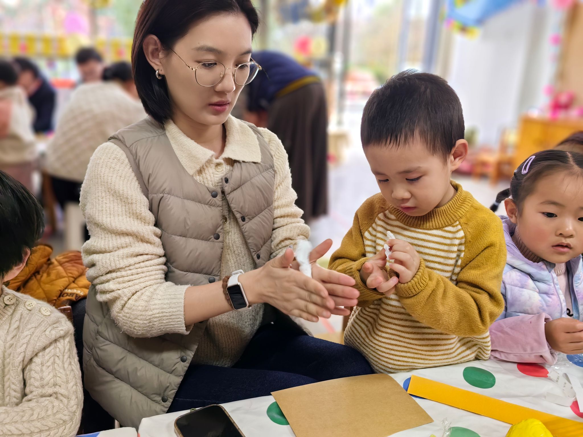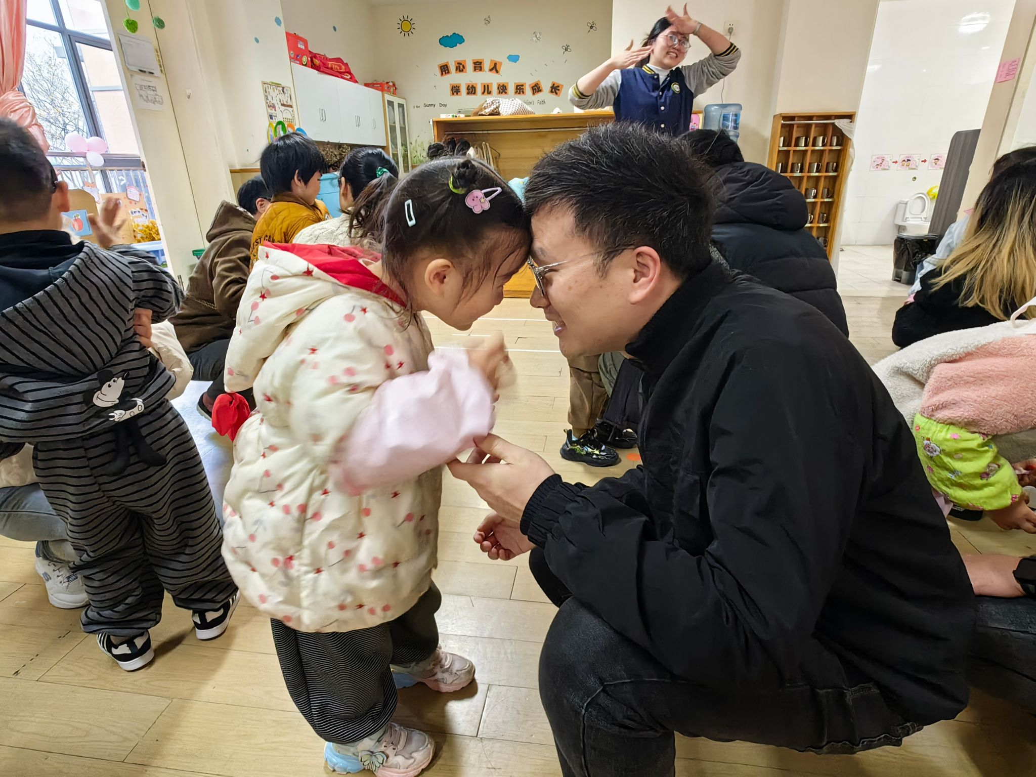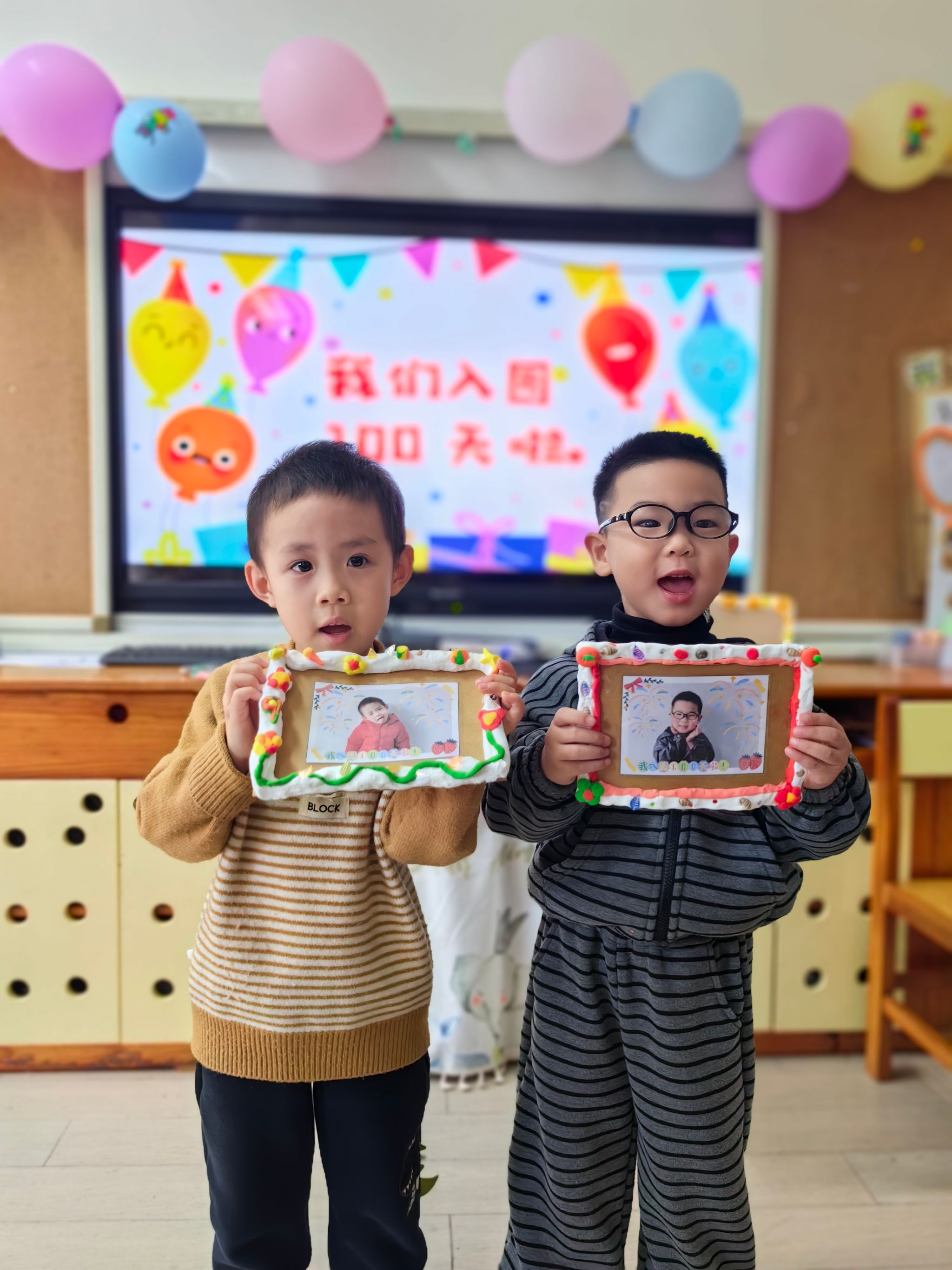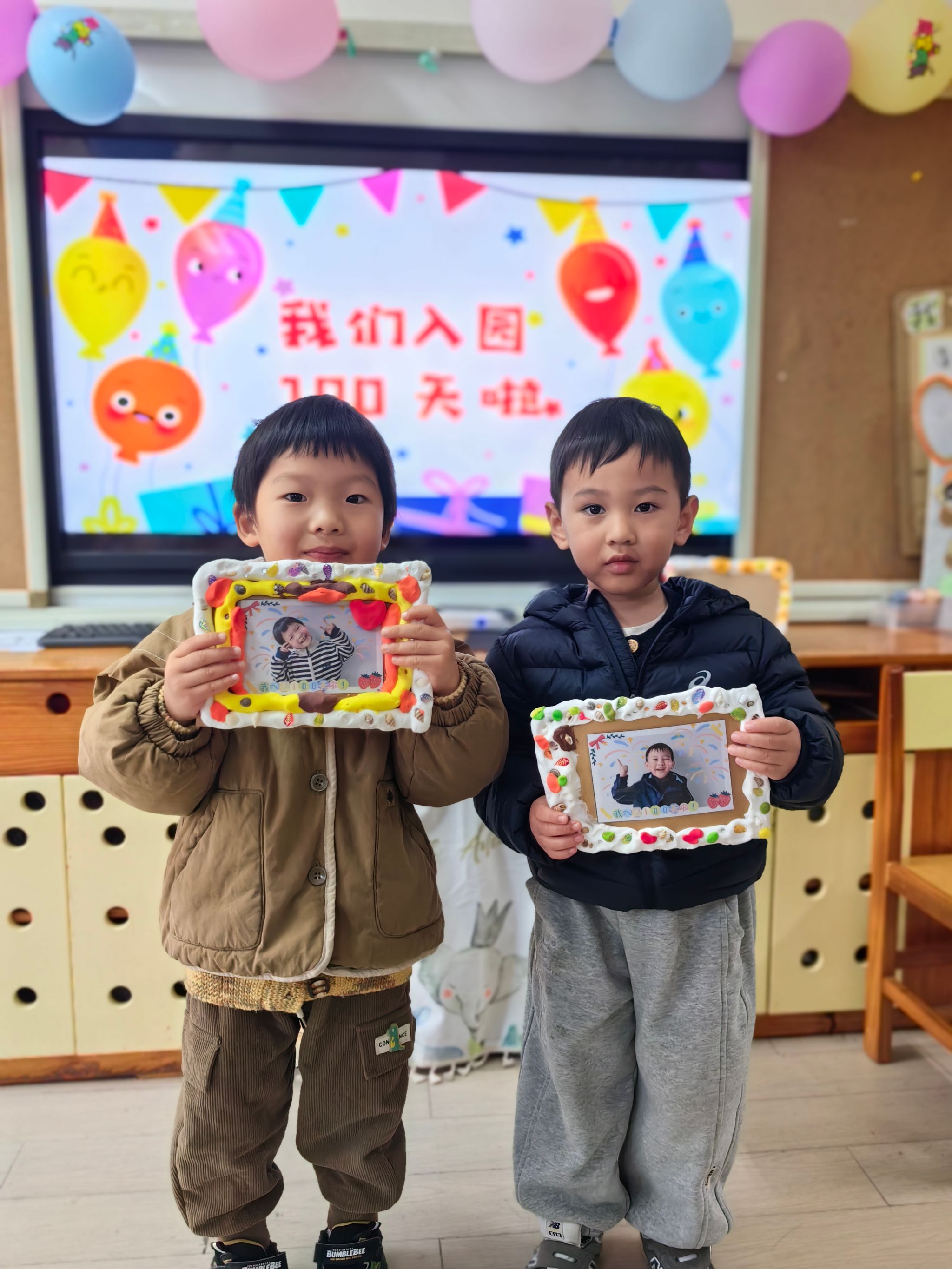 在孩子们入园百日之际,我们组织了一次亲子活动。孩子们看见爸爸妈妈来到幼儿园和自己一起参加活动都特别开心,我们先进行了亲子粘泡泡糖游戏,家长与孩子亲密互动,欢声笑语不断。随后,孩子们和家长一起制作百日成长纪念卡,将美好的祝福和回忆留存。孩子们还用彩框装饰百日照片,制作出独一无二的纪念相框!
