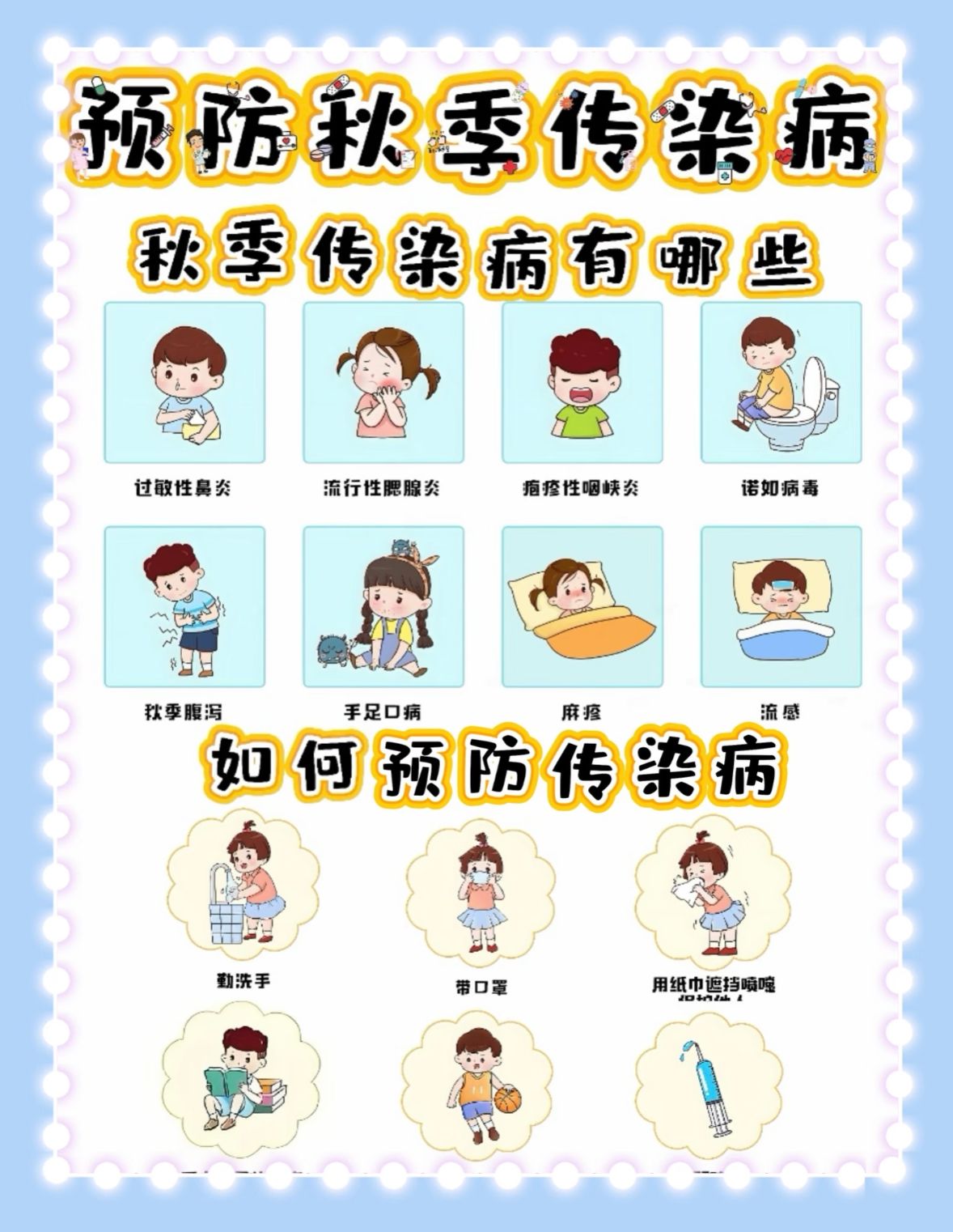 秋季是传染性疾病🦠的多发季节,常见的传染性疾病包括:流行性感冒🤧、手足口病、麻疹、水痘、腮腺炎、风疹、肠道传染病等。✅为了确保孩子的安全,我园除了严格执行晨午检制度、认真做好开窗🪟通风、校园清洁消毒外,也希望各位家长做到以下几点:👇👇👇