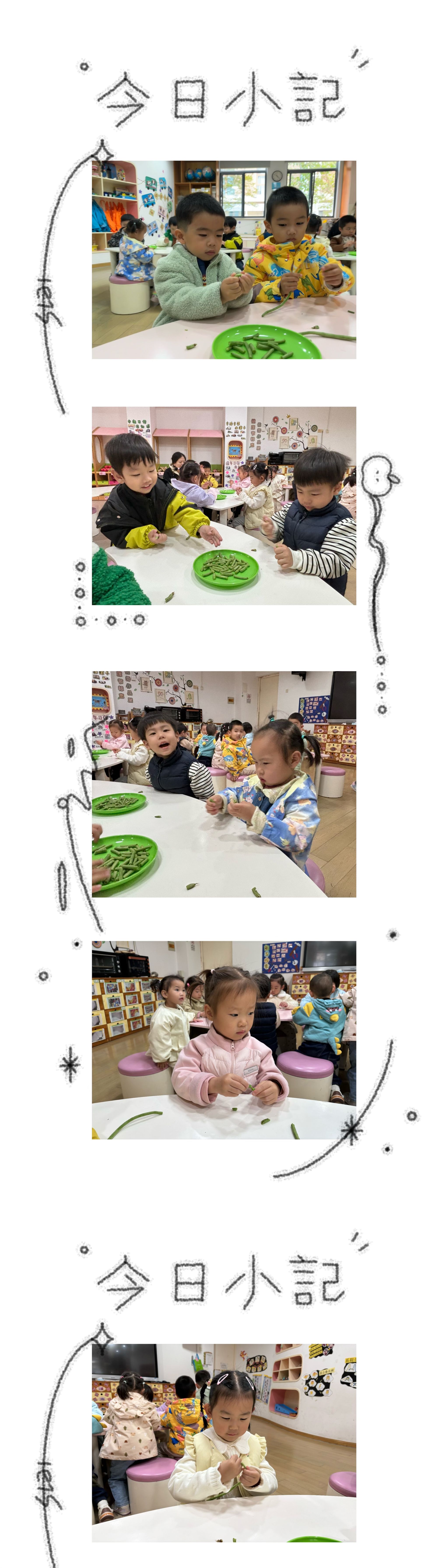今天,我们认识了一种食材——长豇豆。美味的长豇豆需要掰成一小段一小段的,让我们能干的小朋友们一起来掰长豇豆吧。