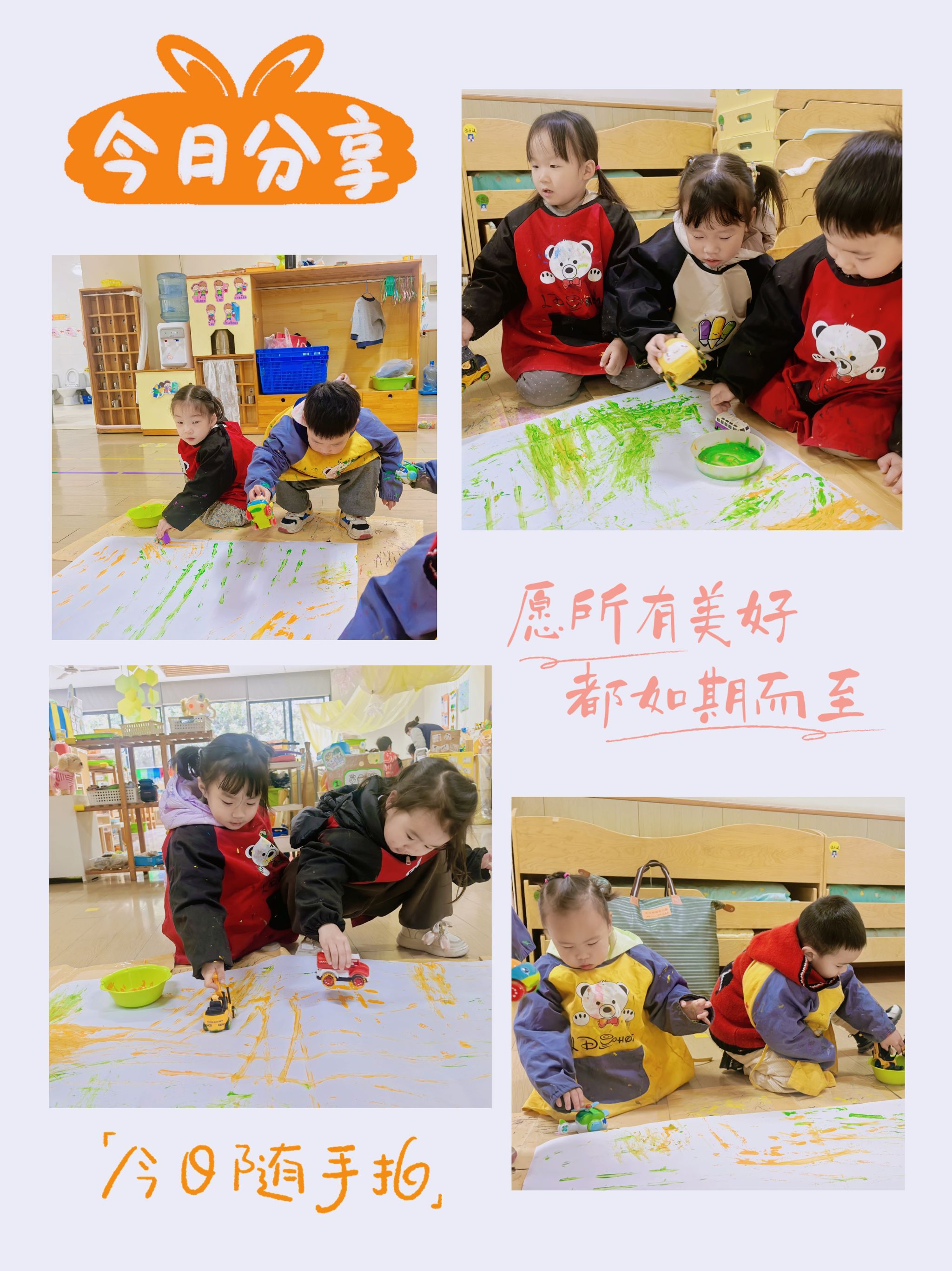 小汽车滴滴滴,沾上颜料,它的车轮印都变成彩色的啦!
