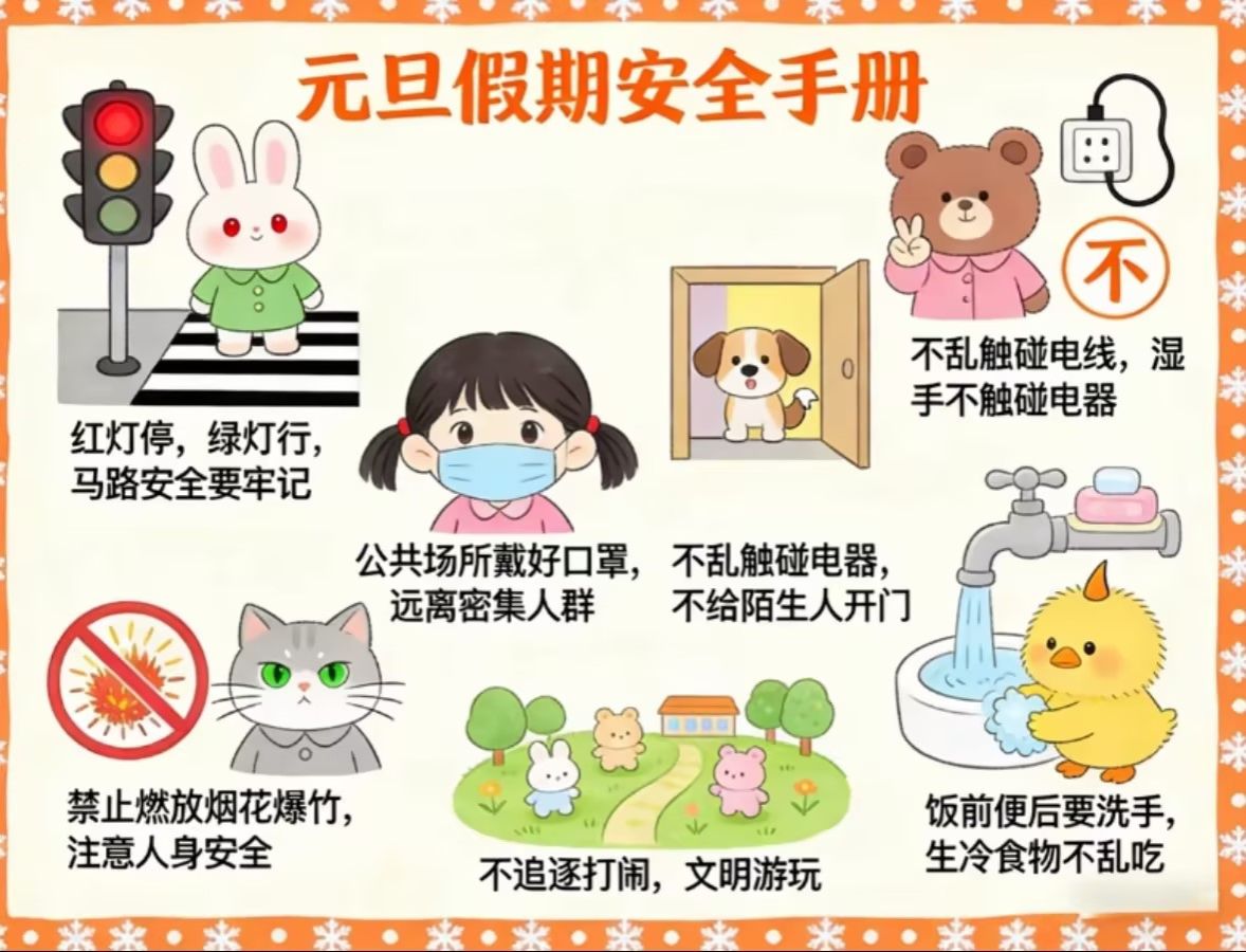 元旦假期来啦,宝贝们的快乐假期也要把安全记心上~🔴交通安全:红灯停绿灯行,马路规则记牢😷防疫安全:公共场所戴口罩,远离密集人群⚡用电安全:不乱碰电线,湿手不碰电器🚫燃放安全:禁放烟花爆竹,守护人身安全🎮游玩安全:不追逐打闹,文明玩耍🍚饮食安全:饭前便后洗手,生冷食物不乱吃🚪居家安全:不给陌生人开门愿所有宝贝都能度过一个平安又开心的元旦假期呀~