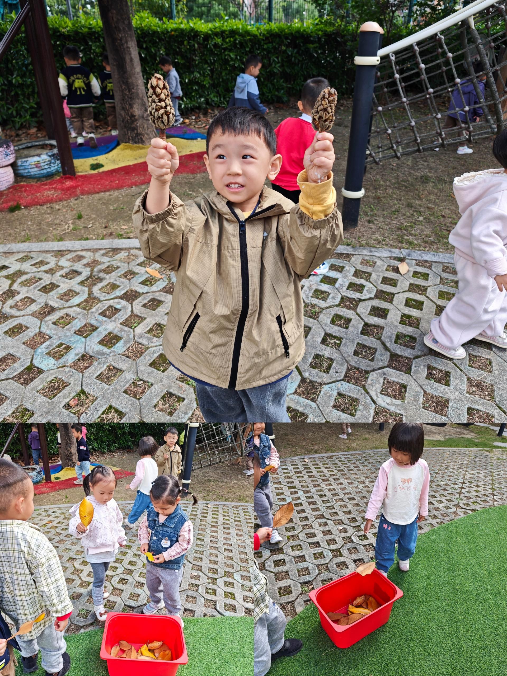 为了让孩子们在自然环境中体验秋天的特征,我们带着孩子们在饭后走近大自然体验秋天的美。