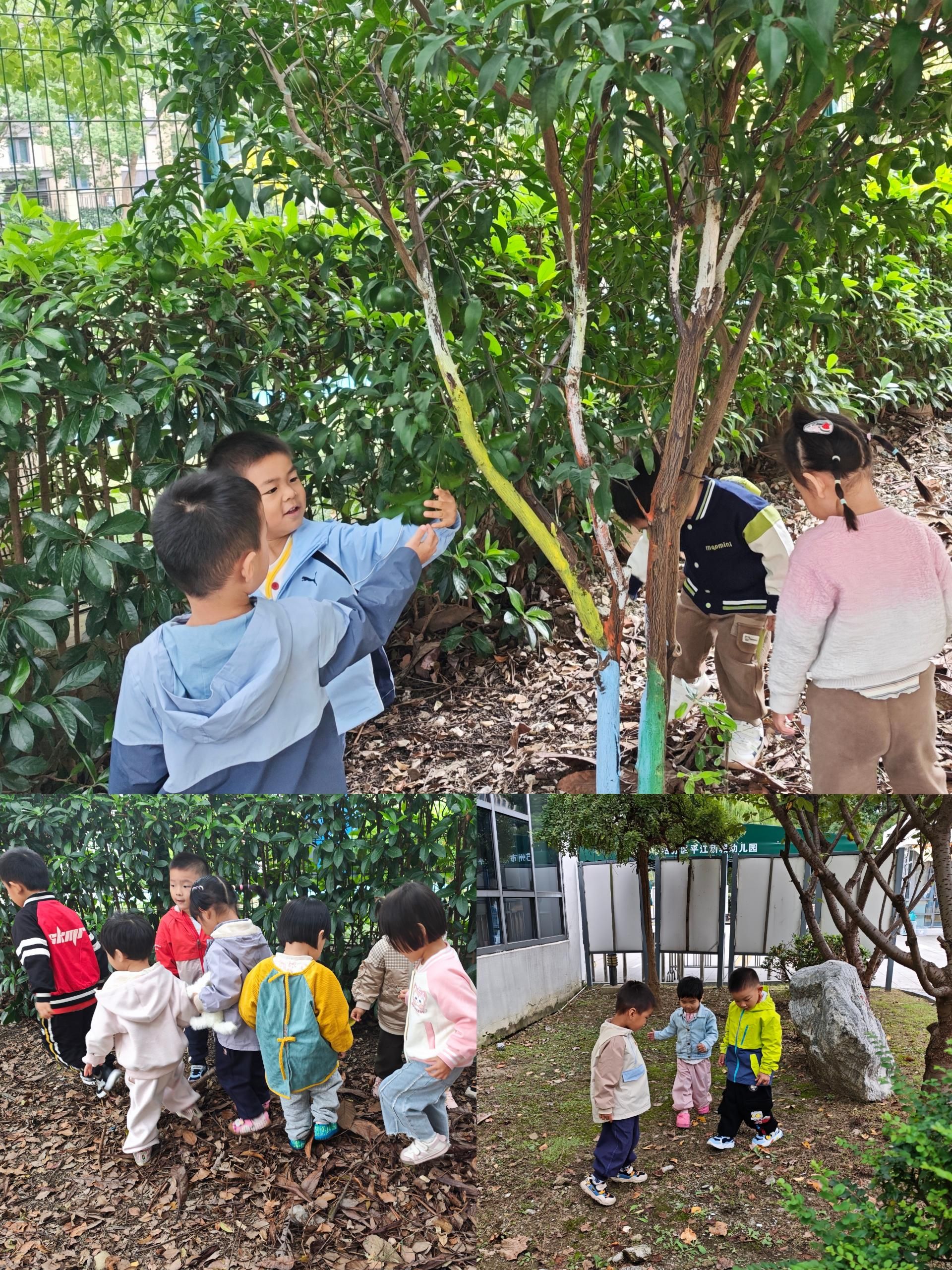 孩子们去捡树叶,好奇的小眼睛不停地搜索,一会儿说:“老师,看,这是松果。”一会儿又说:“老师,那棵树的叶子怎么和我以前看到的不一样?”“老师,这片树叶大不大!”孩子们还发现了果树上结出了果实,有橘子,有柚子。