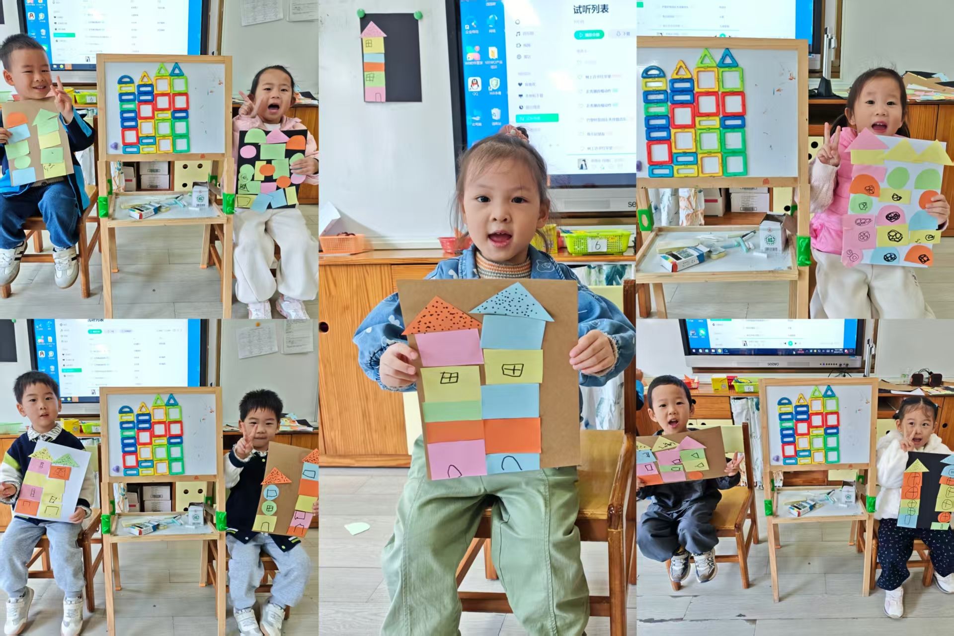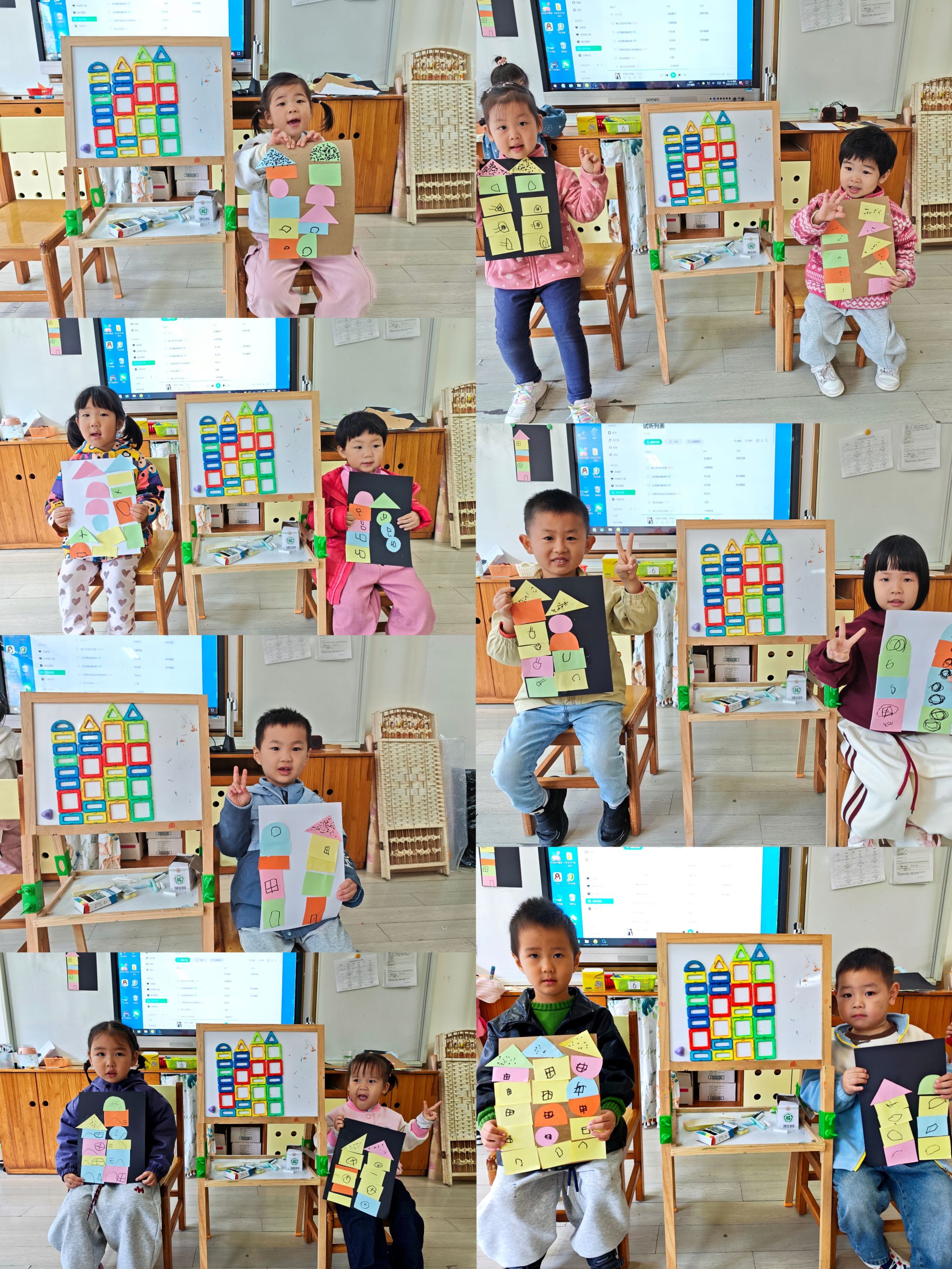 孩子们用彩纸贴出了一座座五彩斑斓的大高楼。“老师,我要做最高的楼!”小朋友兴奋地举起手中的彩纸。小朋友们纷纷挑选自己喜欢的颜色,有的用蓝色和粉色的彩纸叠贴,说这是“彩虹楼”。最后用勾线笔画上窗户和大门,孩子们互相欣赏着彼此的作品,“你的楼好漂亮!”“我的楼有好多窗户!”看着墙上贴满的彩色高楼,孩子们的脸上都洋溢着成功的喜悦。一起来看看孩子们的作品吧!