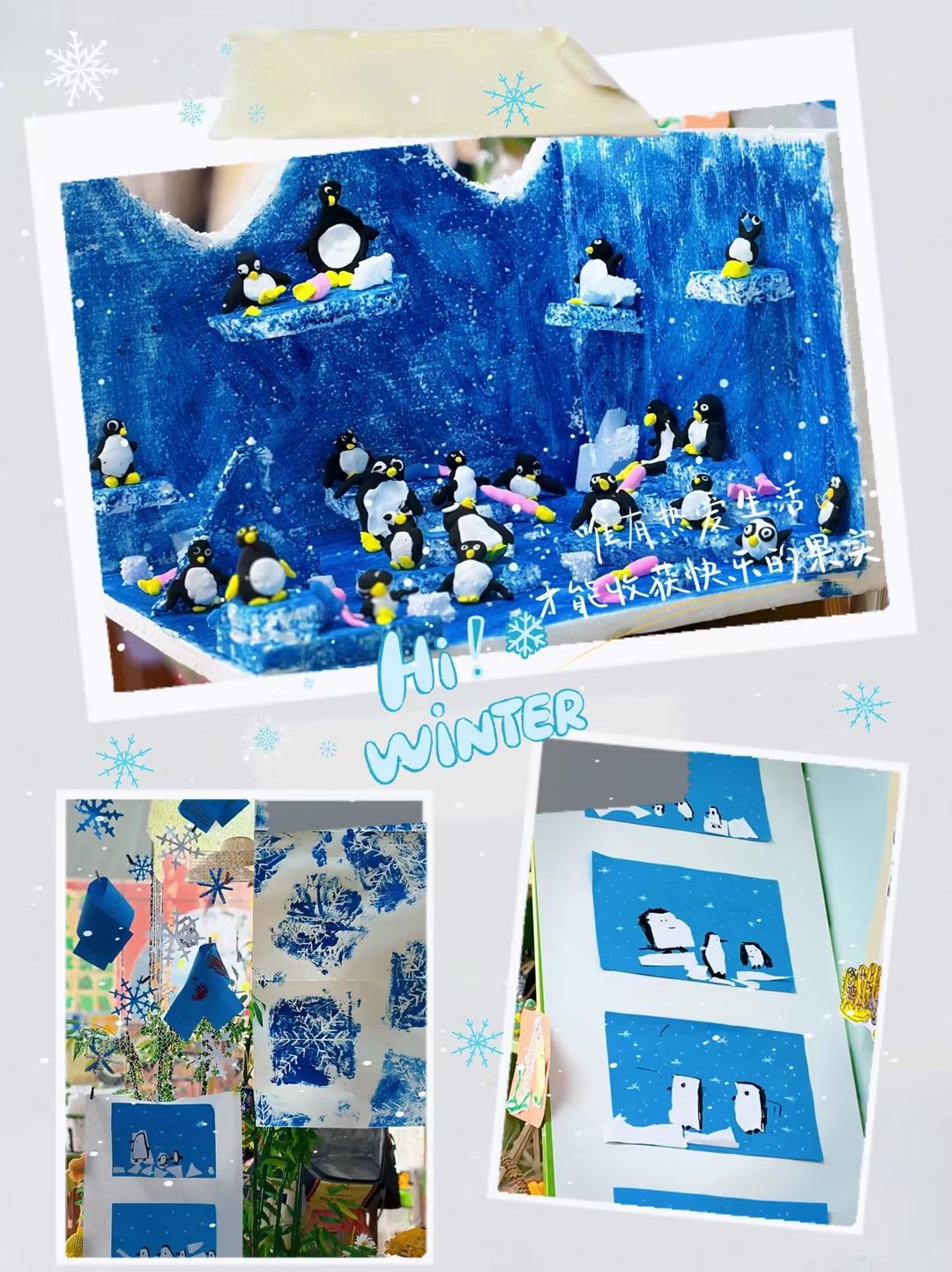 冬日的美术区里,藏着小宝贝们的冰雪童趣。超轻泥捏出的企鹅圆滚滚,披着黑白“外衣”,歪着脑袋似在打量冬日;拓印的雪花片片灵动,在纸上绽出晶莹的六角纹路;手工企鹅创意满满,卡纸化身它们的身体,每一件作品都盛满了宝贝们对冬天的浪漫想象。