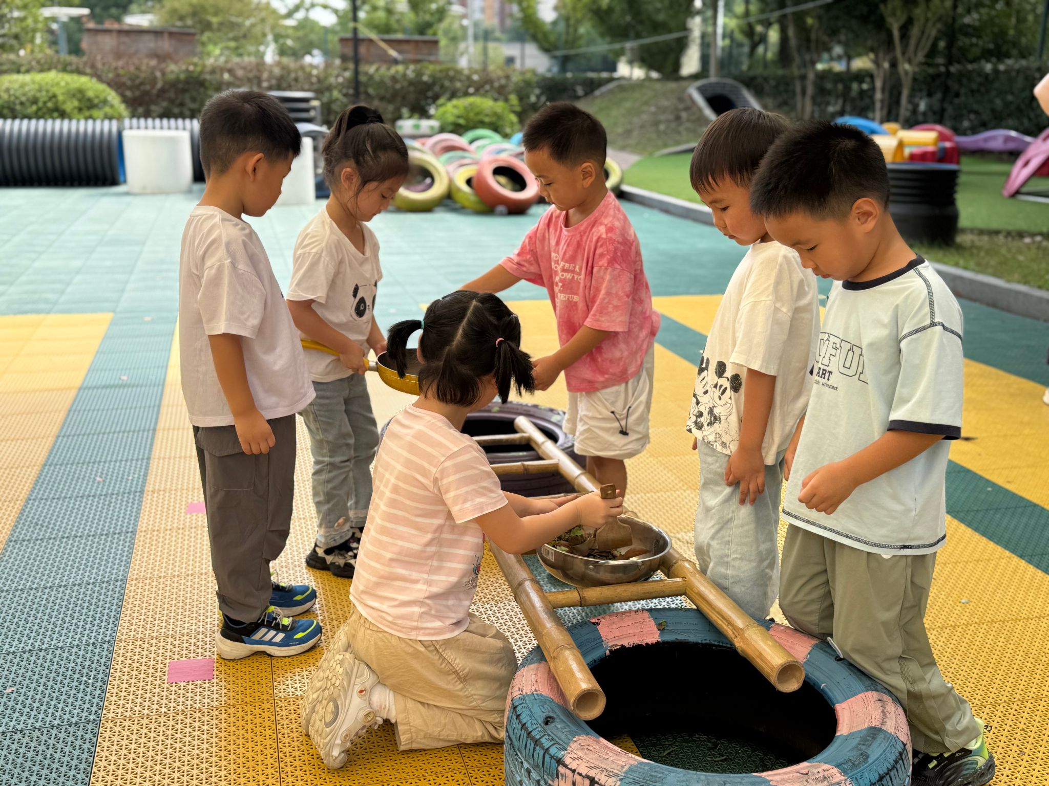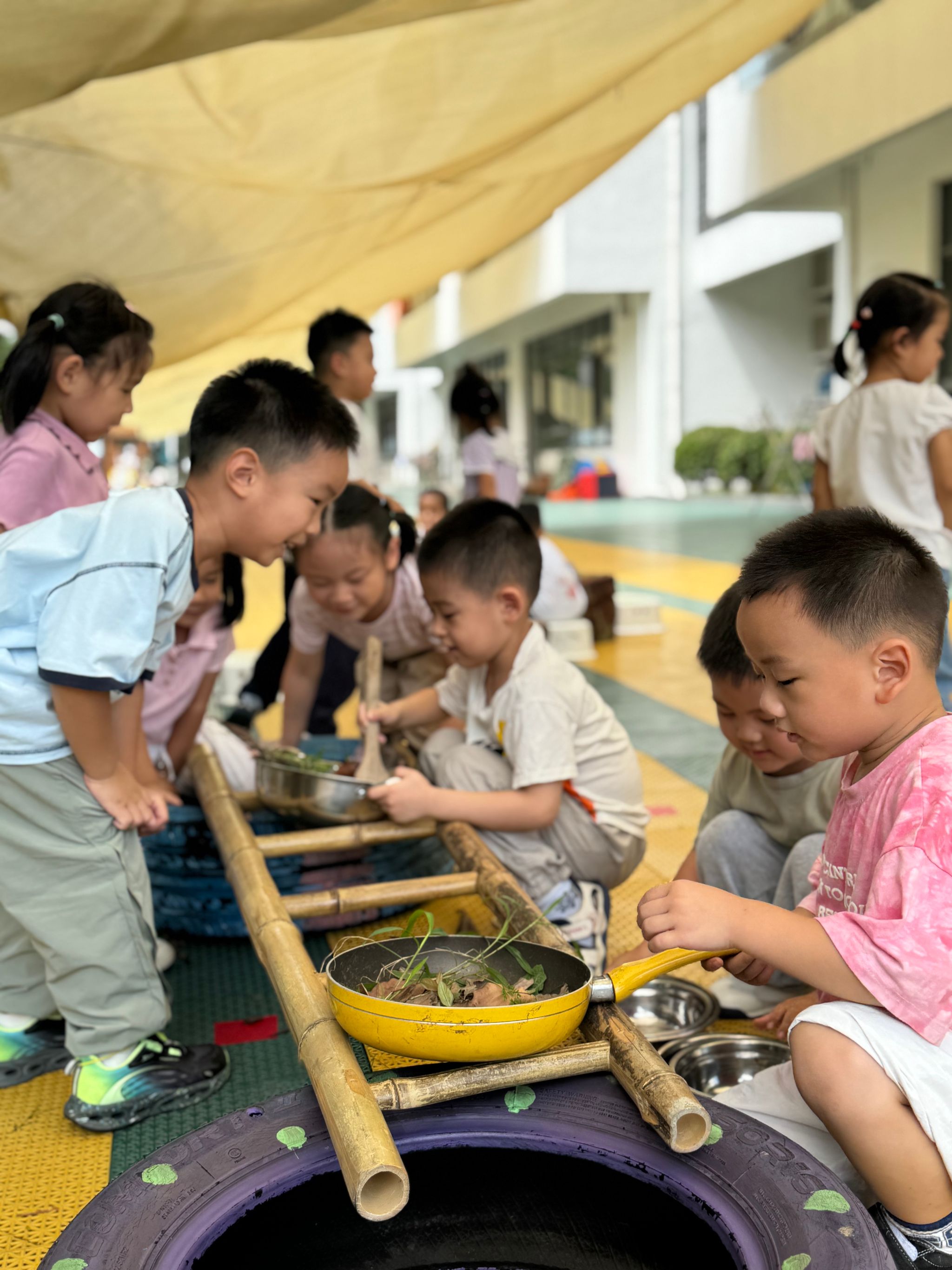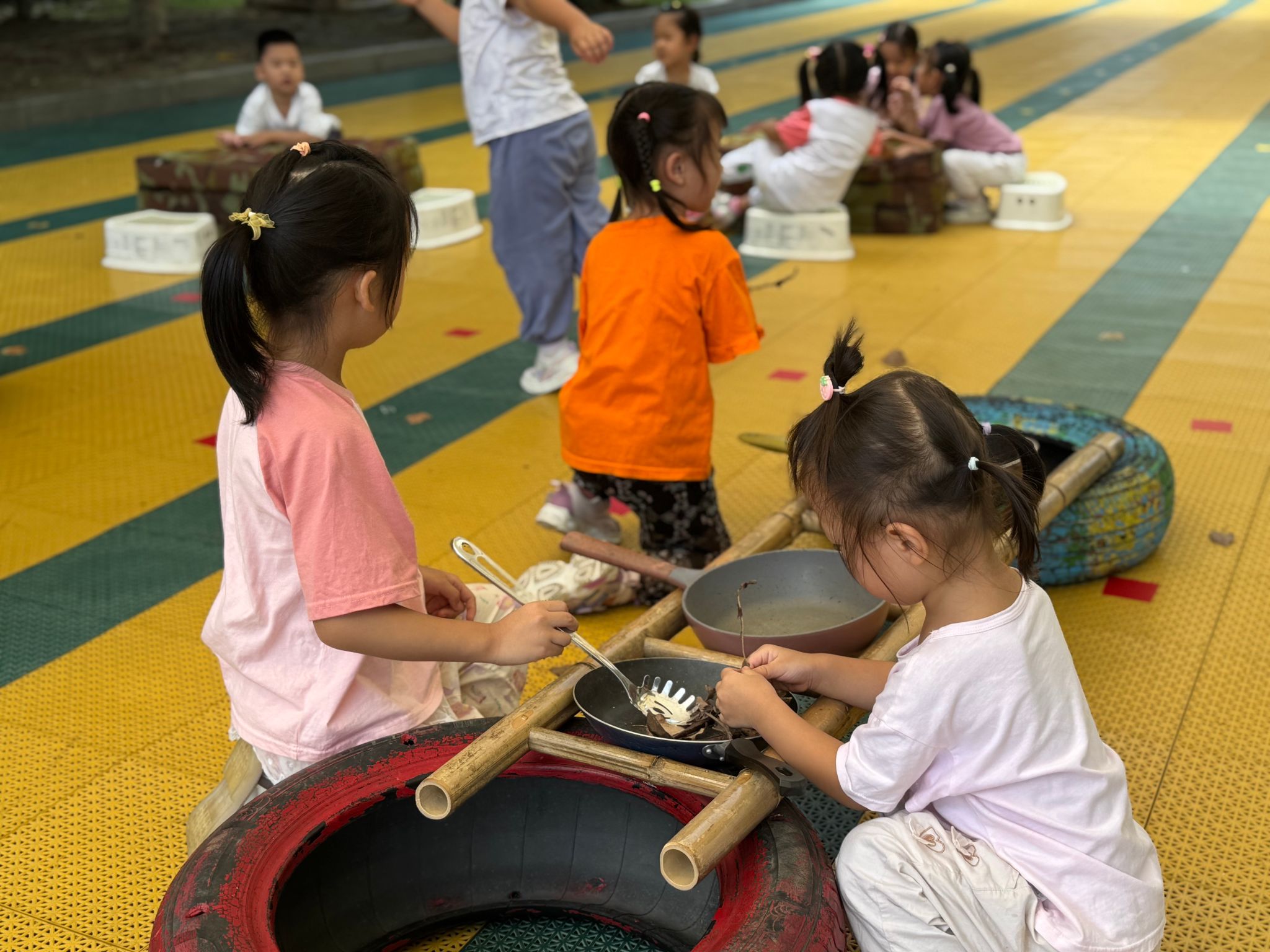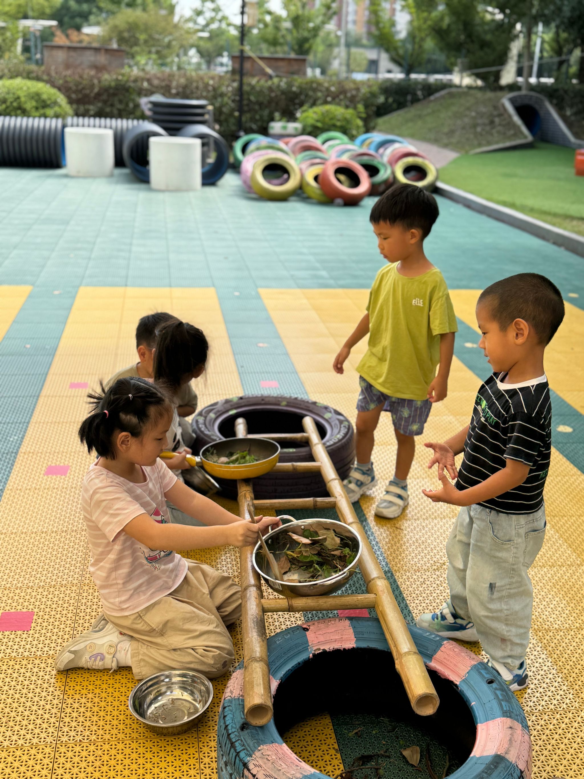 在户外的游戏场地里,一群幼儿正沉浸在自主游戏的欢乐中。她们以红色边缘的废旧轮胎为“灶台支撑”,用竹子搭建的简易架子上摆放着平底锅,孩子们手持厨具搅拌,另一个则认真地“料理”着锅中的“食材”(树枝等自然材料)。整个场景充满了幼儿天真烂漫的气息。