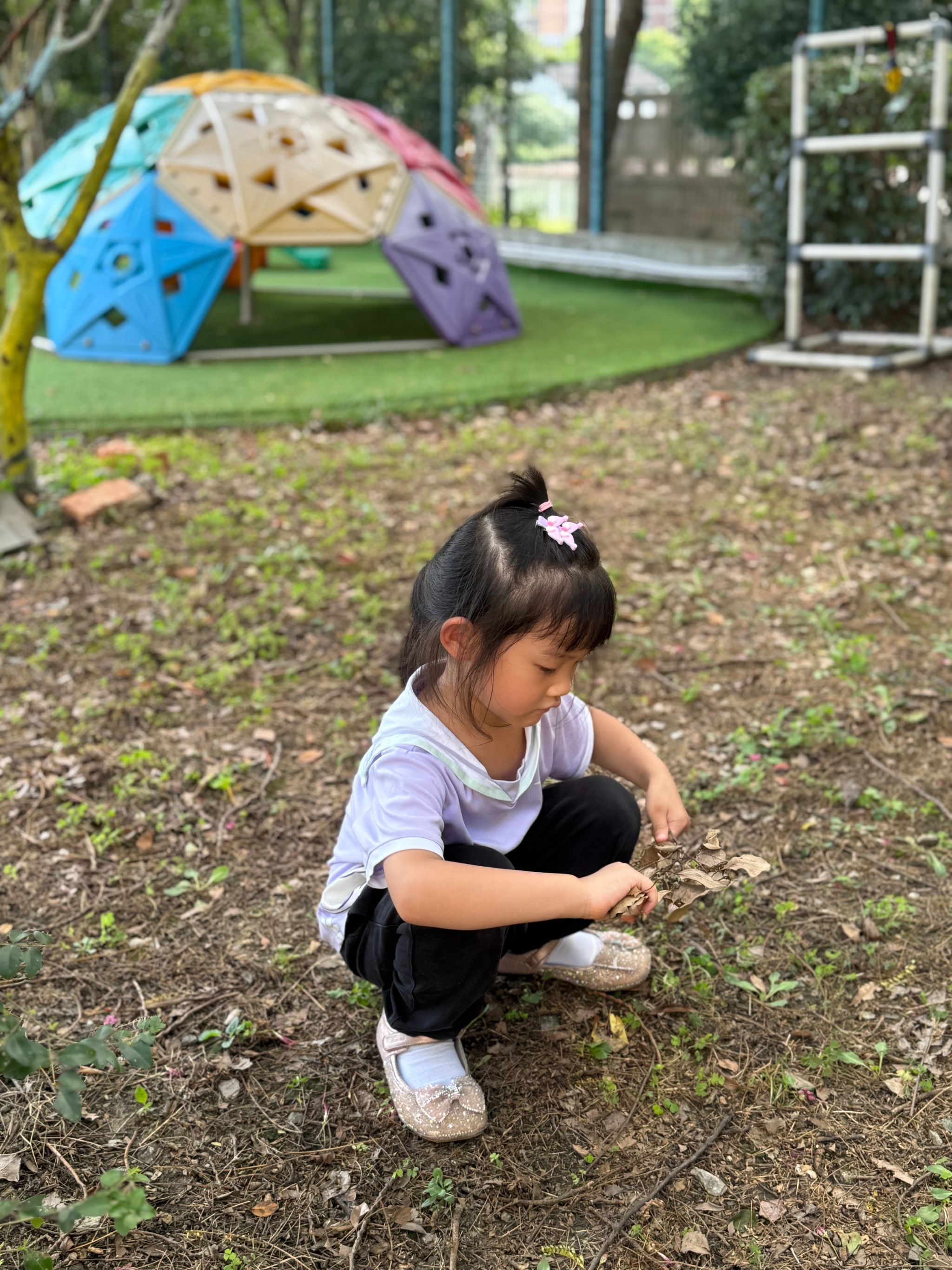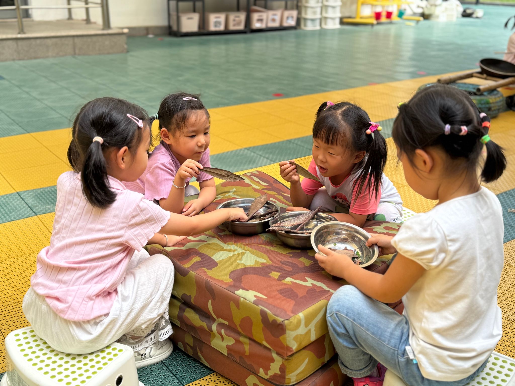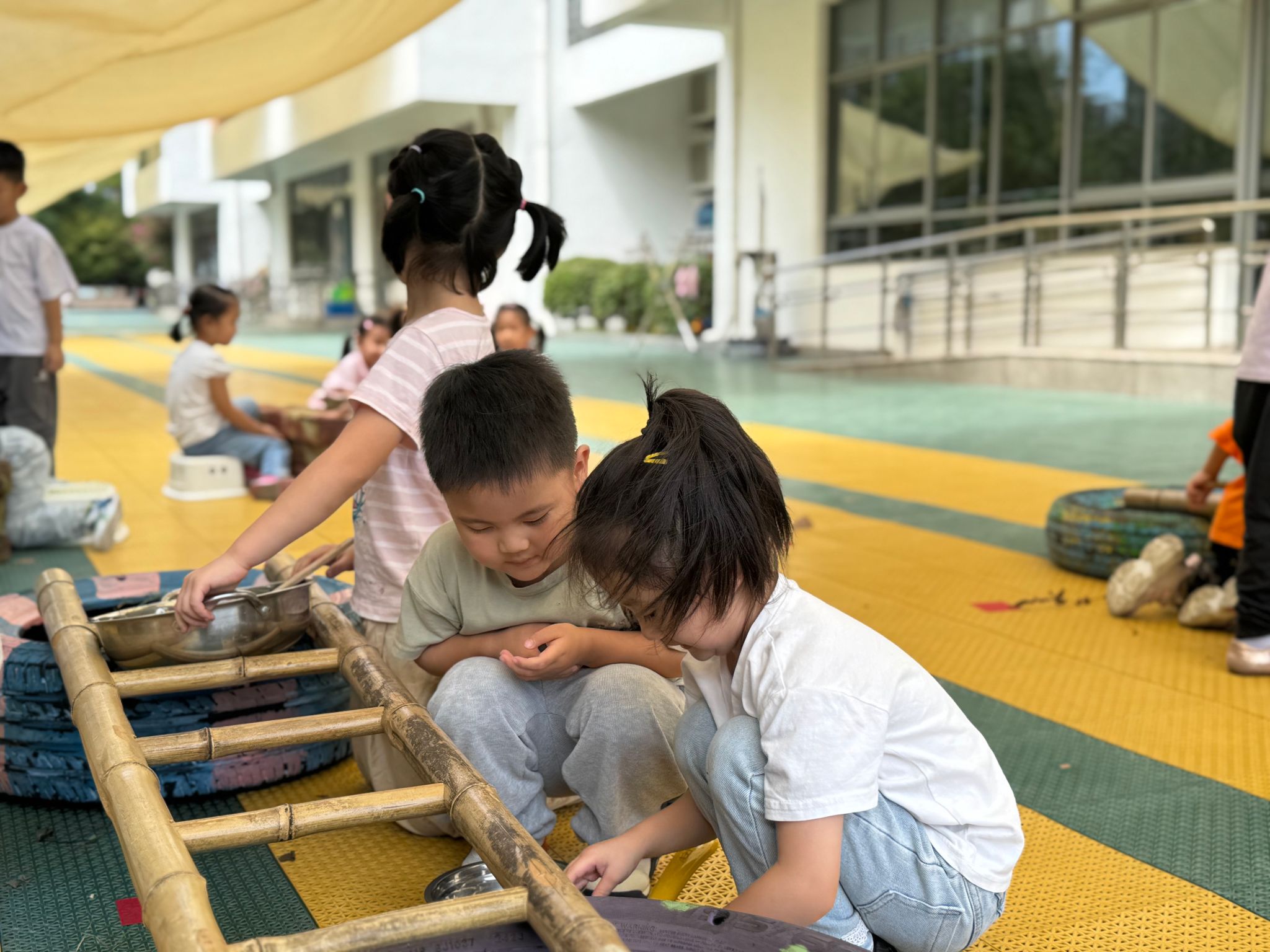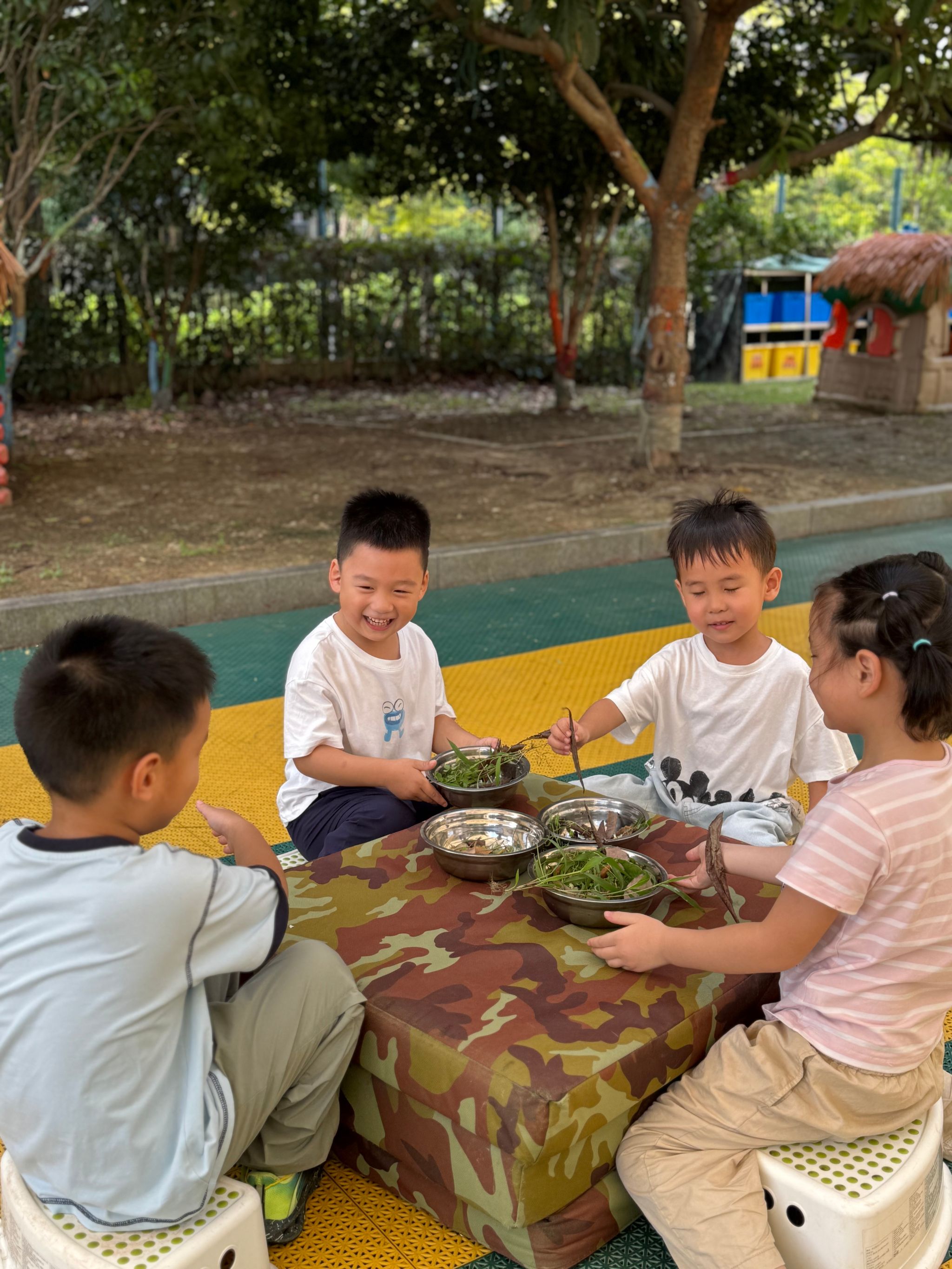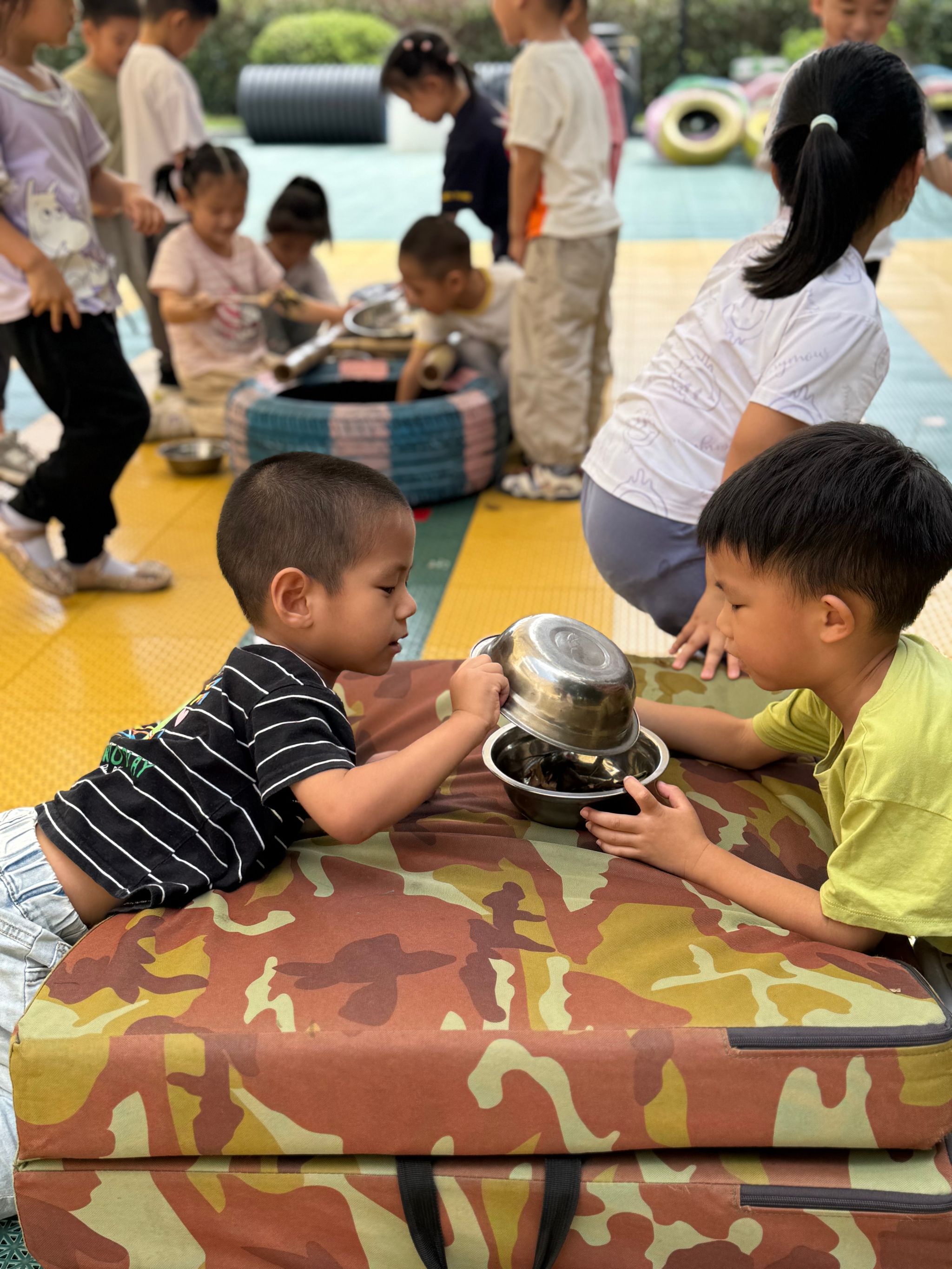 在户外的游戏场地里,一群幼儿正沉浸在自主游戏的欢乐中。她们以红色边缘的废旧轮胎为“灶台支撑”,用竹子搭建的简易架子上摆放着平底锅,孩子们手持厨具搅拌,另一个则认真地“料理”着锅中的“食材”(树枝等自然材料)。整个场景充满了幼儿天真烂漫的气息。