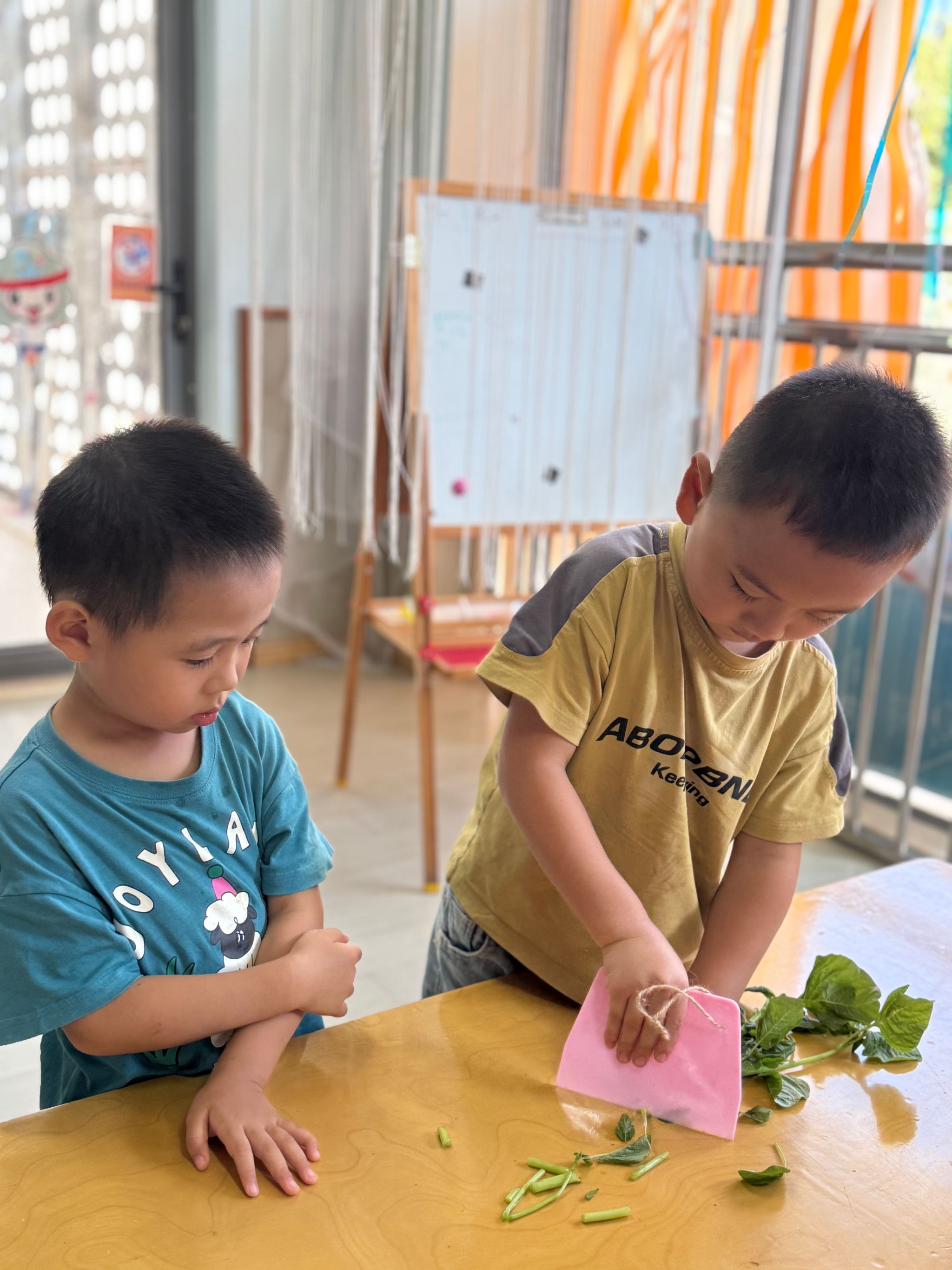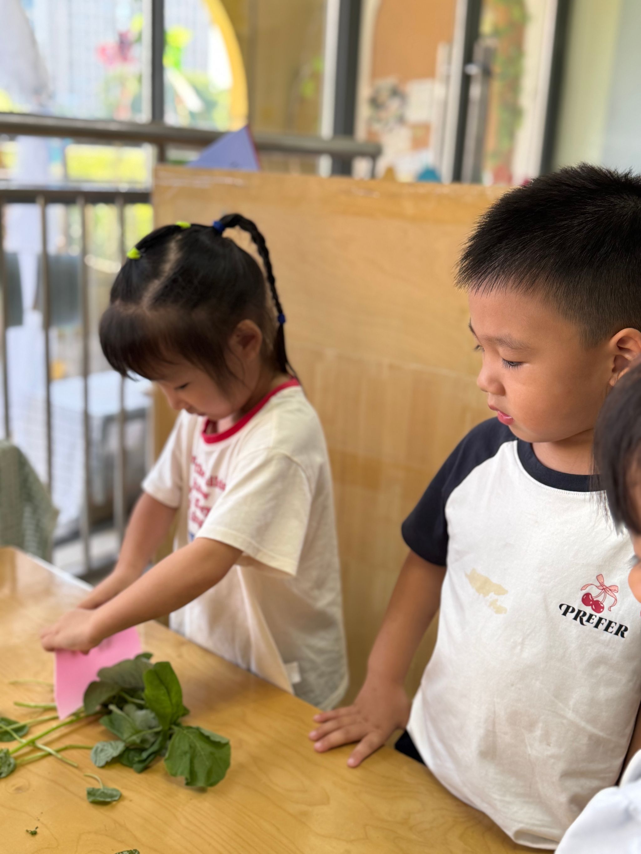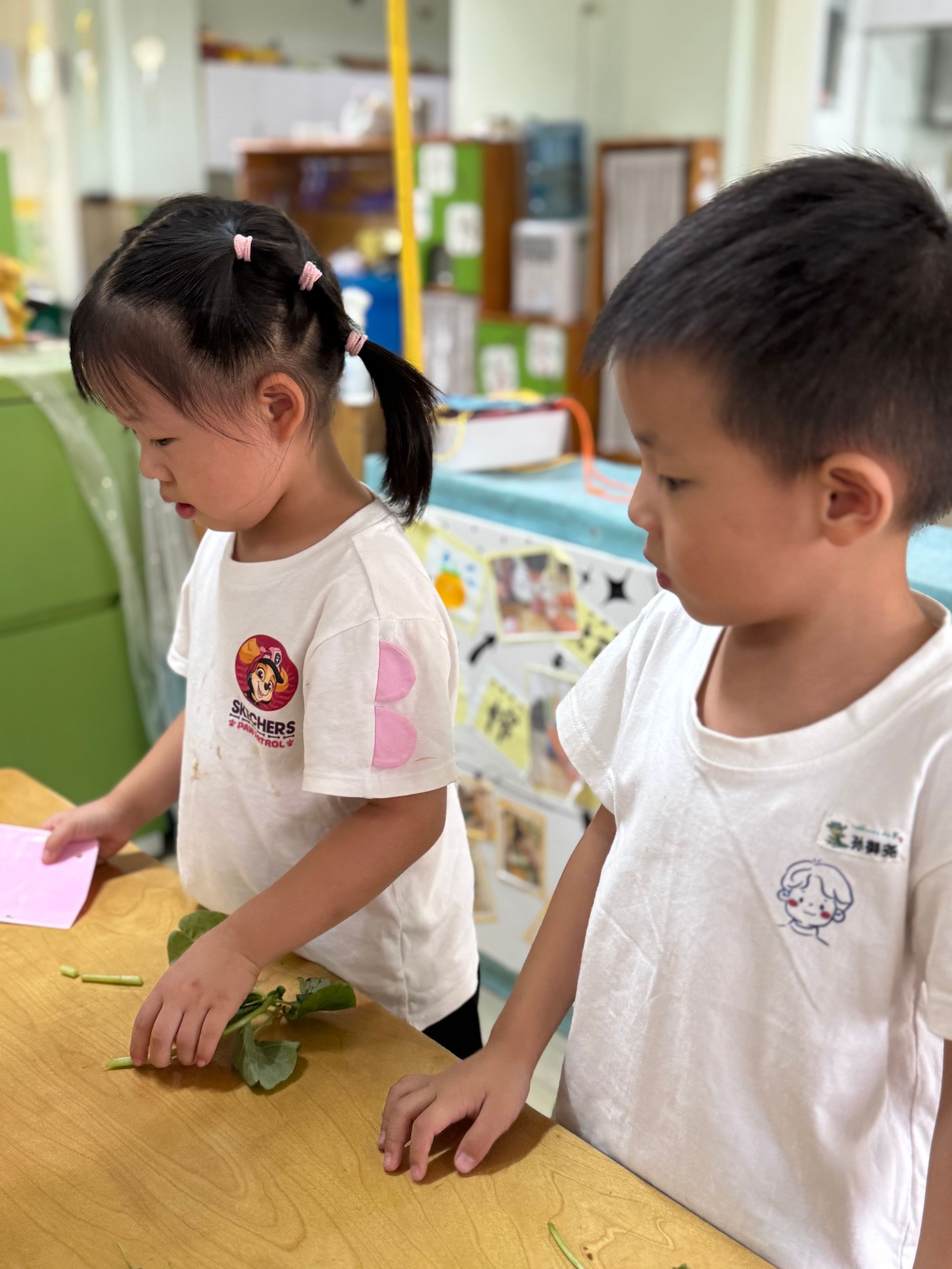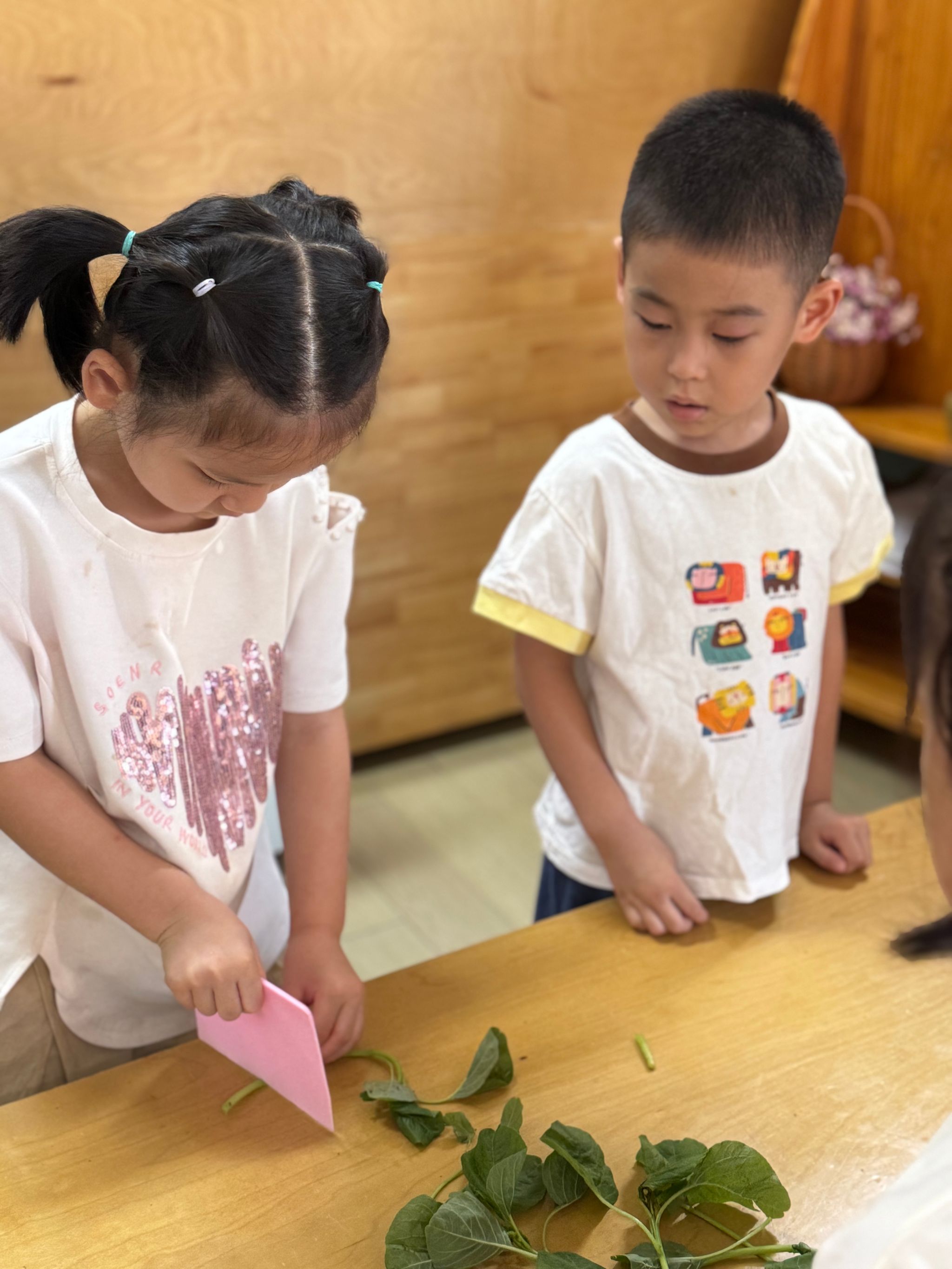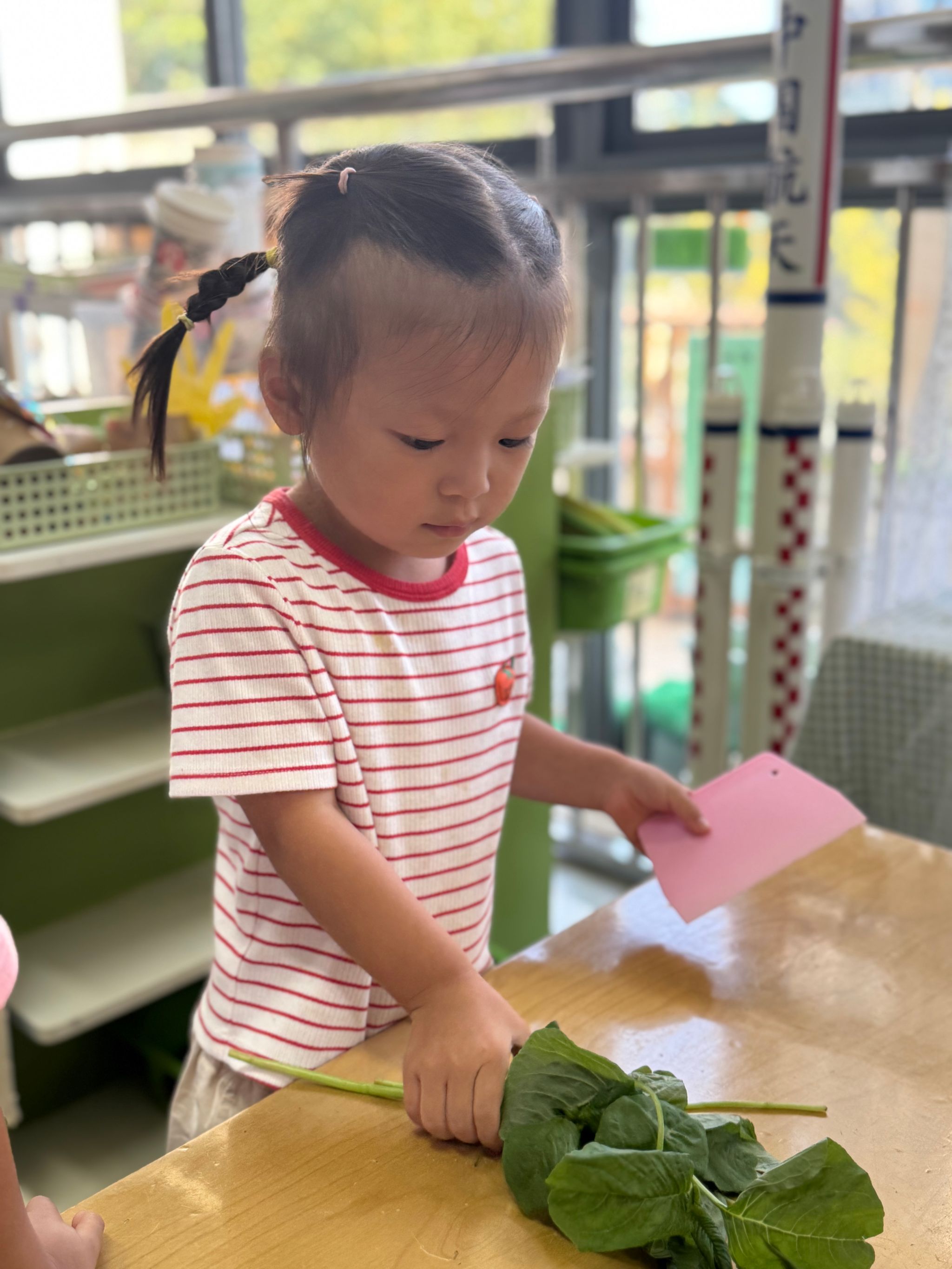 今天带孩子们认识了一种美味蔬菜—苋菜,这是一种颜色比较特殊的蔬菜,有红色的也有绿色的,孩子们通过摸一摸、闻一闻、切一切的方式,加深了对蔬菜的印象。