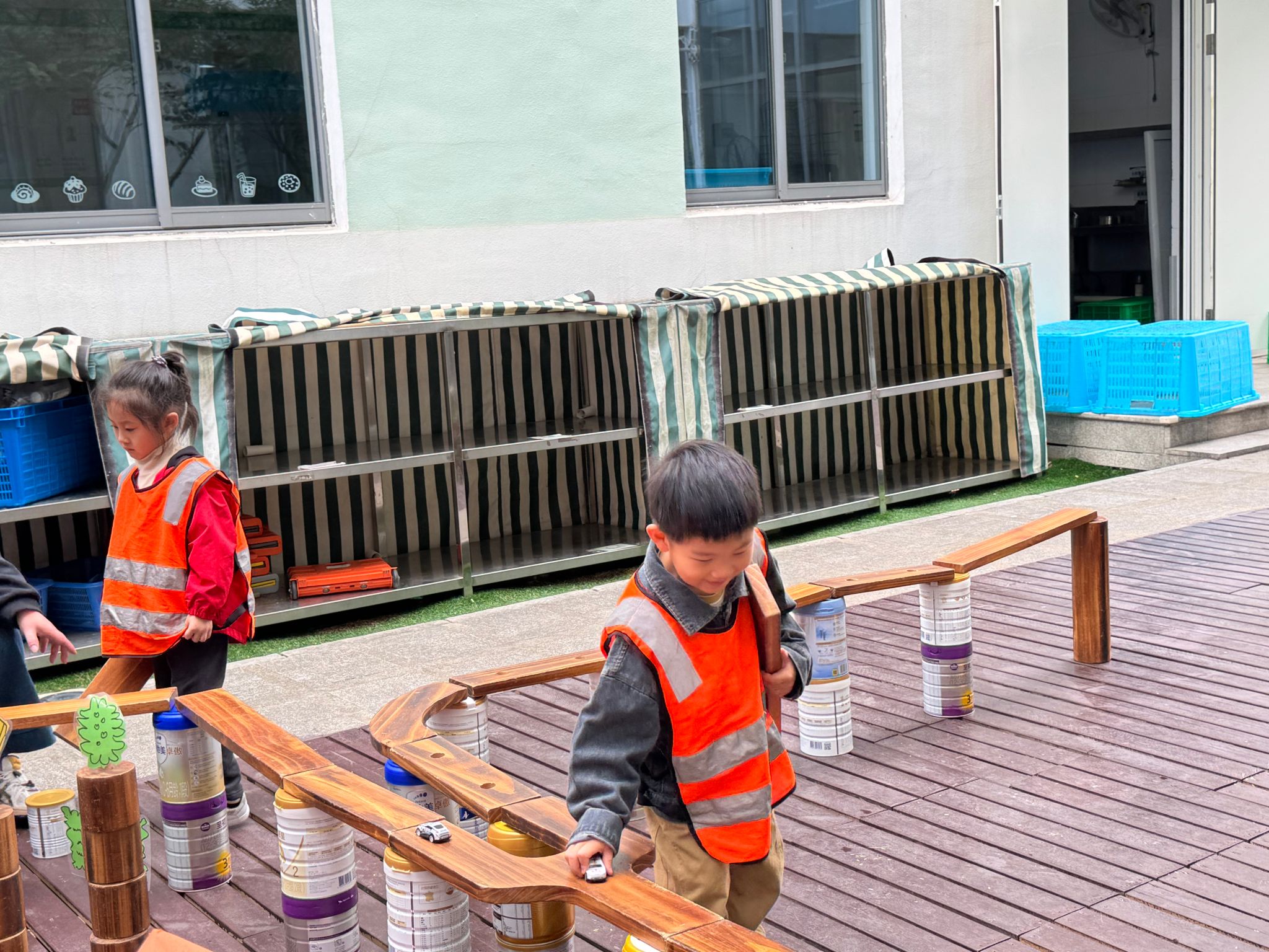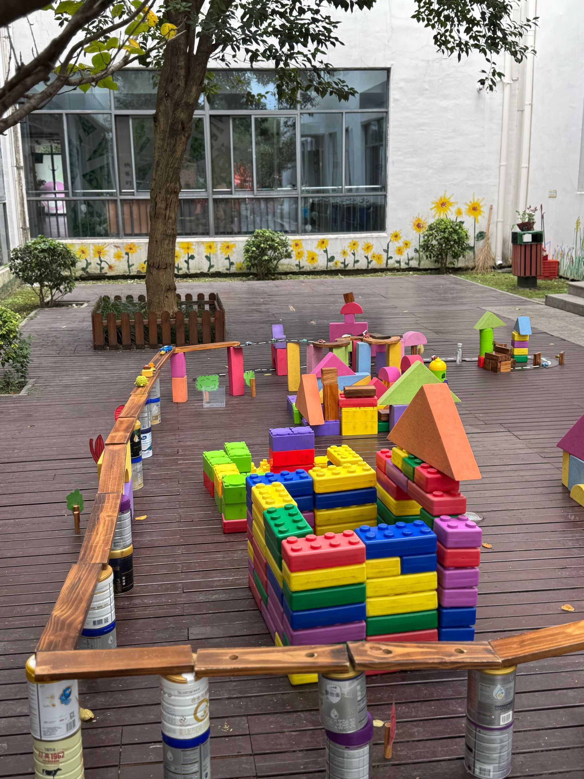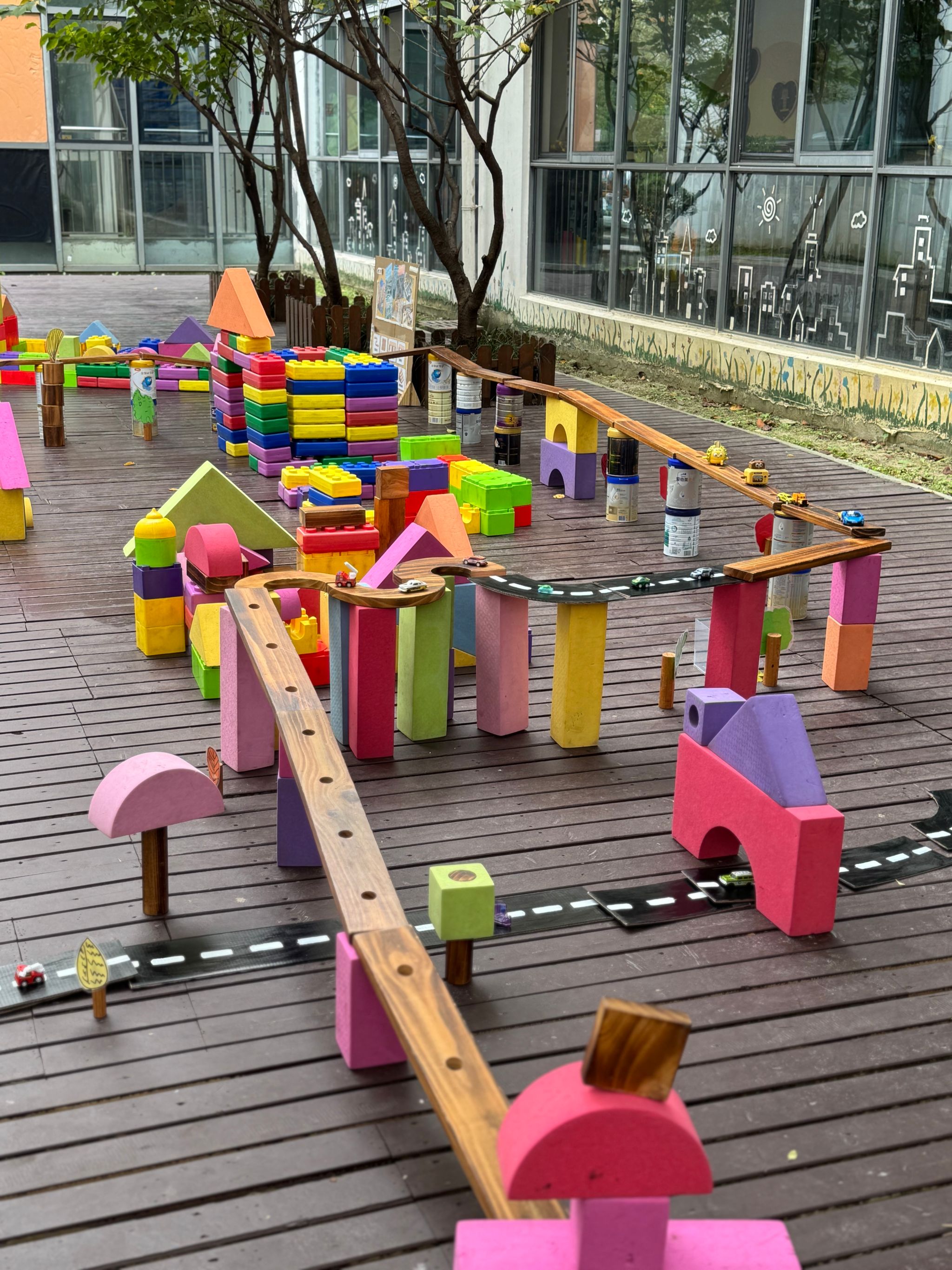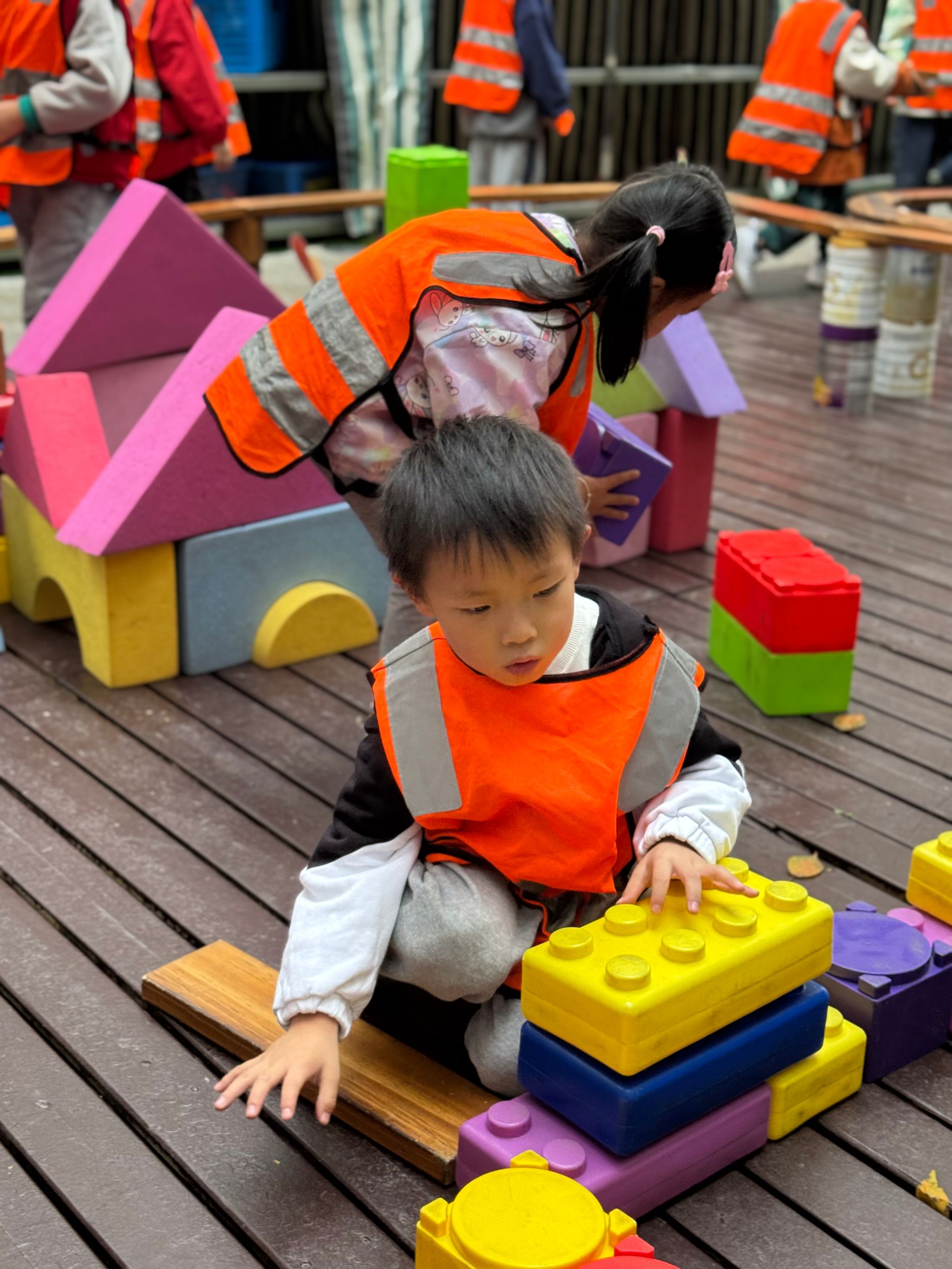 本次户外自主建构活动中,幼儿以“搭建高架”为主题,充分发挥想象力与动手能力,在合作探索中完成了充满创意的建构作品。活动前,幼儿围绕高架的形态、功能展开讨论,分享对高架的已有认知;活动中,大家分工协作,有的搬运积木、有的规划路线、有的搭建桥墩,在尝试与调整中解决了“高架不稳”“坡度太陡”等问题。