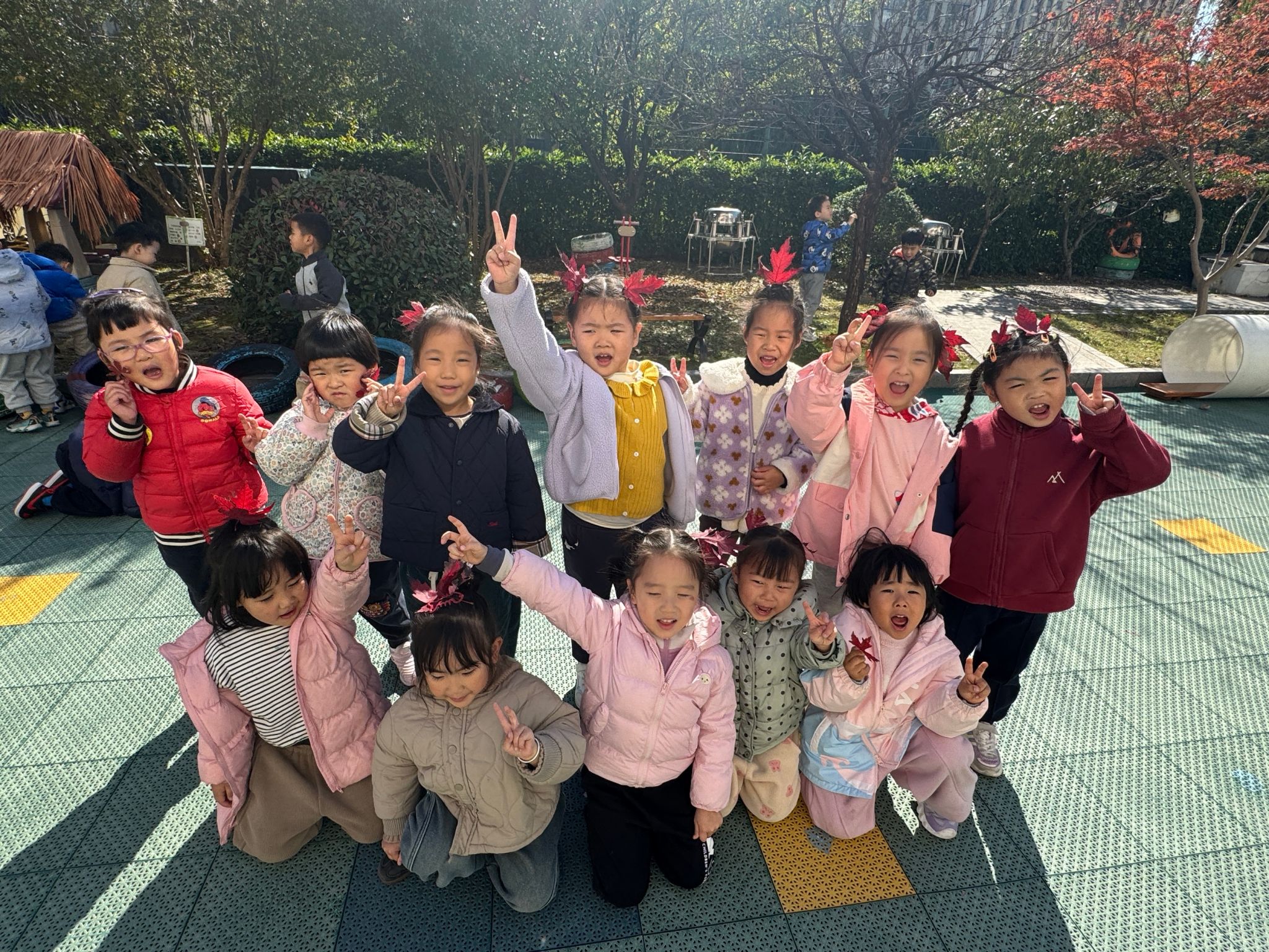 午后散步时间,一起来看看我们中五班的🍁王后们吧!树叶国王们都在后面轮胎上晒鞋晒背玩耍~