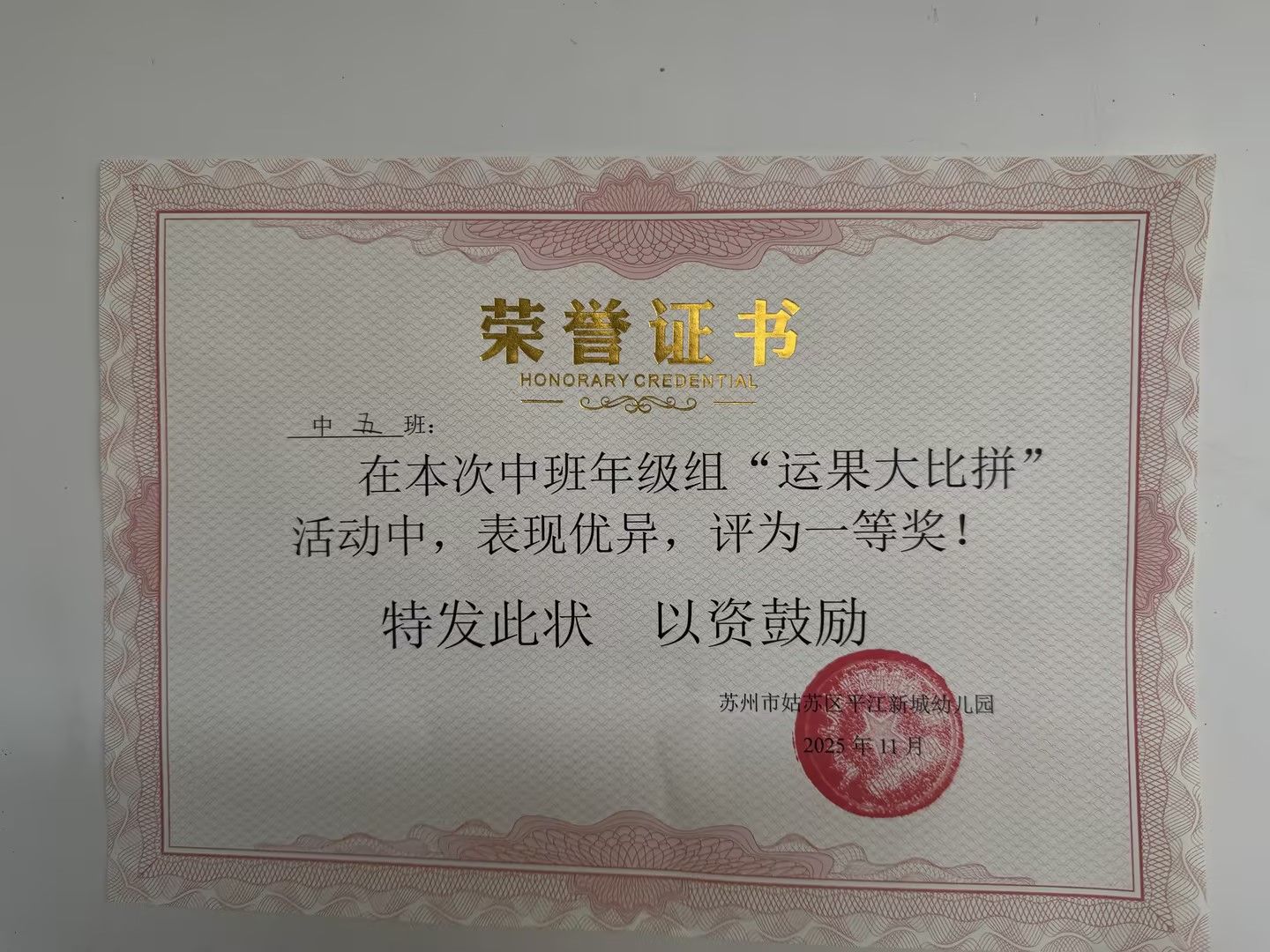 今天我们进行了中班年级“运果子”活动,每一位小朋友们平时练习都很用心,功夫不负有心人,我们中五班获得“一等奖”的荣耀!