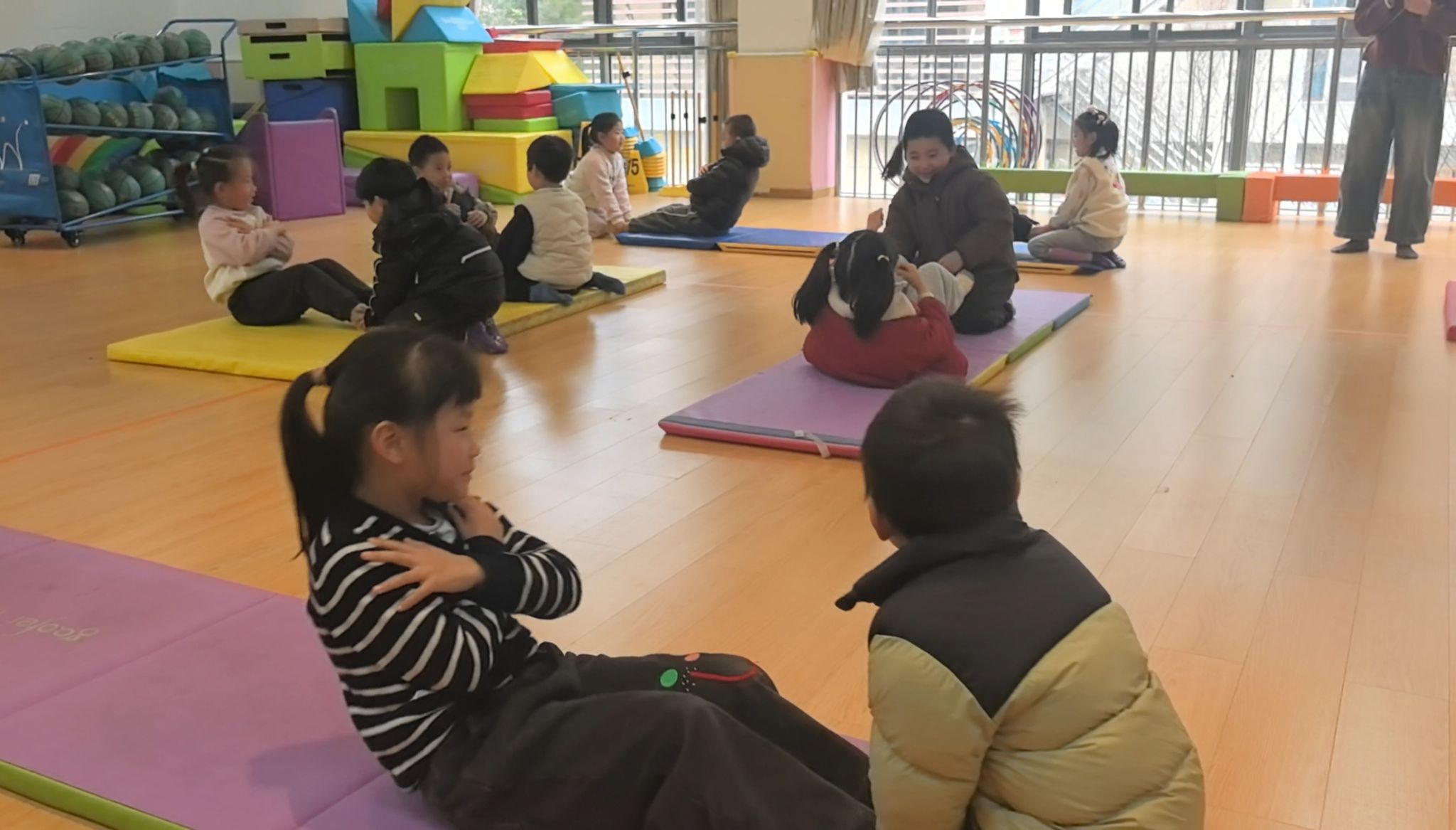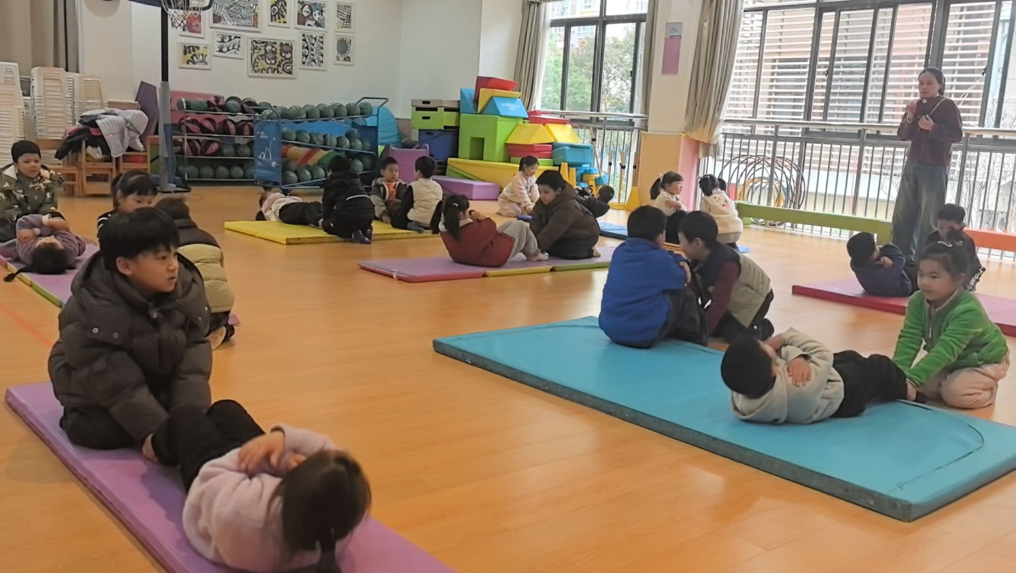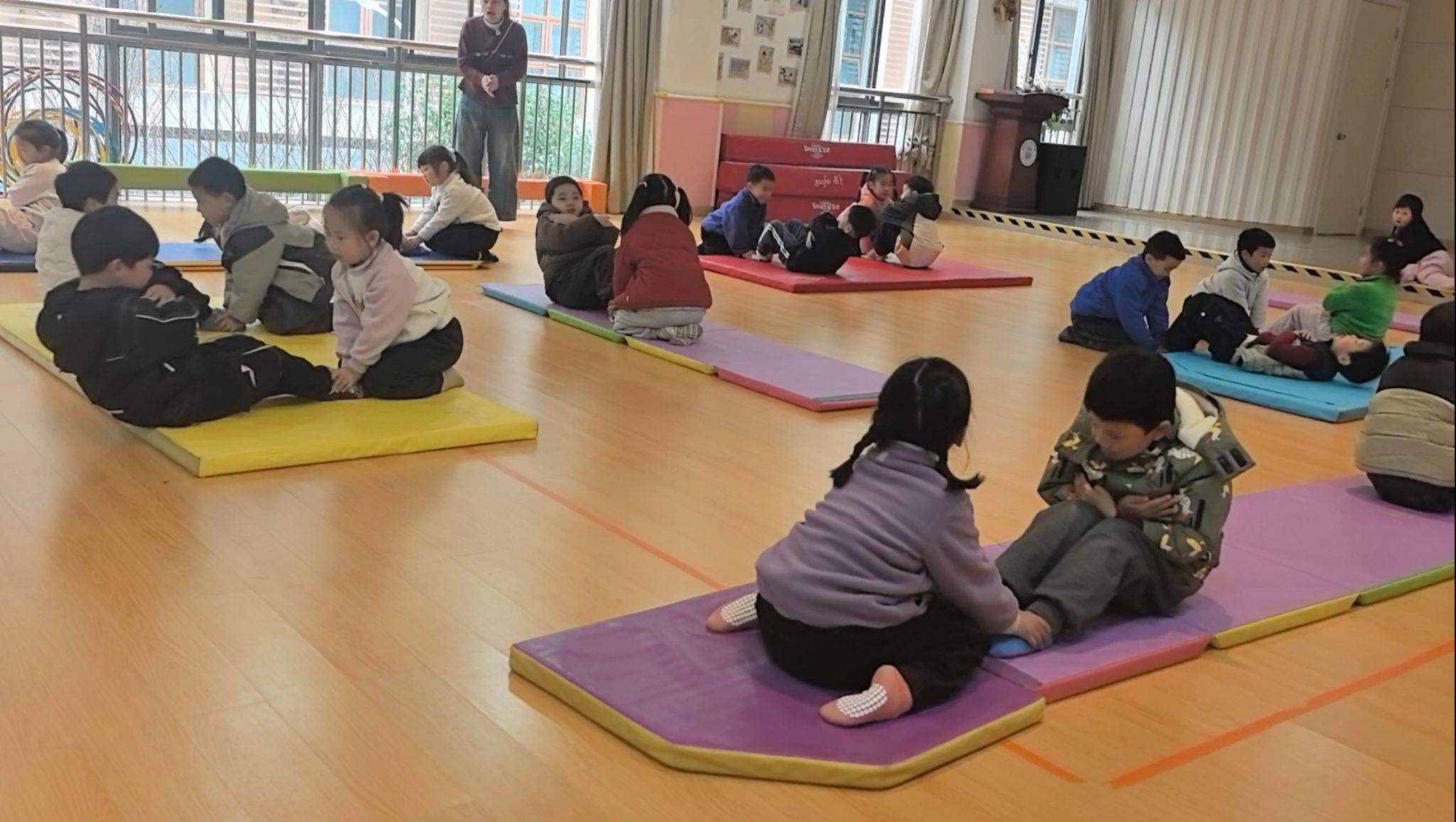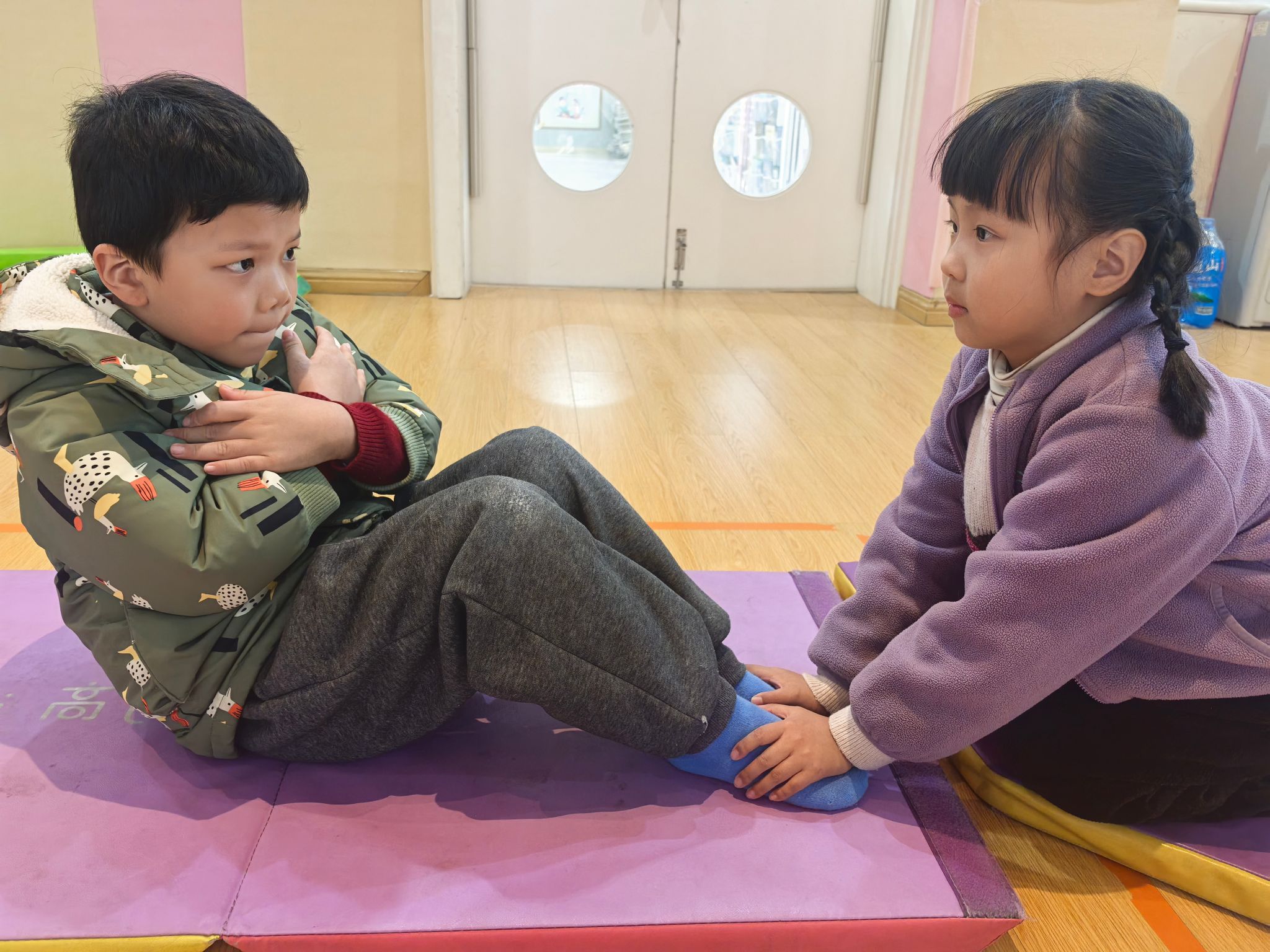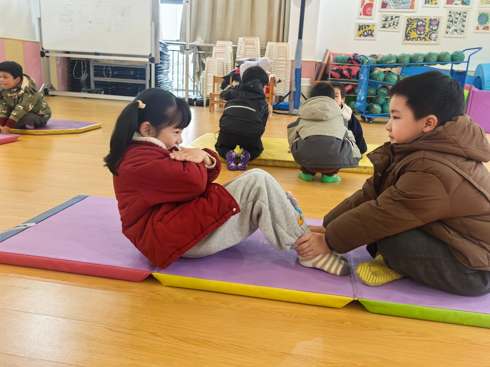 垫子上,孩子们正在进行有趣的“双手抱胸仰卧起坐”挑战。只见他们一个个平躺下来,小手紧紧交叉抱在胸前,小脸写满了认真。“预备——开始!”老师一声令下,孩子们憋足一口气,努力用腰腹的力量向上卷起身子。有的孩子一骨碌就坐了起来,露出得意的笑容;有的则用力到小脸通红,身体像小船一样来回晃动几次才成功。旁边的小伙伴自发地加油鼓劲:“加油!快起来啦!”每一次成功的坐起,都伴随着小小的欢呼。在充满游戏性的练习中,孩子们的核心力量与坚持不懈的品质,正悄然增长。