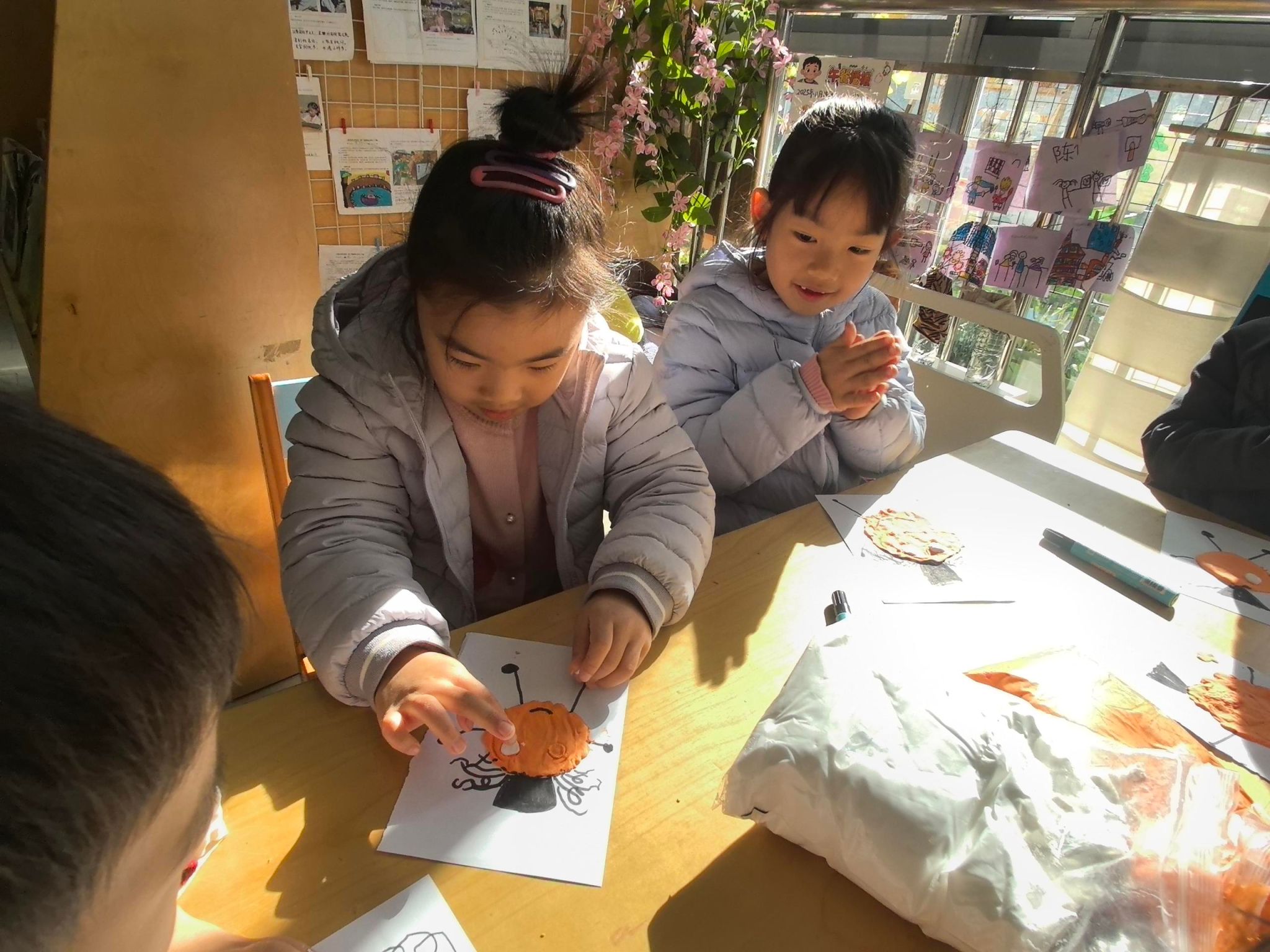活动室里,孩子们正专注地创作自己的“南瓜画”。他们首先选取橘色的轻黏土,放在手心认真地揉、搓、压扁,再将扁圆的黏土仔细粘贴在画纸上,一个个立体的“小南瓜”便初具雏形。
