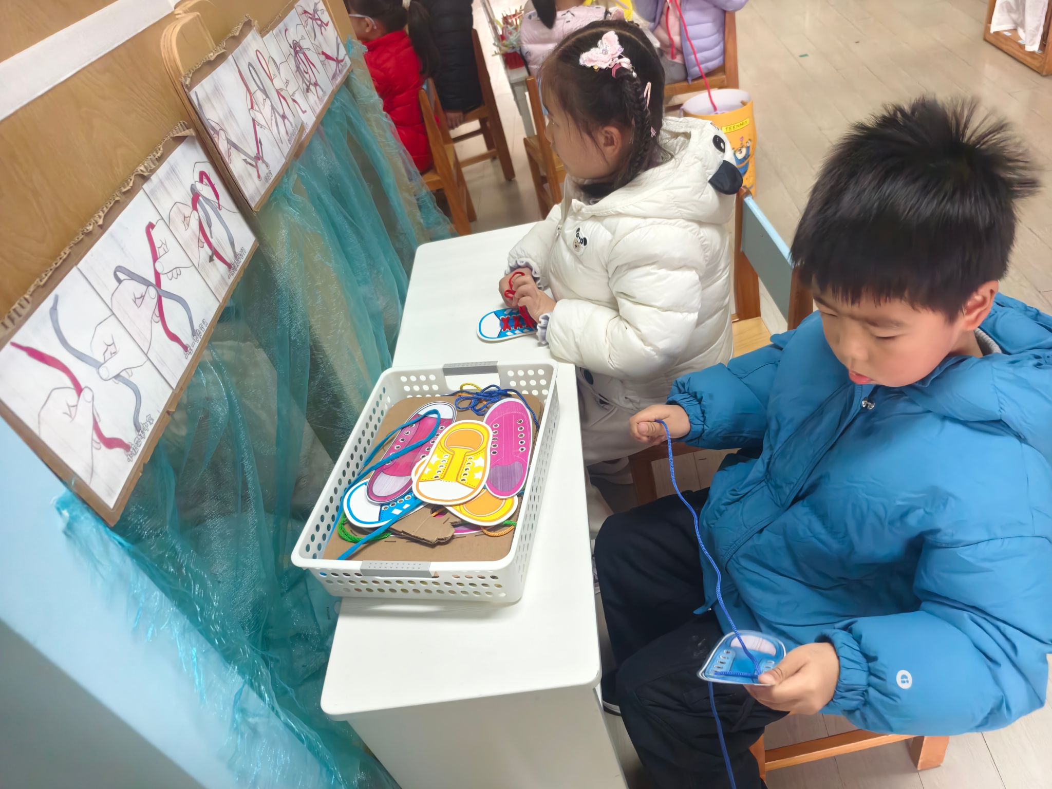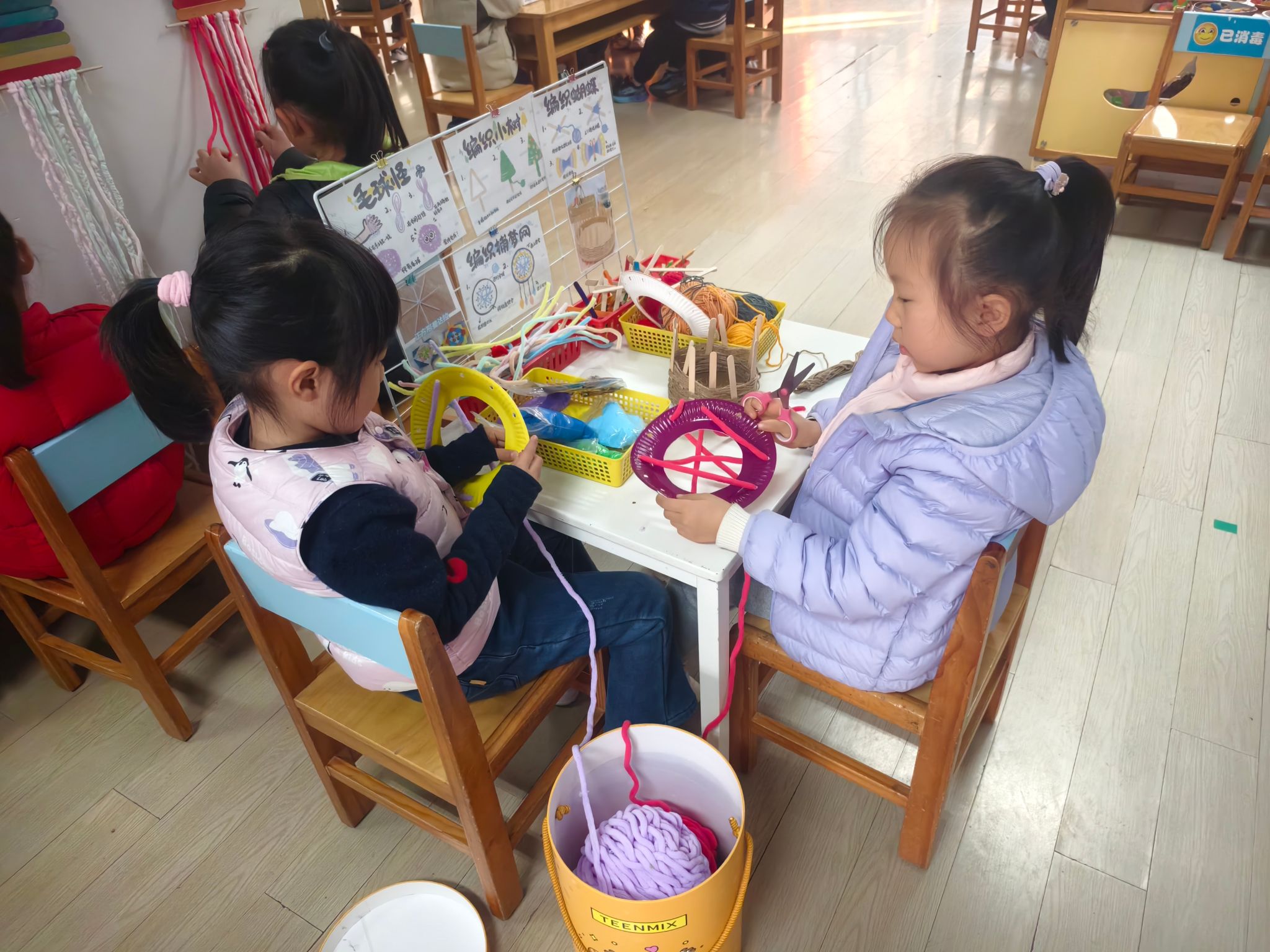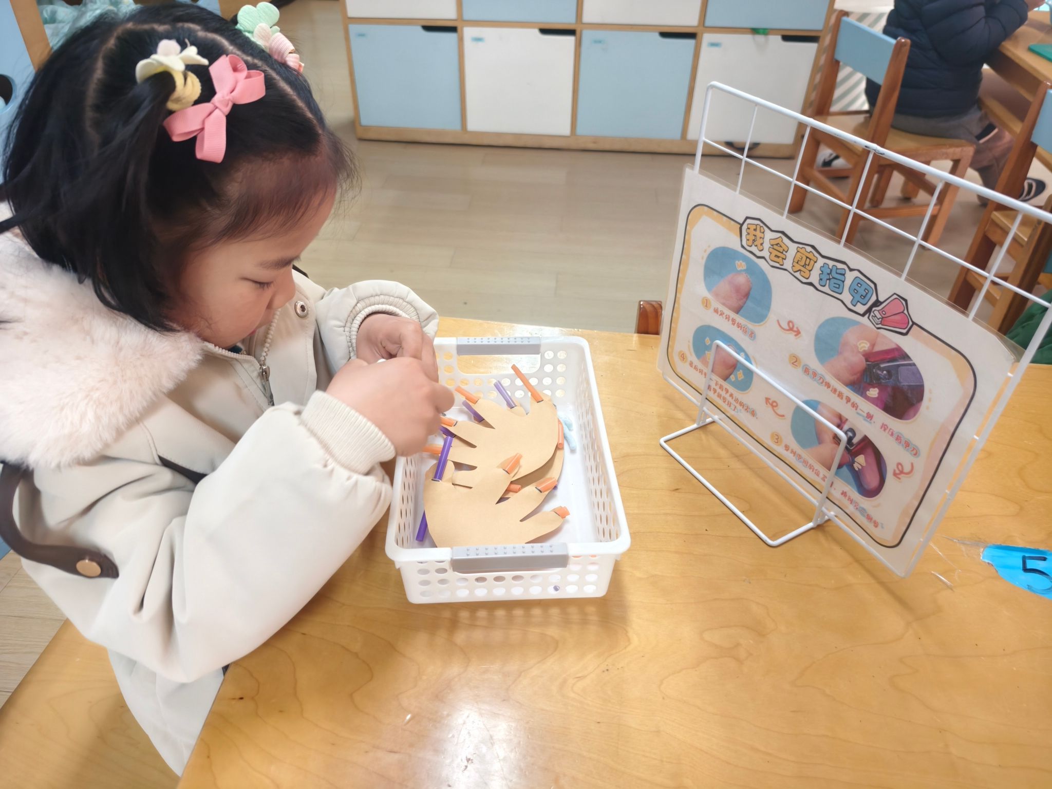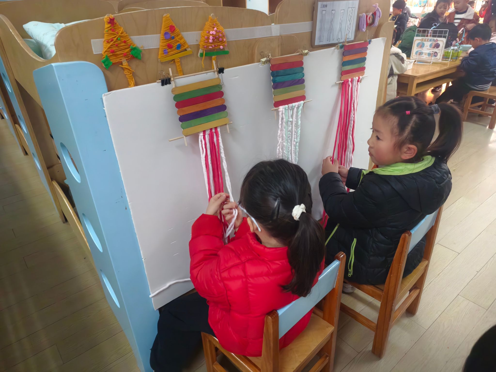区域游戏开始喽!今天我们进行的是生活区的展示,孩子们的小手真灵巧呀!有的在练习剪指甲、编辫子、系鞋带、叠被子,有的在创作动物面具、松果动物,有的在编织花篮、圣诞树、捕梦网、毛球怪,还有的在制作发饰,磨豆浆、剥大蒜、削果皮。大家忙得热火朝天!还有建构区的小建筑工人们在搭建动物园,益智区的小棋手们认真的在对决,图书馆里安静在阅读。