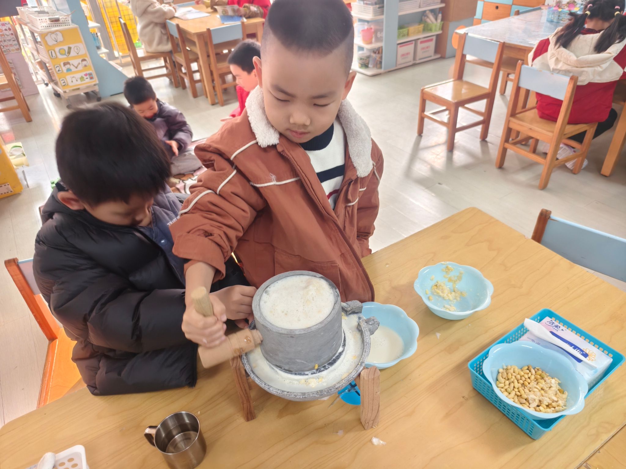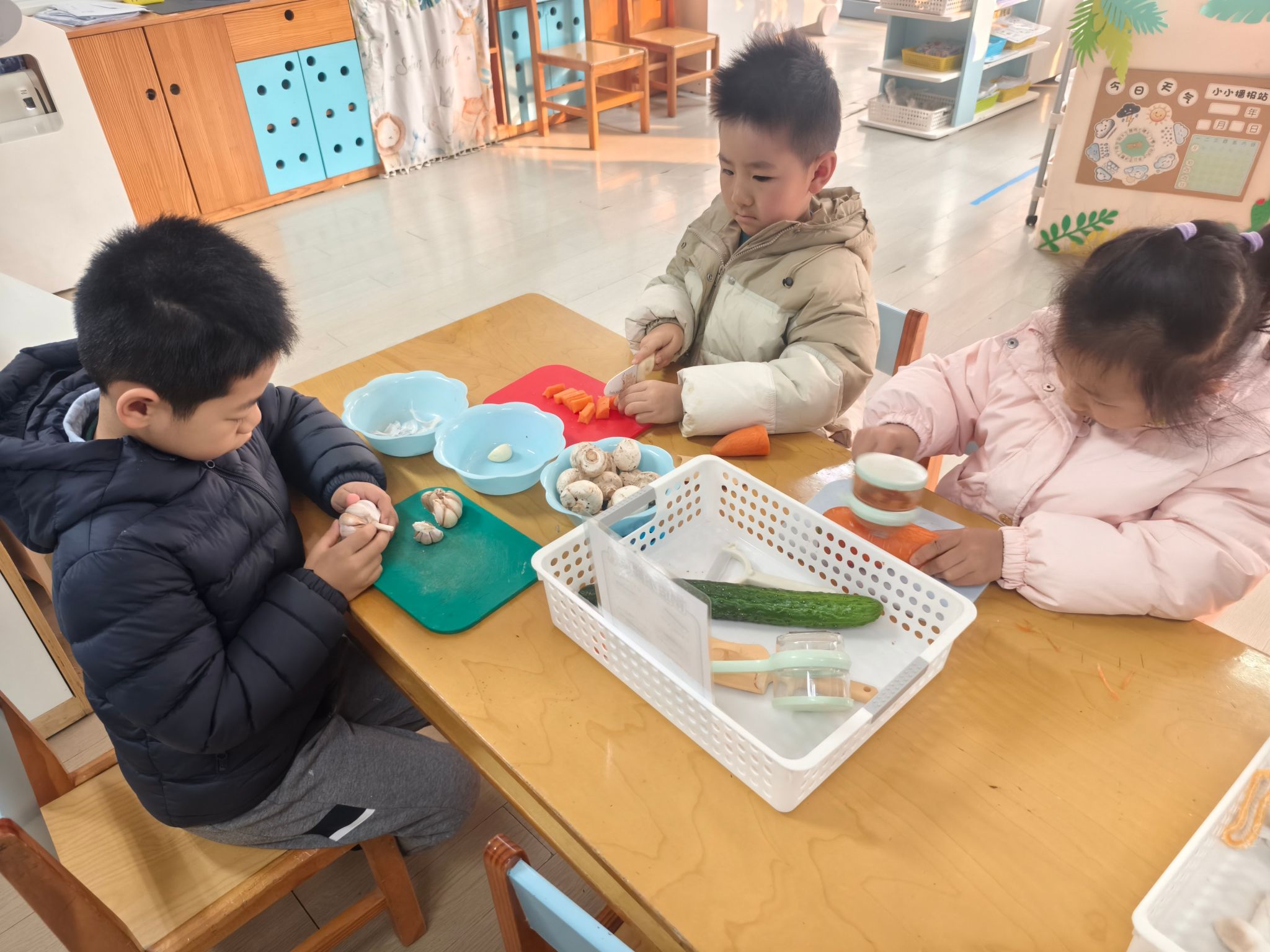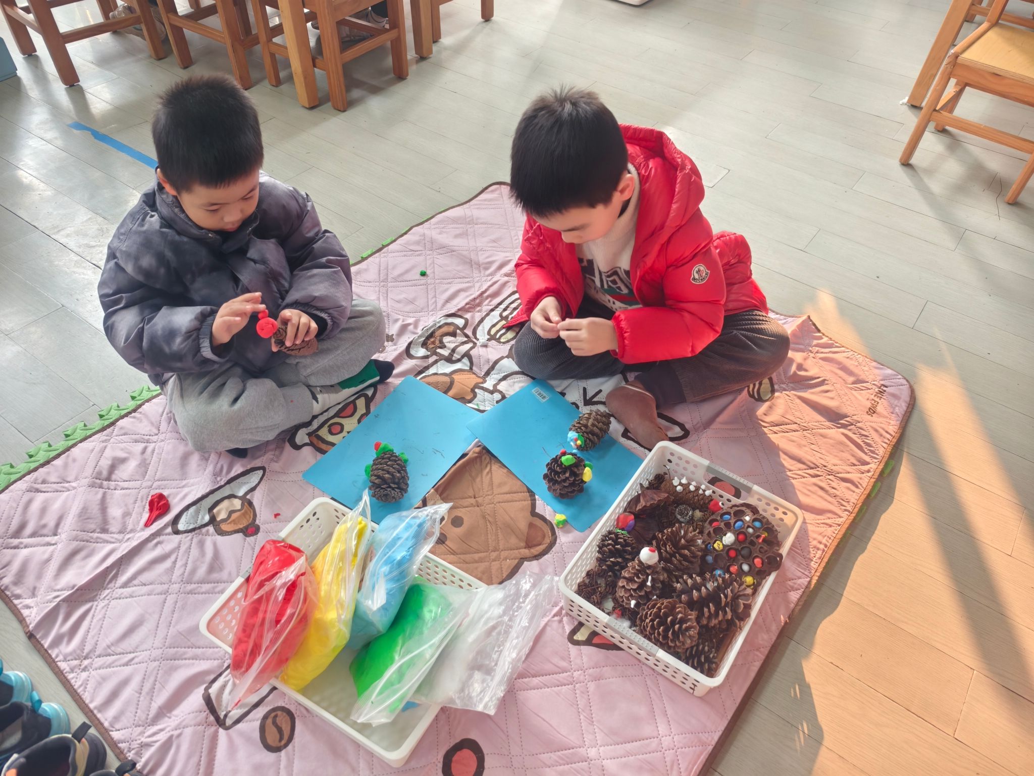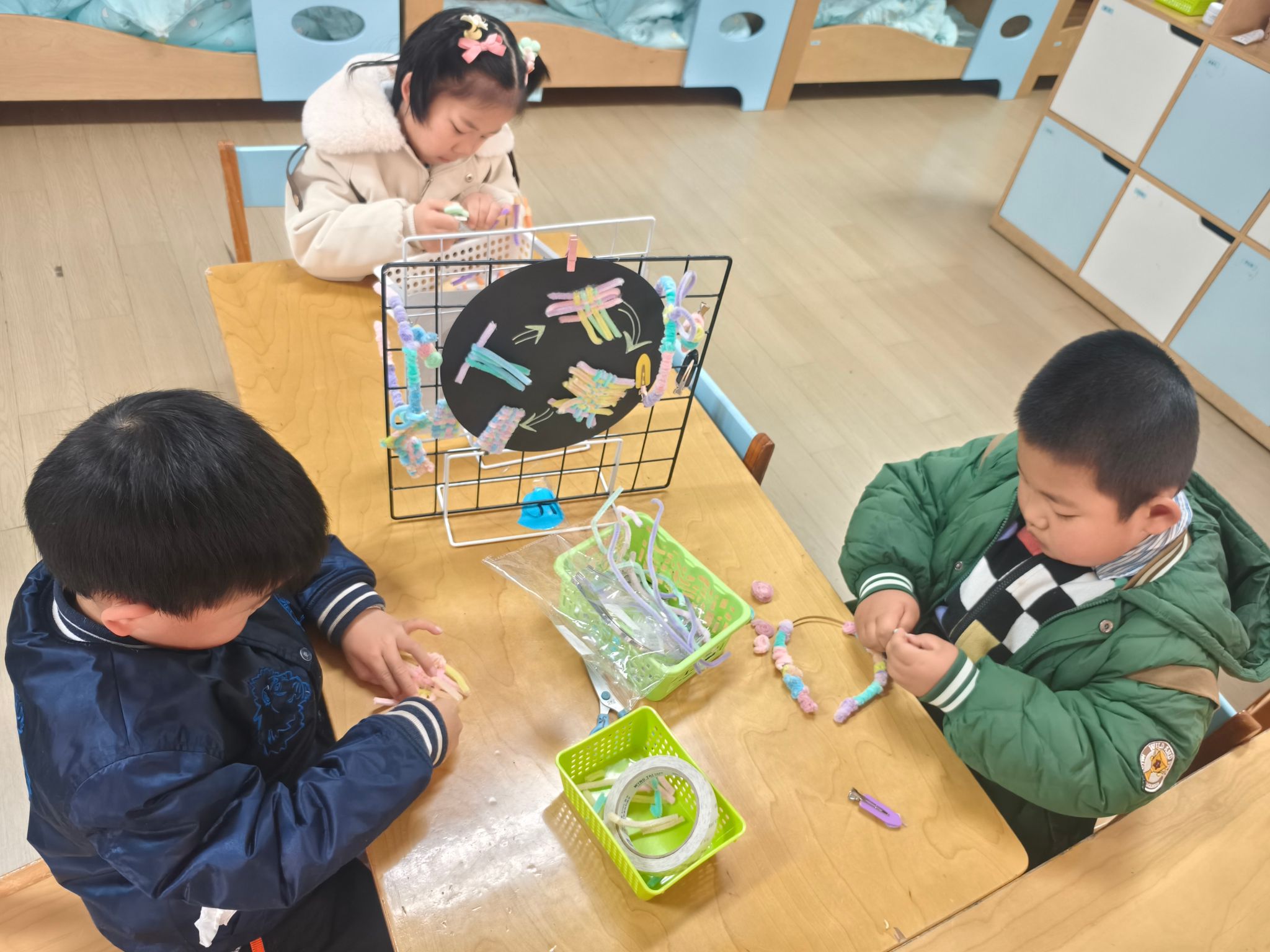 区域游戏开始喽!今天我们进行的是生活区的展示,孩子们的小手真灵巧呀!有的在练习剪指甲、编辫子、系鞋带、叠被子,有的在创作动物面具、松果动物,有的在编织花篮、圣诞树、捕梦网、毛球怪,还有的在制作发饰,磨豆浆、剥大蒜、削果皮。大家忙得热火朝天!还有建构区的小建筑工人们在搭建动物园,益智区的小棋手们认真的在对决,图书馆里安静在阅读。