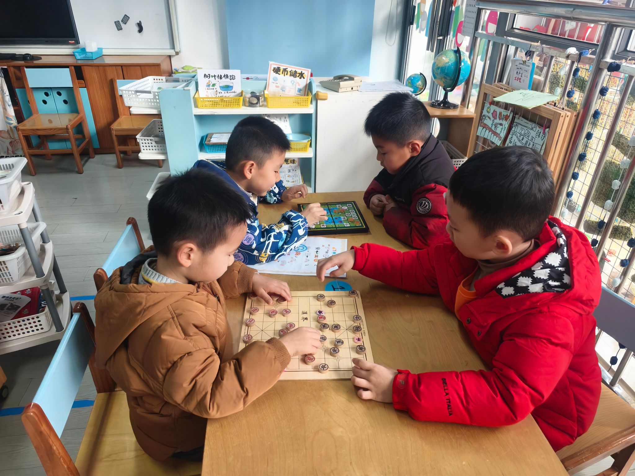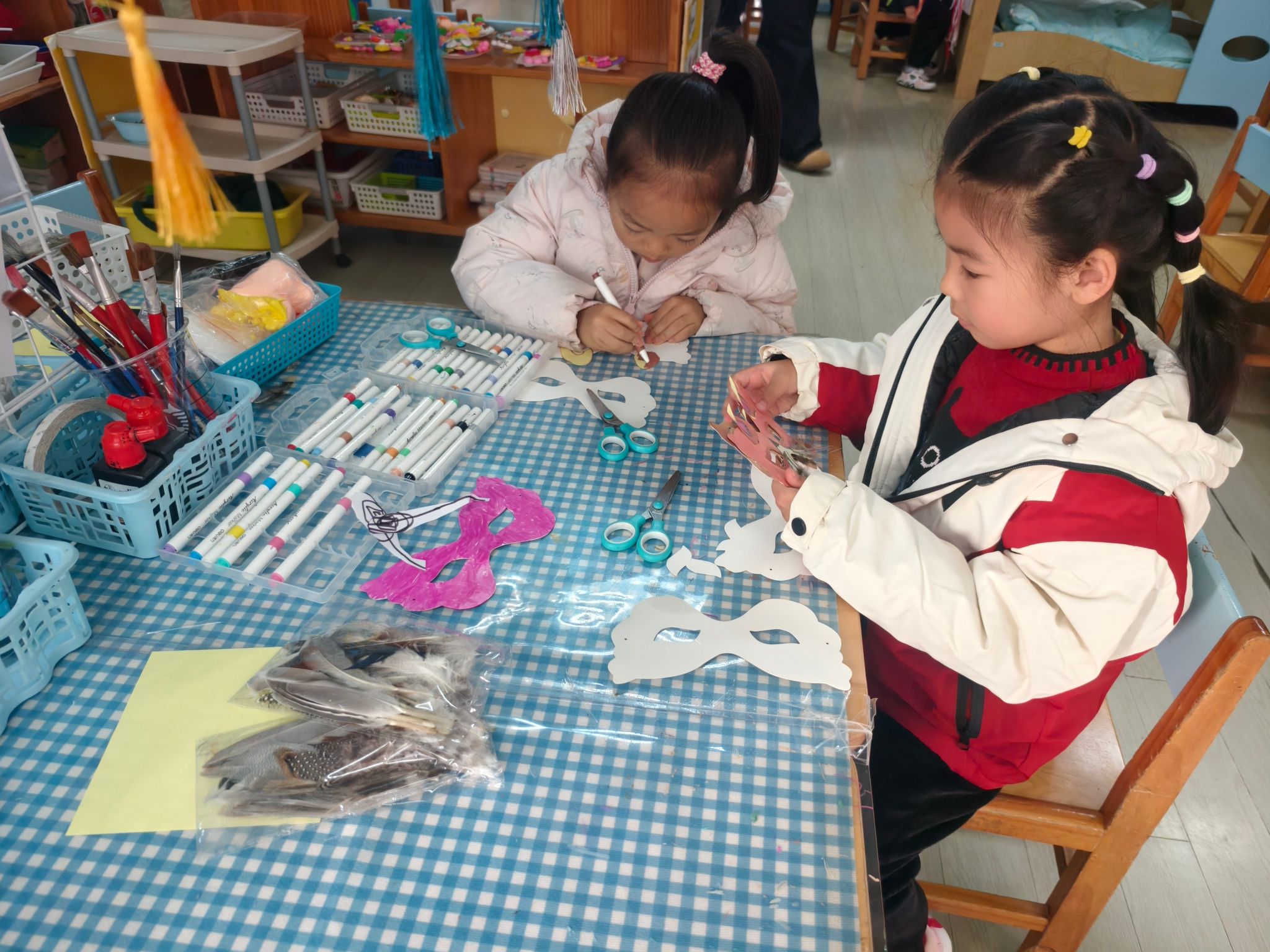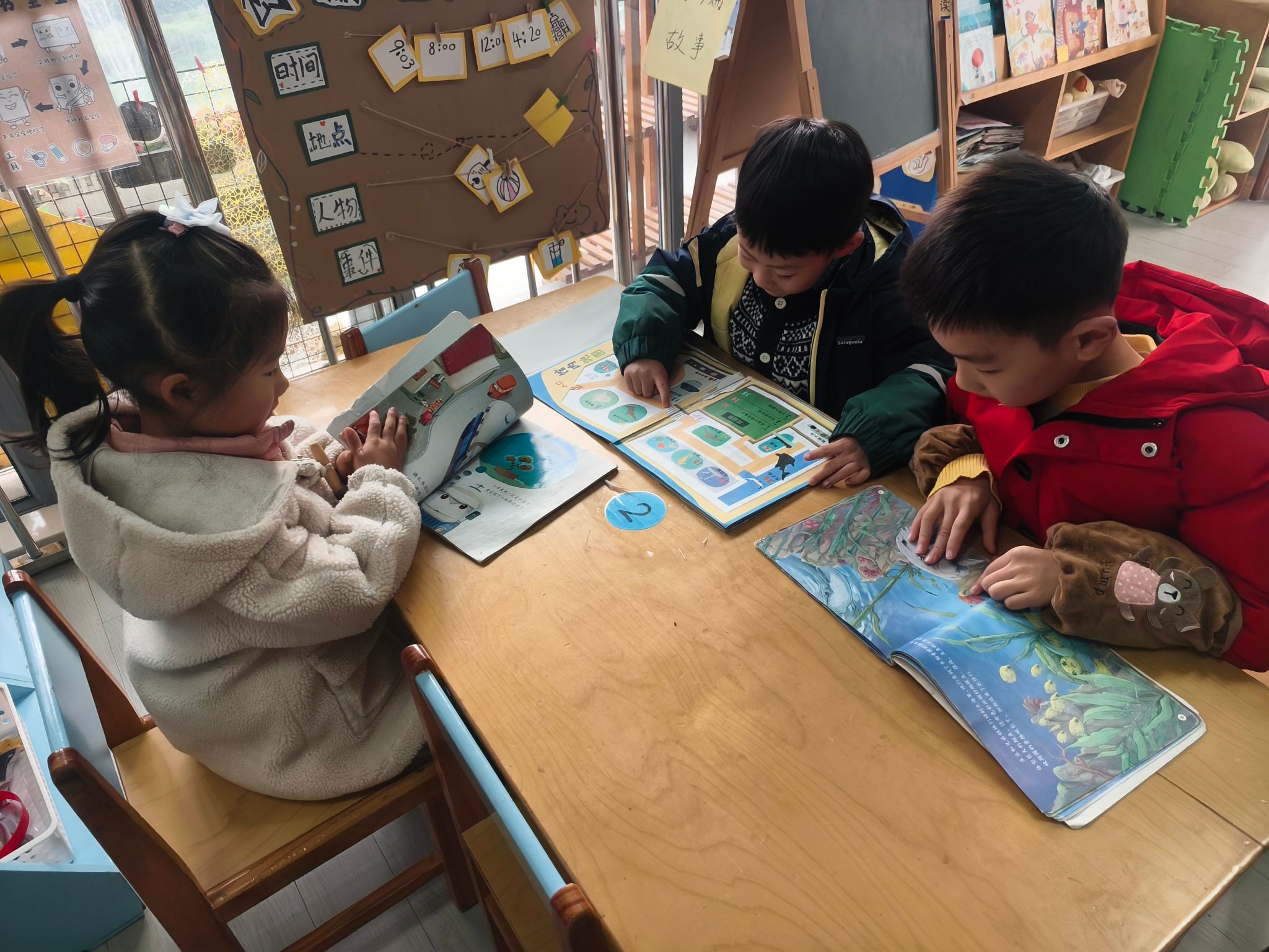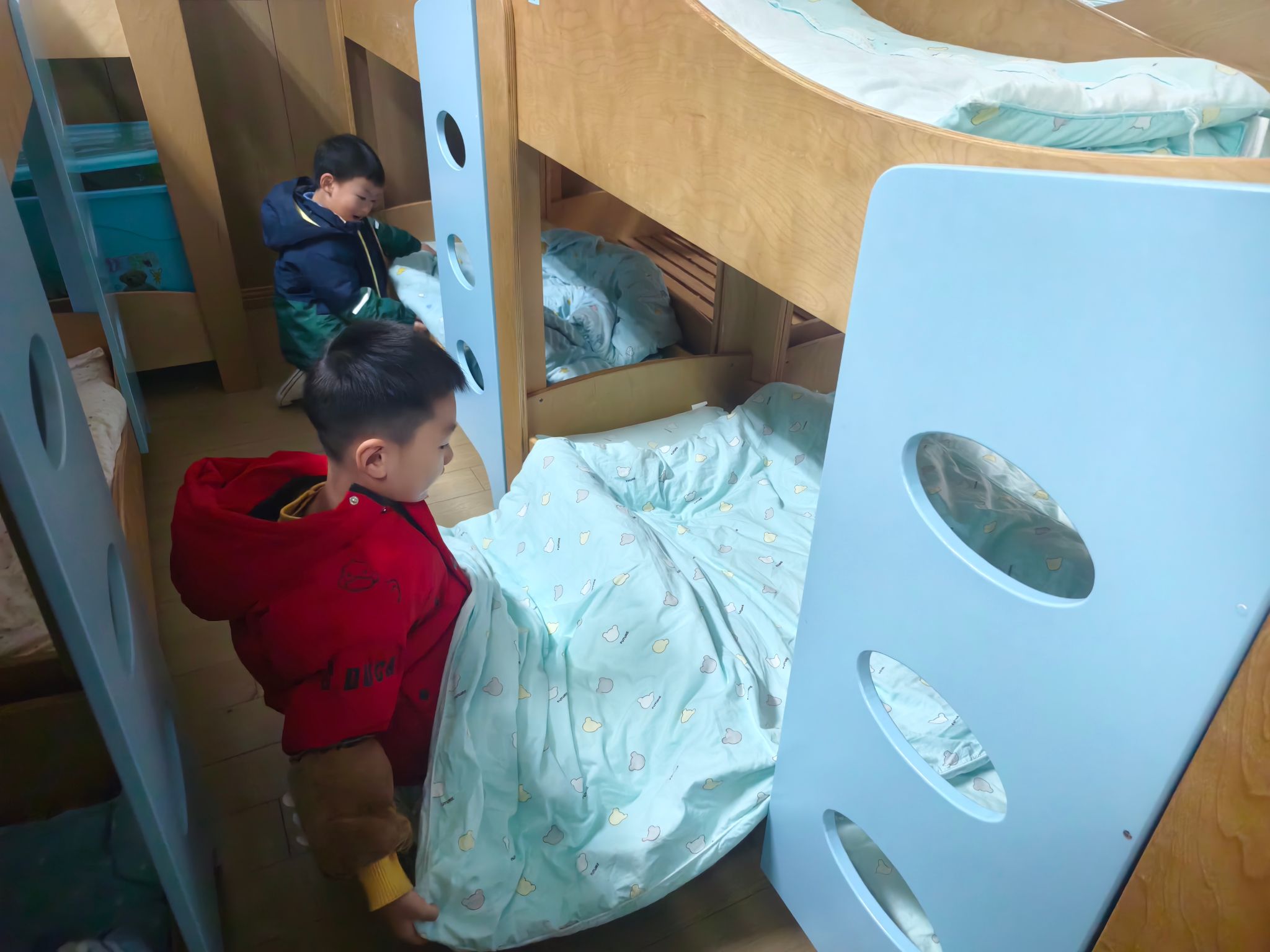 区域游戏开始喽!今天我们进行的是生活区的展示,孩子们的小手真灵巧呀!有的在练习剪指甲、编辫子、系鞋带、叠被子,有的在创作动物面具、松果动物,有的在编织花篮、圣诞树、捕梦网、毛球怪,还有的在制作发饰,磨豆浆、剥大蒜、削果皮。大家忙得热火朝天!还有建构区的小建筑工人们在搭建动物园,益智区的小棋手们认真的在对决,图书馆里安静在阅读。