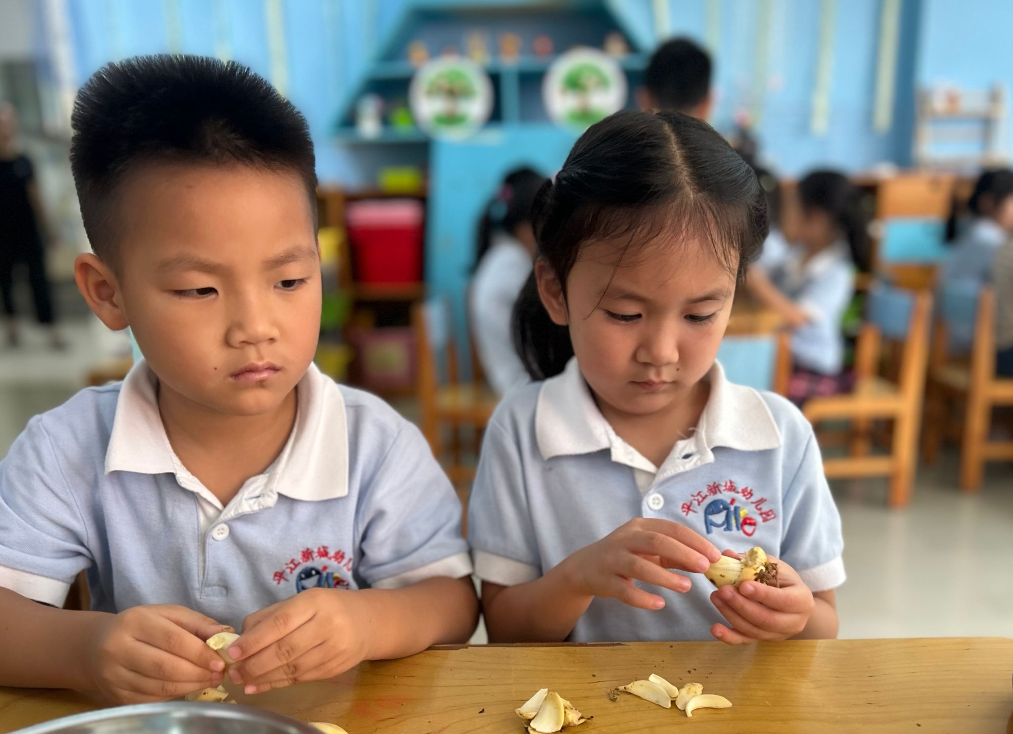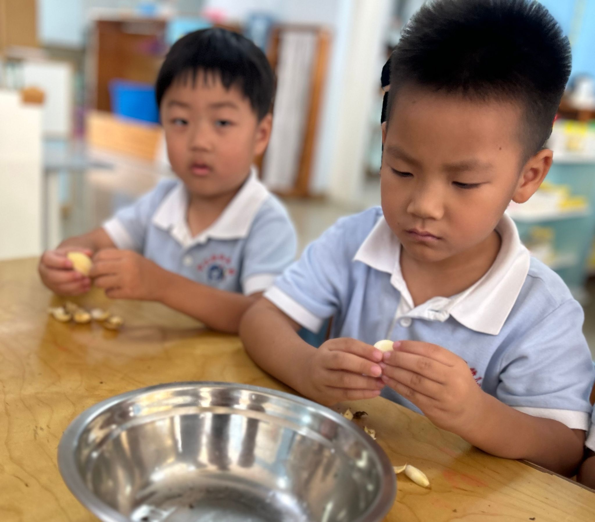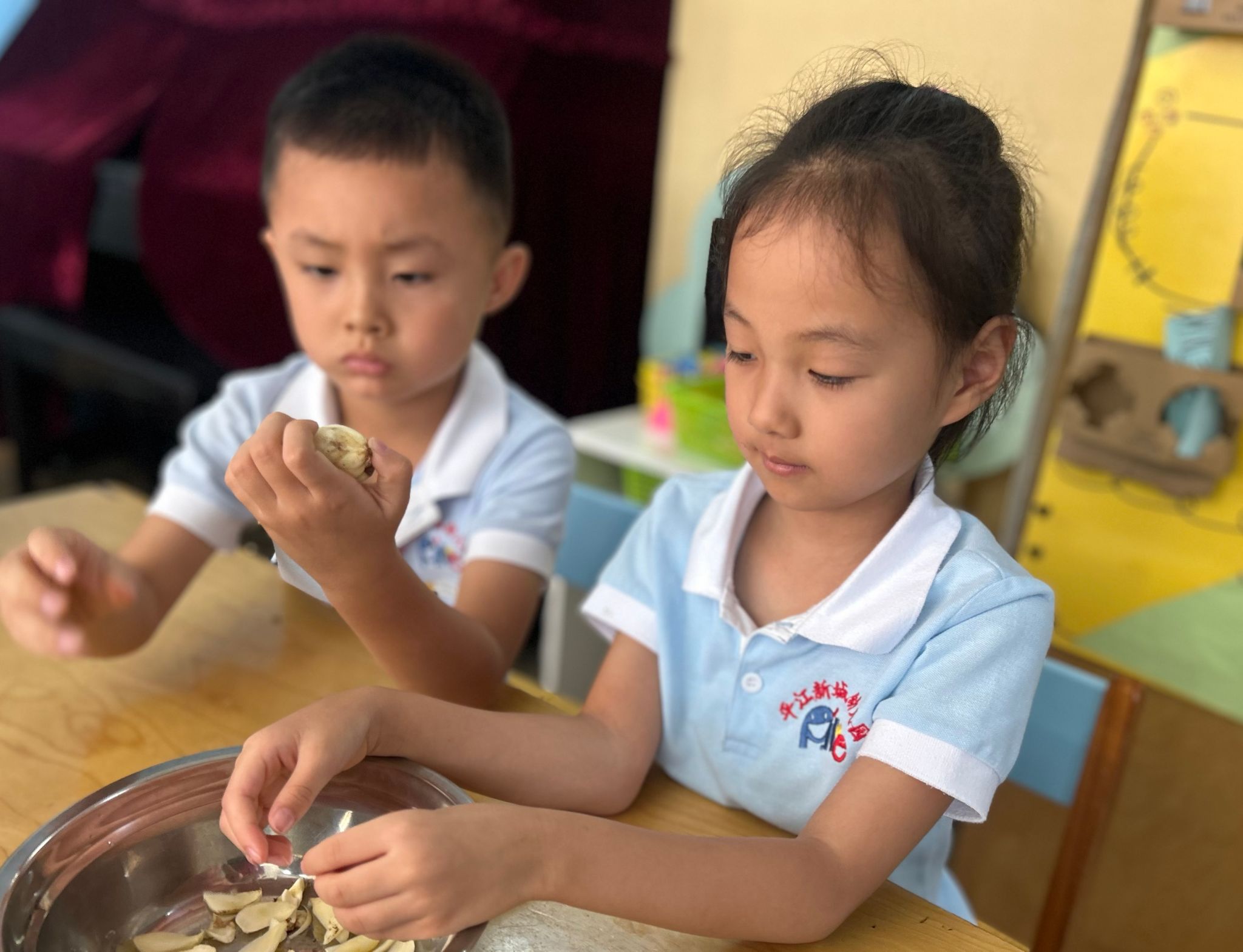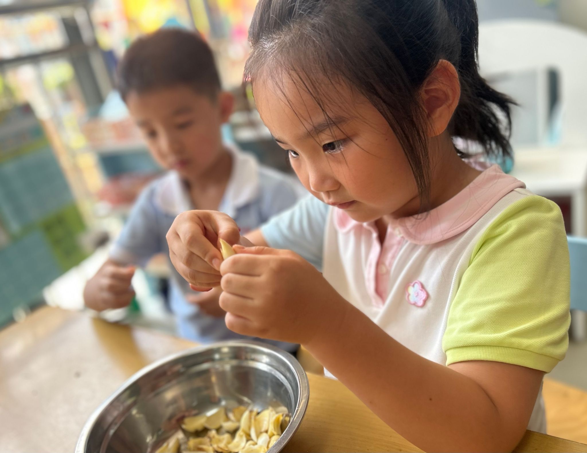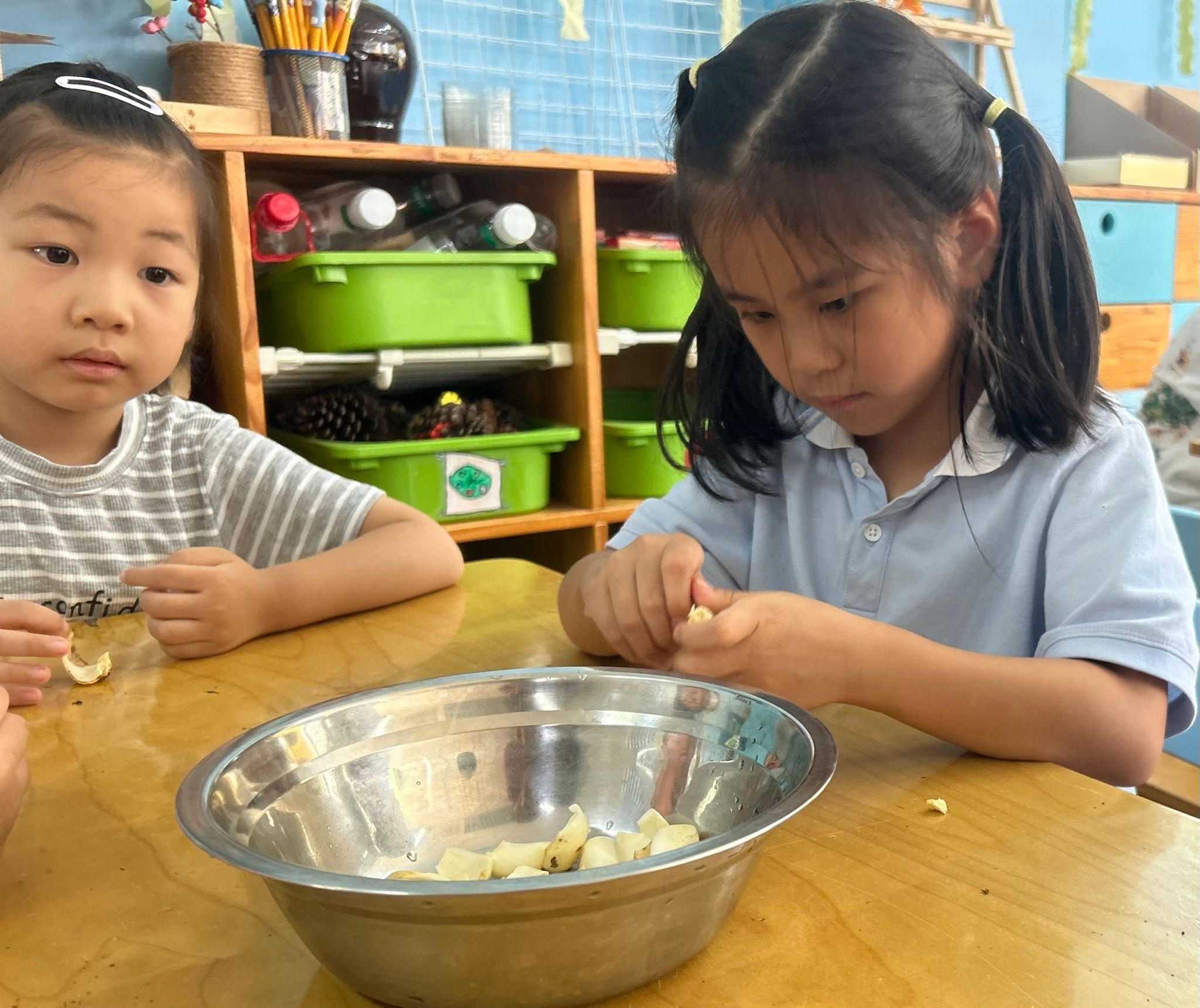 “看,百合像小花瓣!”活动中,孩子们的小手正和百合“较劲”。捏开鳞片、剔除根须,从生疏到熟练,碎鳞片堆成小山。每剥好一瓣,眼里都闪着独立完成任务的光。