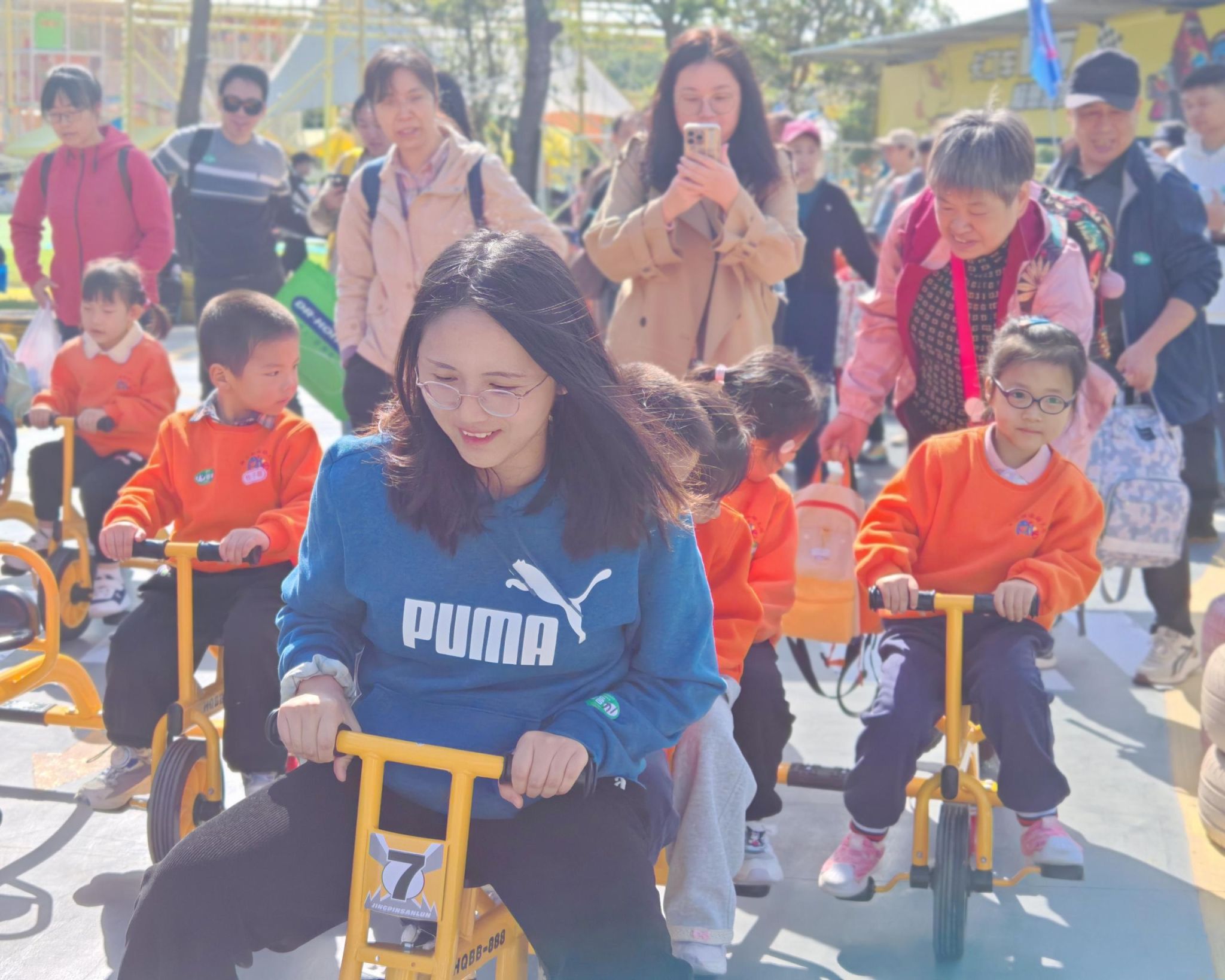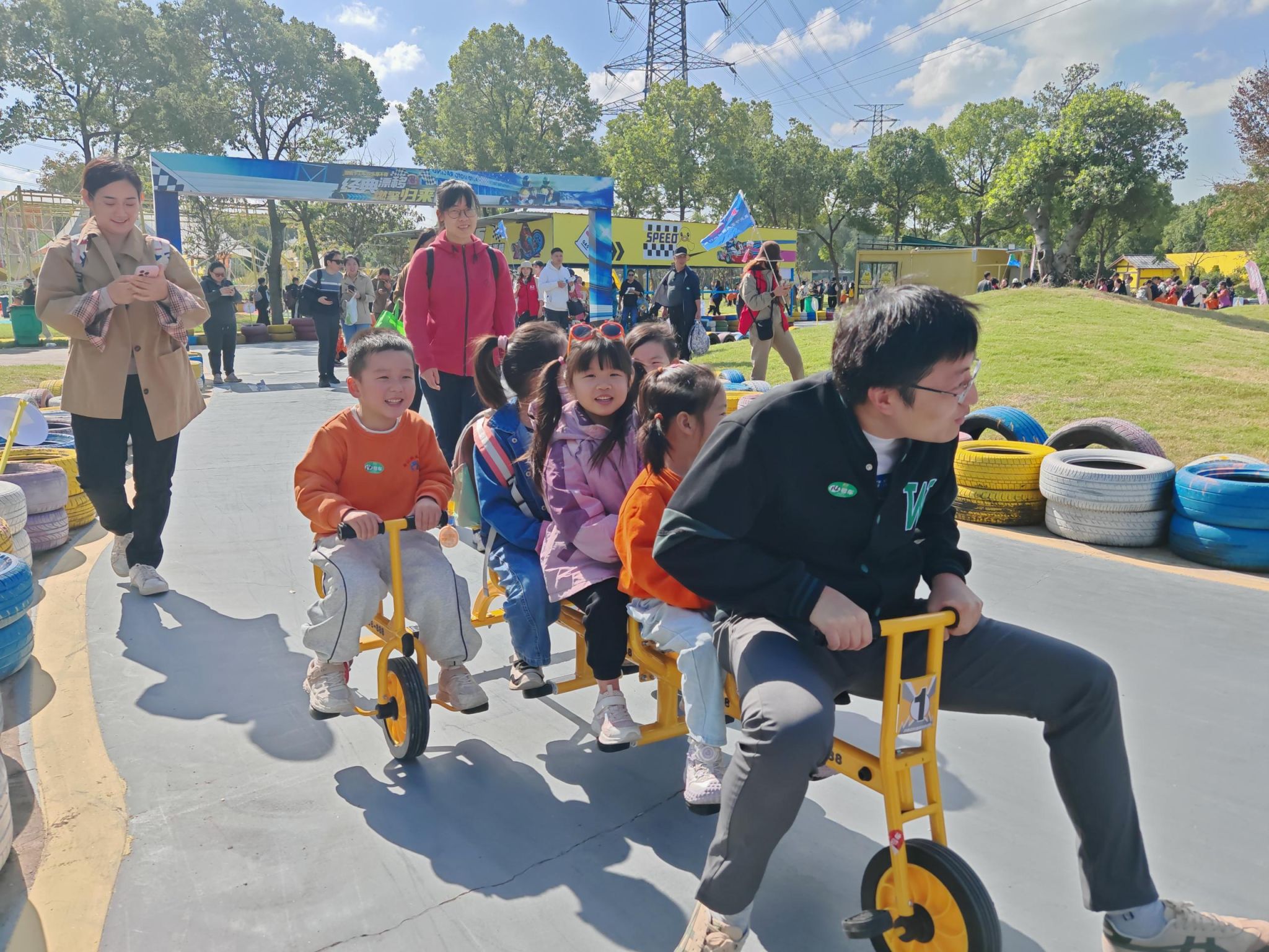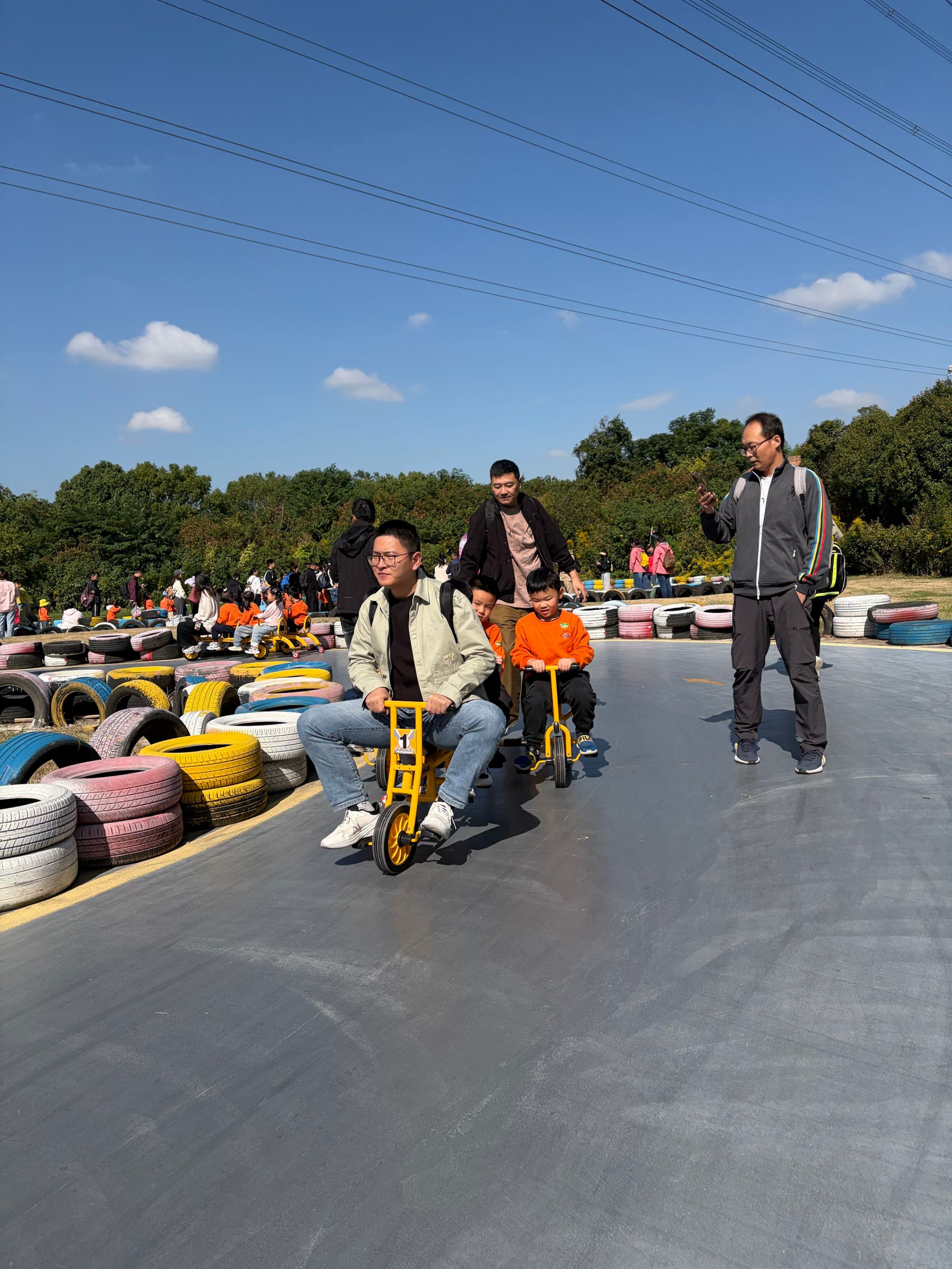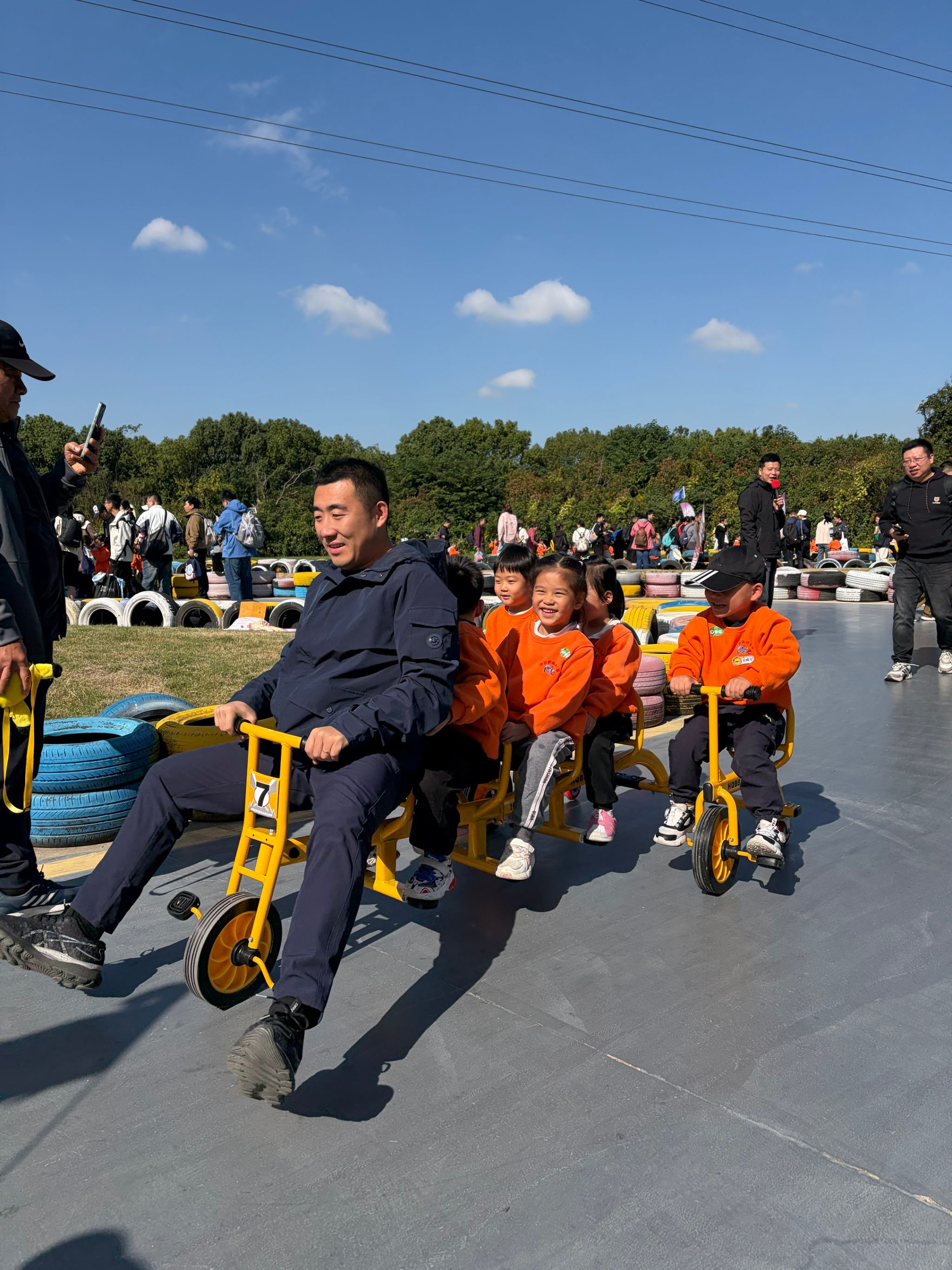 风裹着秋阳的暖,把亲子秋游酿成了甜甜的诗。 橙衣小团子们牵着家长的手,在乐园里撒开了欢:双人小车“嘀嘀”碰出笑声,连排骑行时,爸爸妈妈们的后背成了最稳的依靠,孩子们的笑脸比晴空更耀眼。 镜头定格的大合影里,每道影子都裹着暖意——这大概就是秋天最好的礼物:有自然的风,有同伴的闹,还有身边稳稳的陪伴。