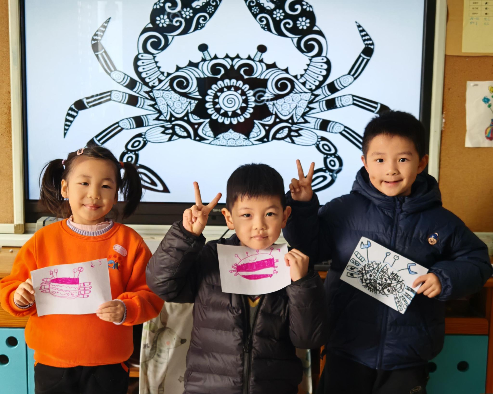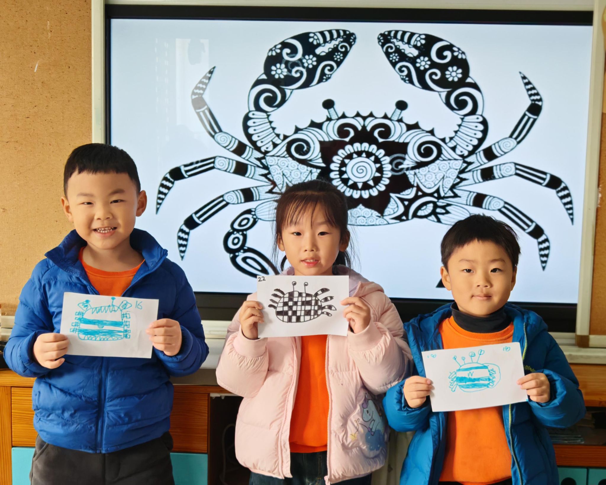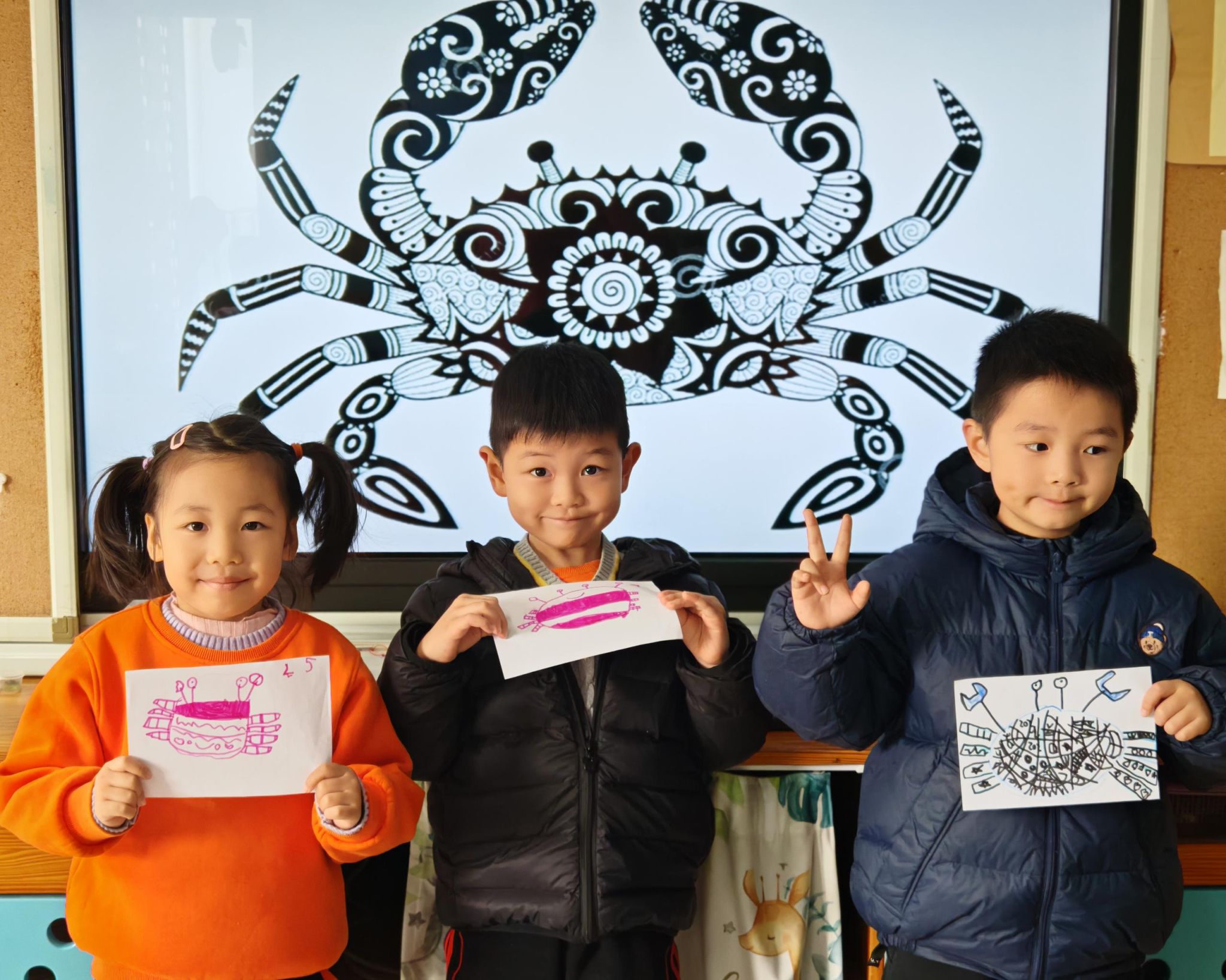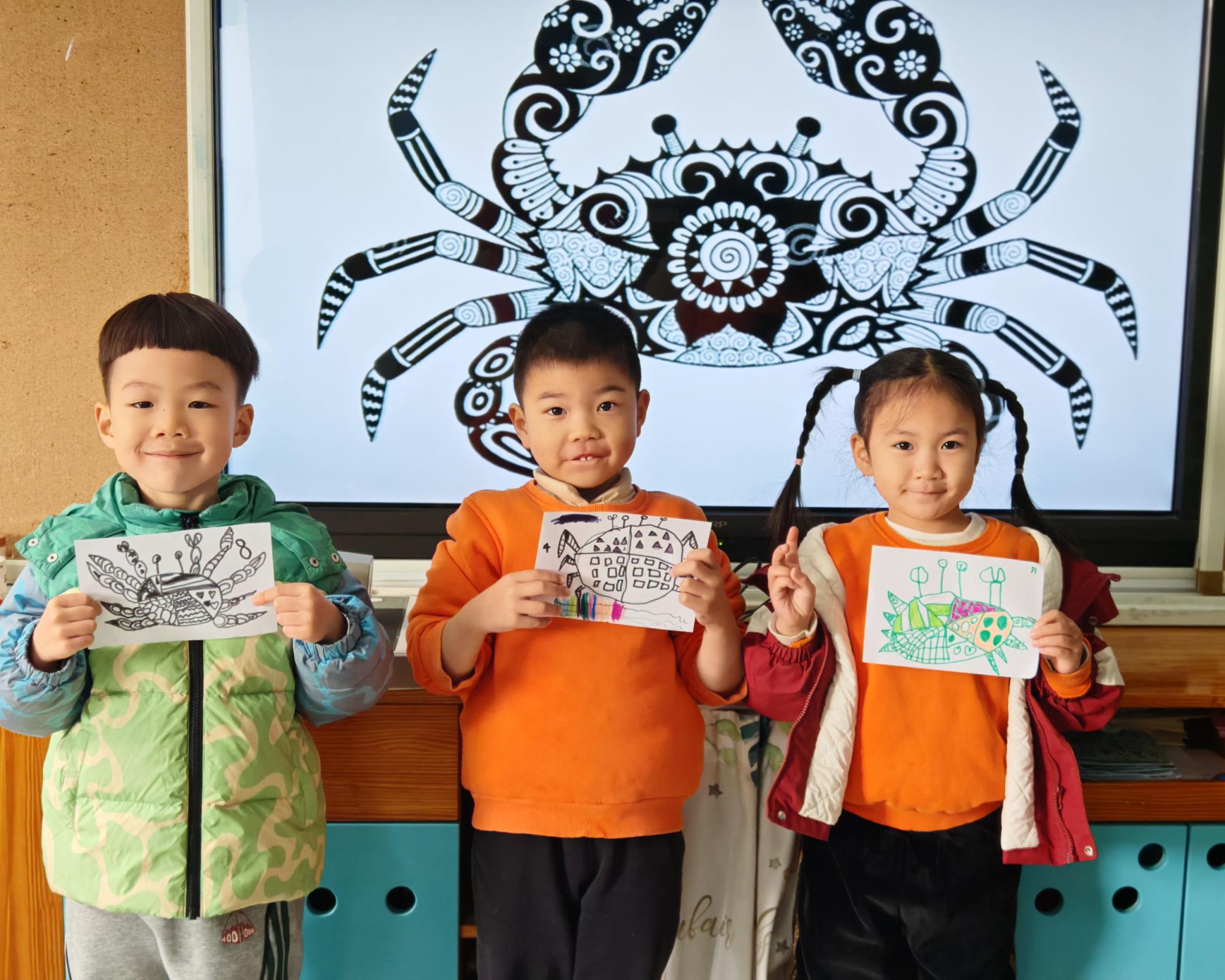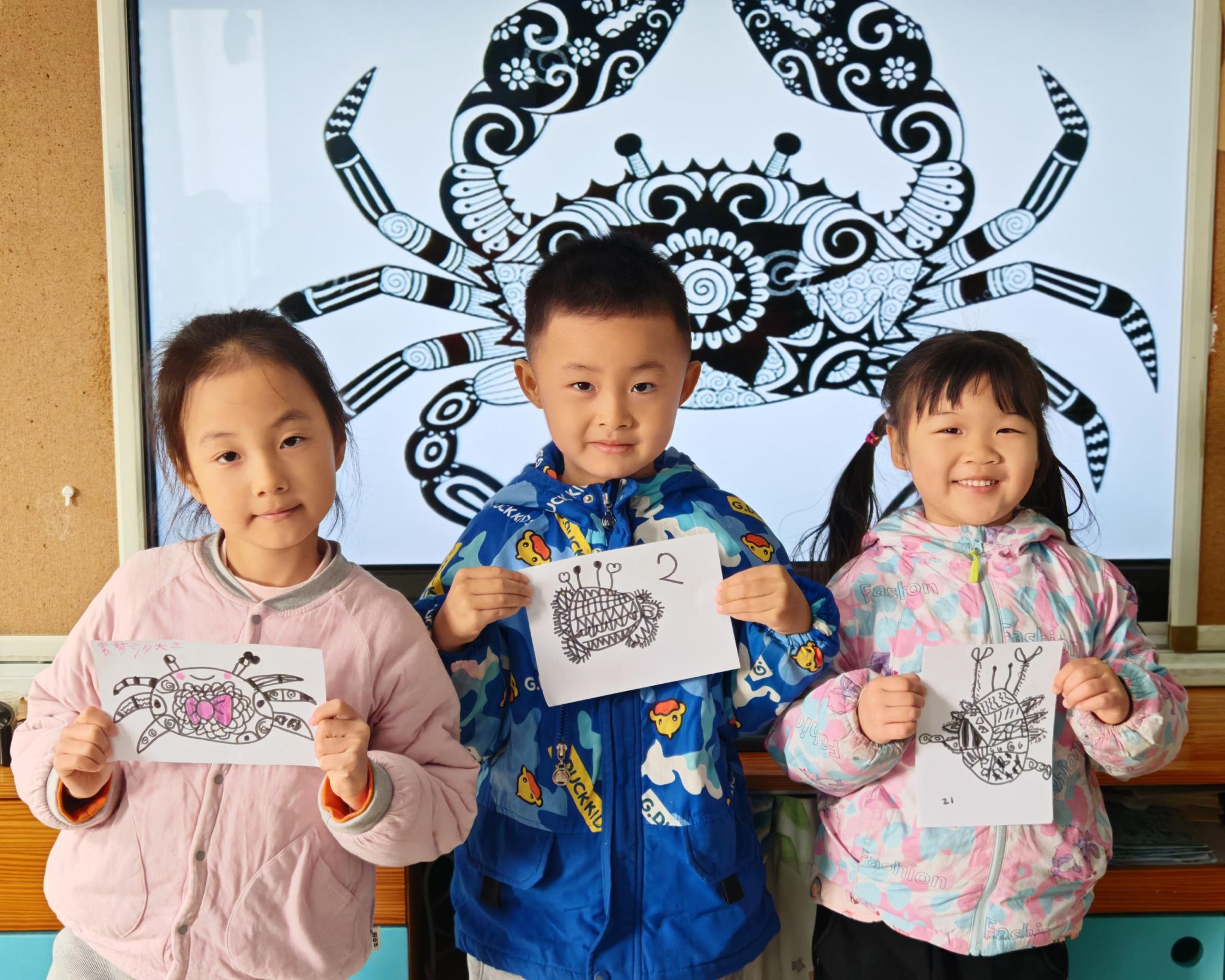 可爱的小螃蟹深受孩子们的喜爱,大家给螃蟹设计了一身花花衣。孩子们能够注意把螃蟹的身体画的大一些,能够设计更丰富的花纹。