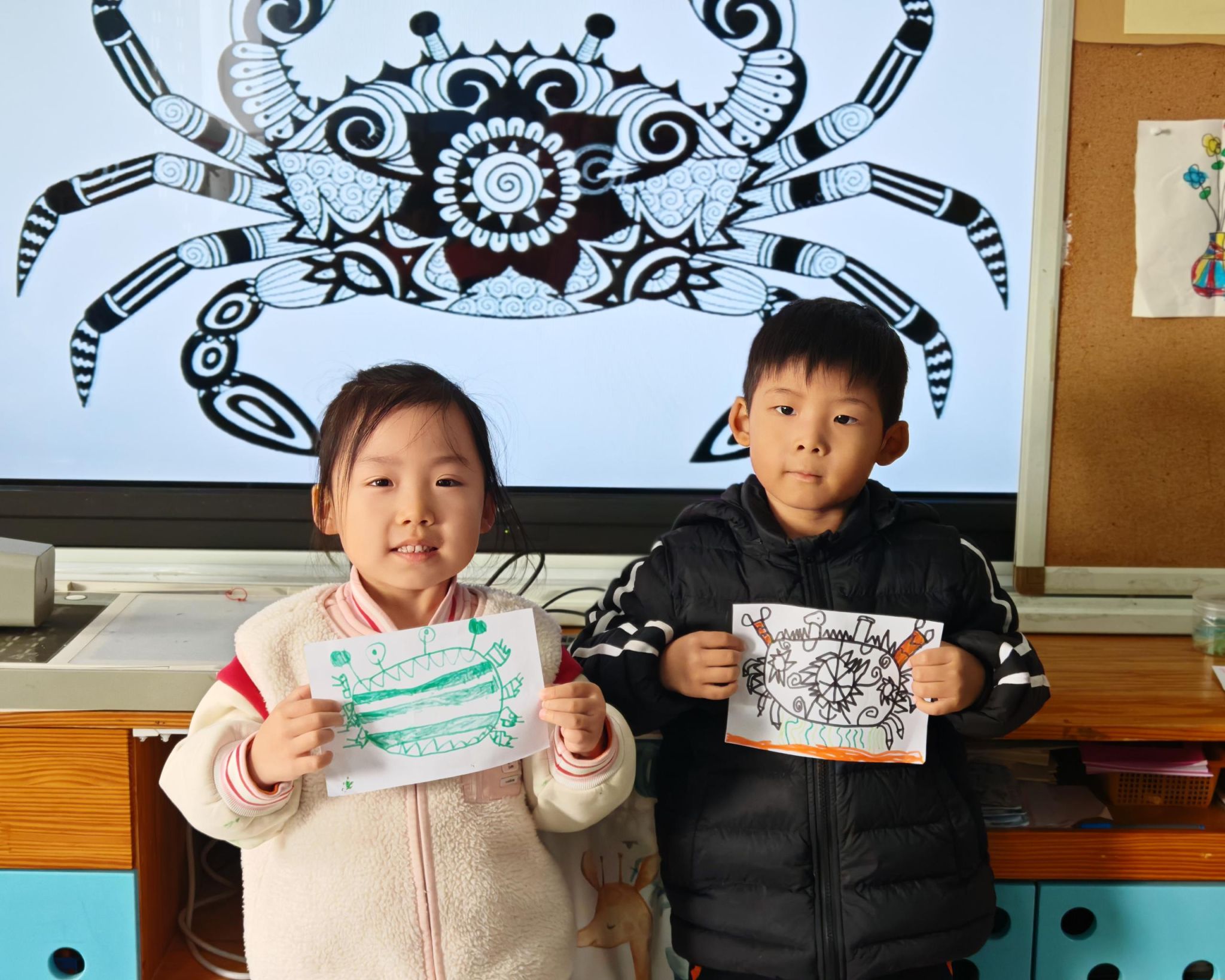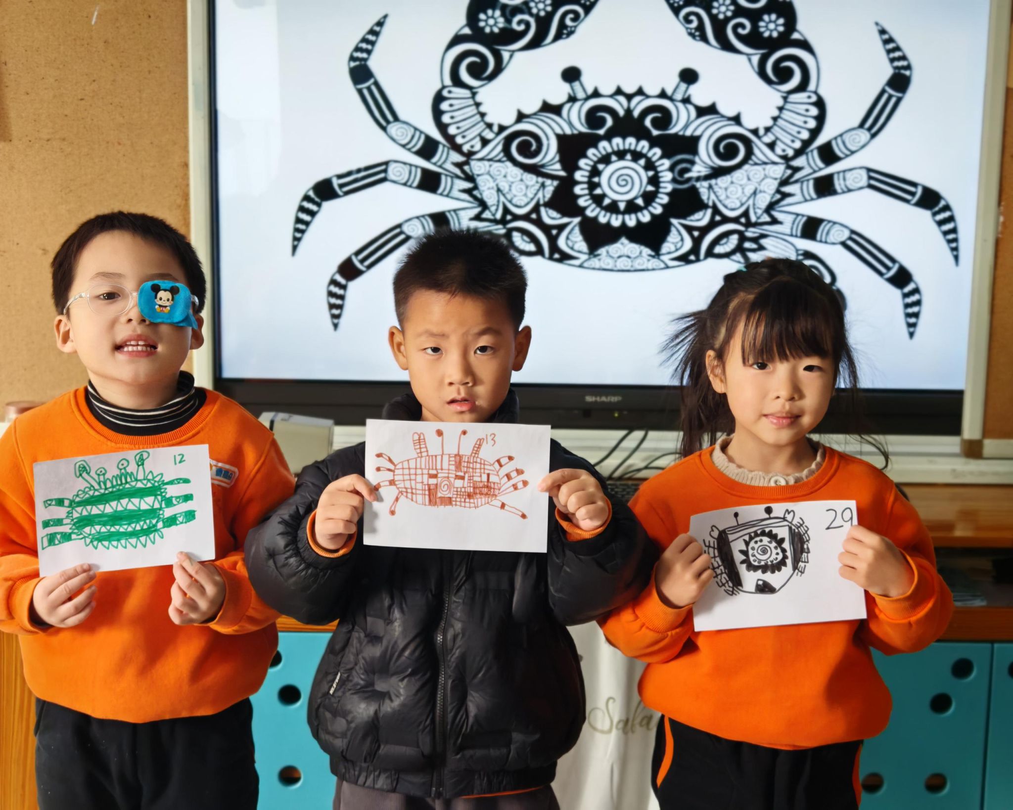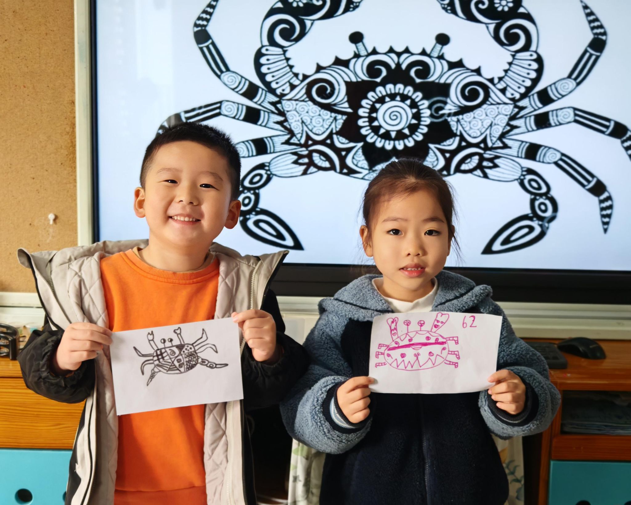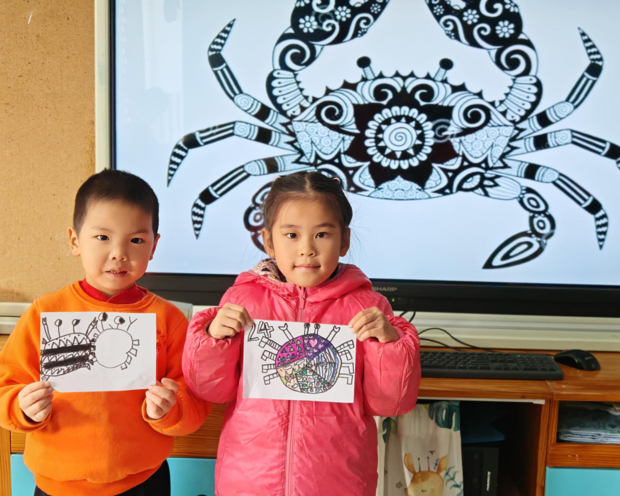 可爱的小螃蟹深受孩子们的喜爱,大家给螃蟹设计了一身花花衣。孩子们能够注意把螃蟹的身体画的大一些,能够设计更丰富的花纹。