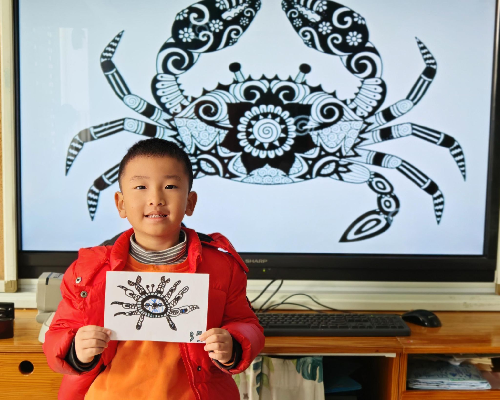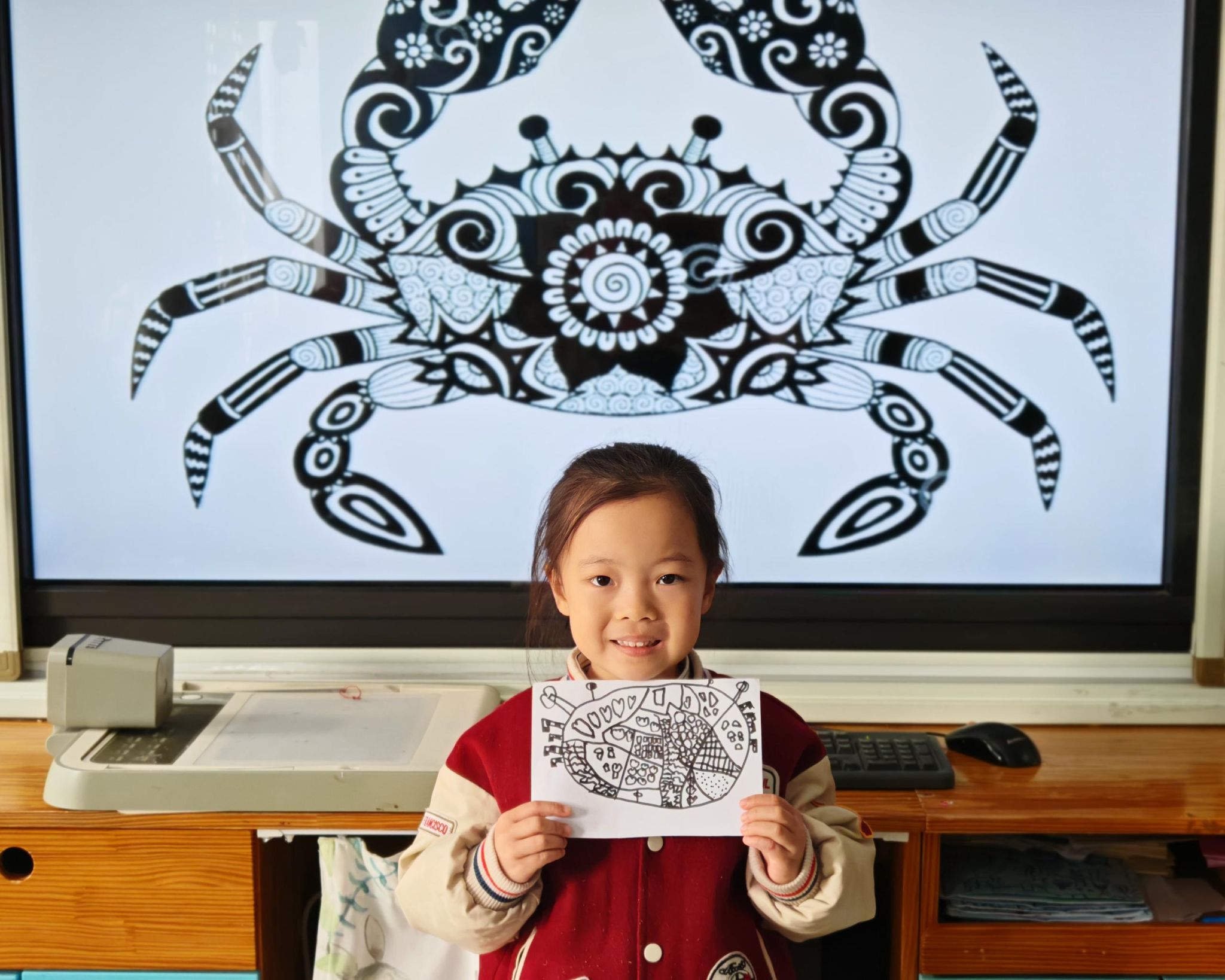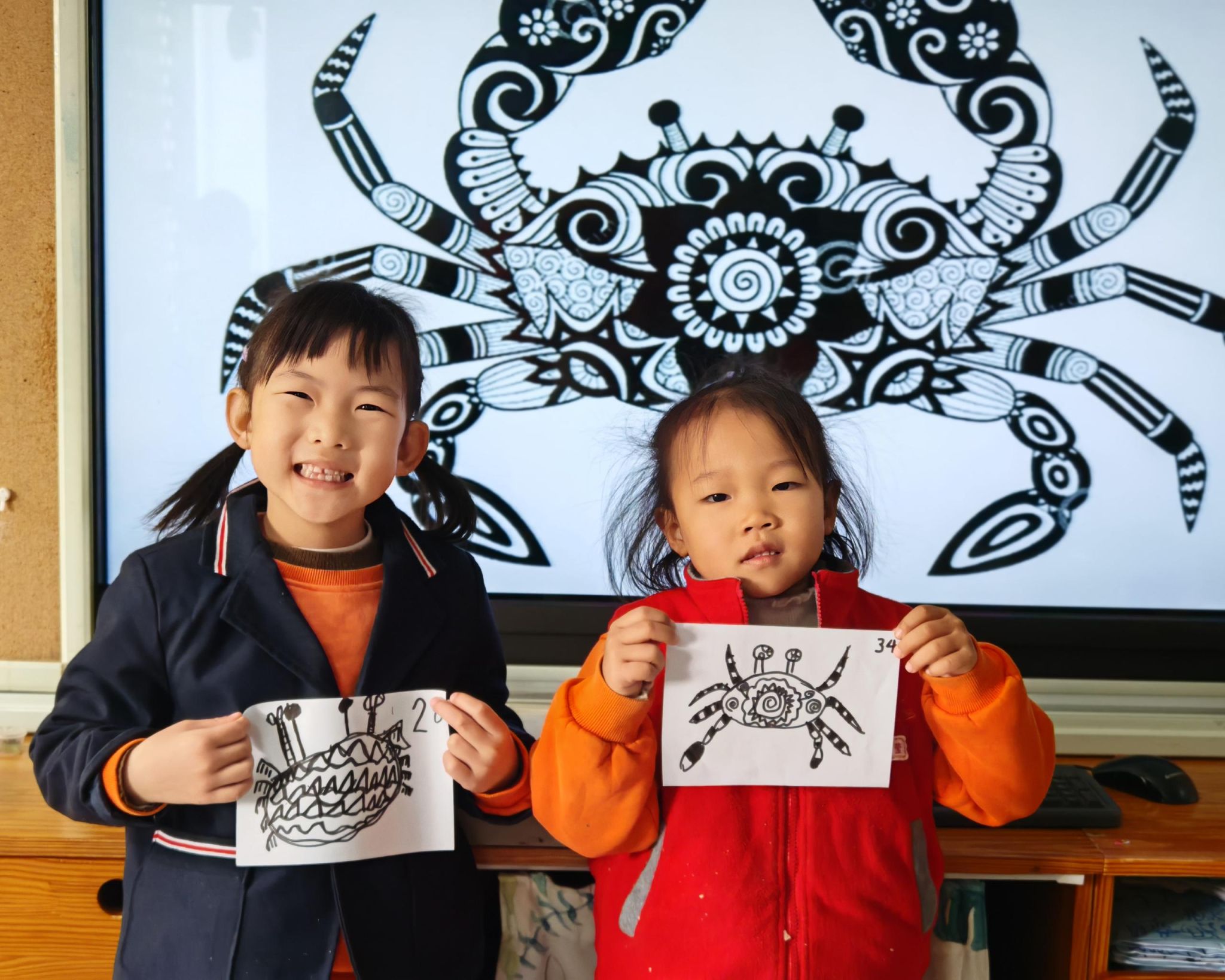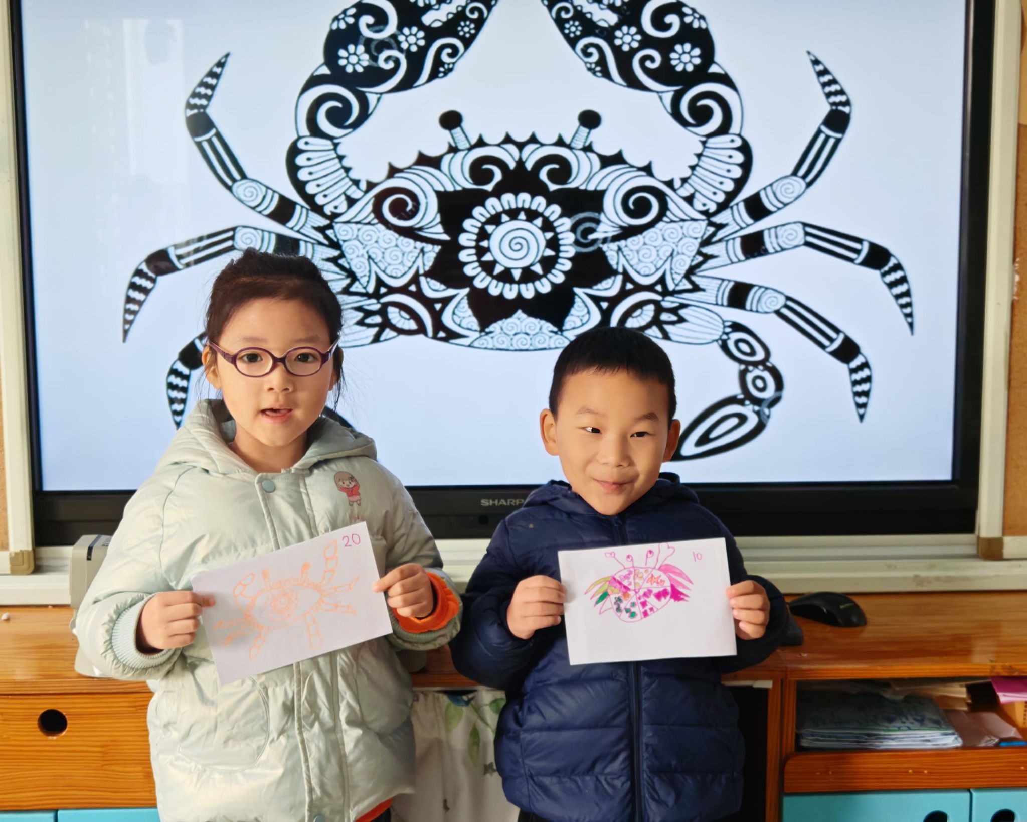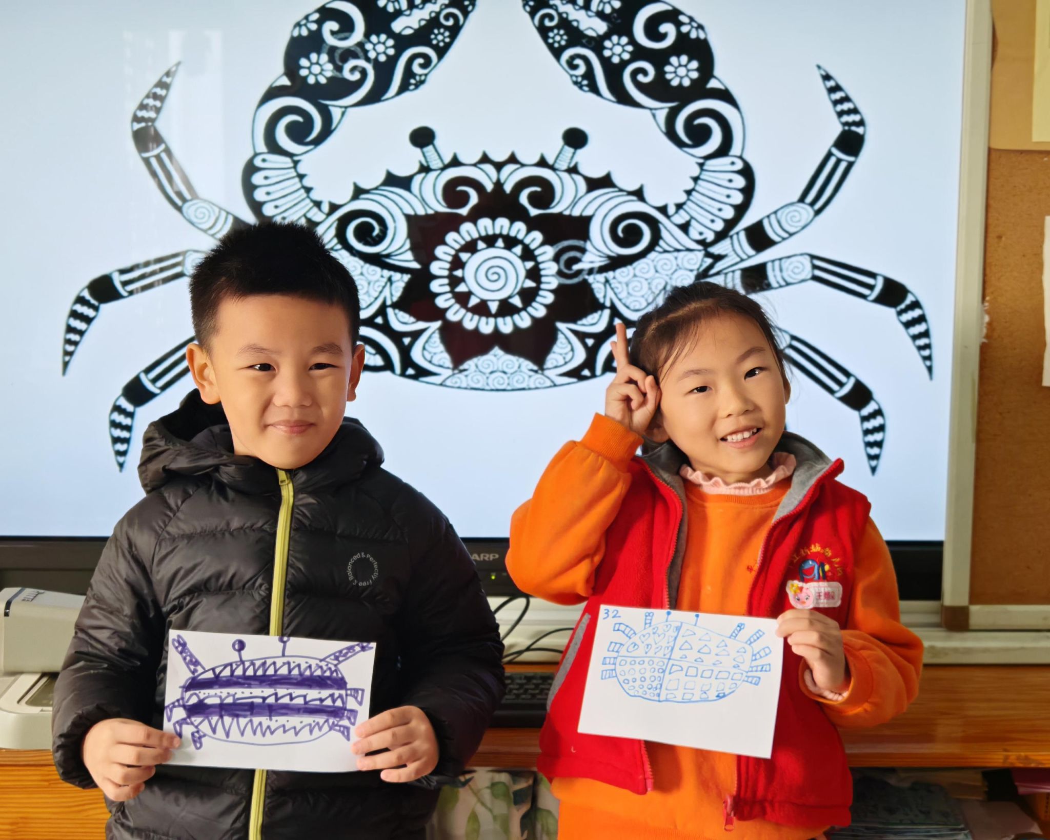 可爱的小螃蟹深受孩子们的喜爱,大家给螃蟹设计了一身花花衣。孩子们能够注意把螃蟹的身体画的大一些,能够设计更丰富的花纹。