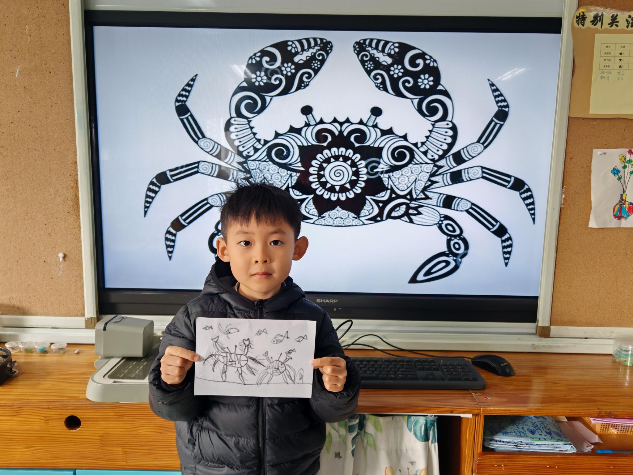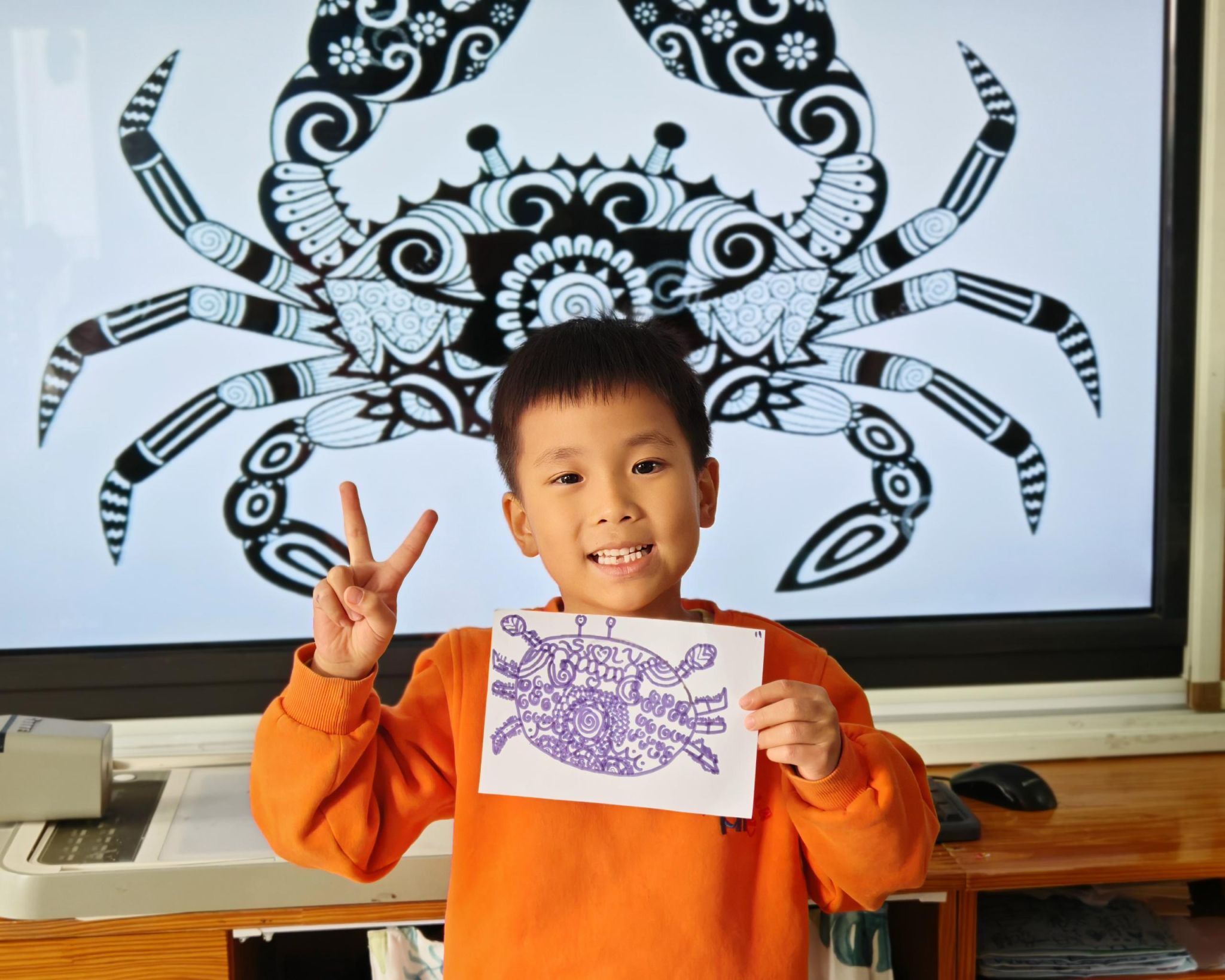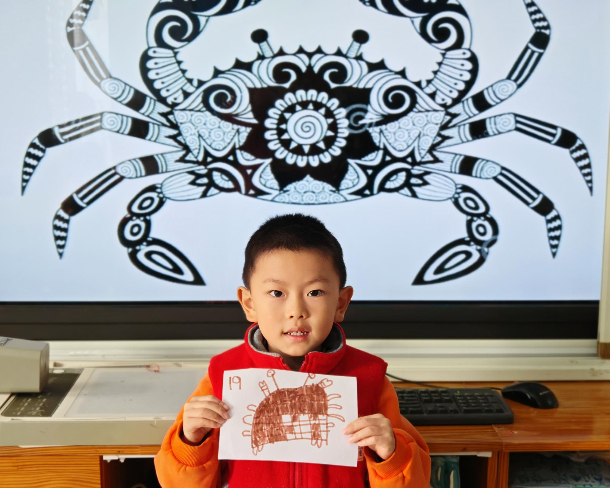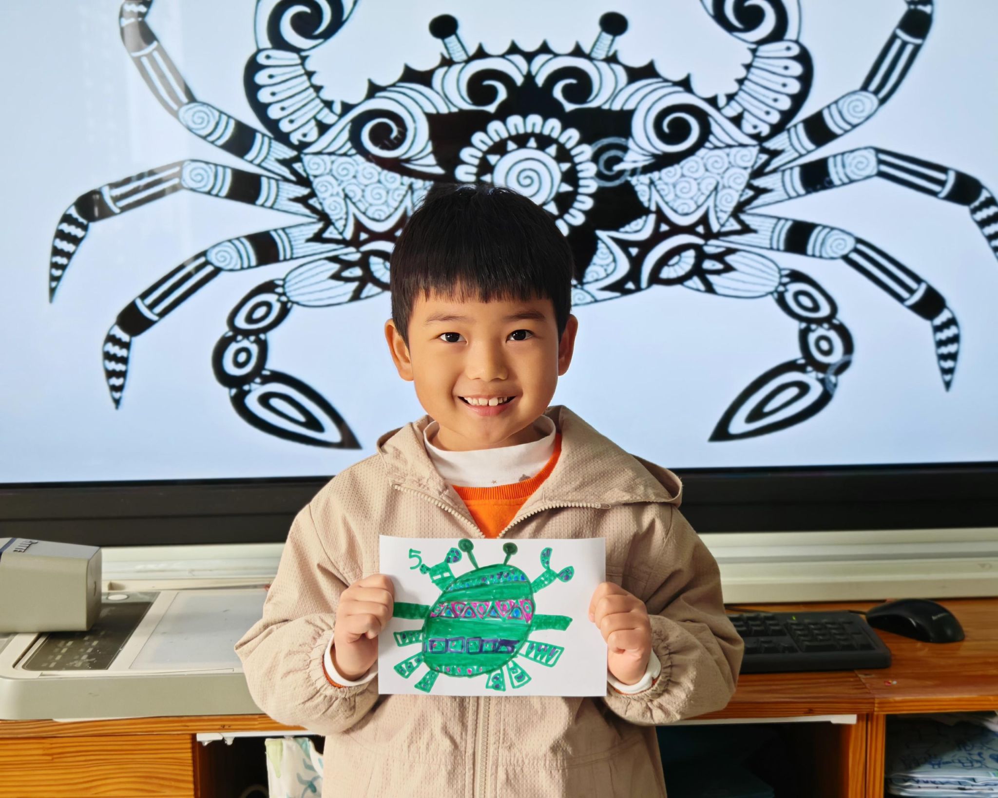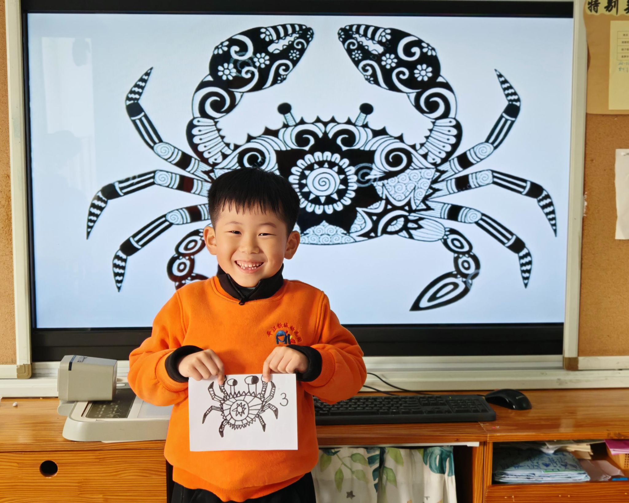可爱的小螃蟹深受孩子们的喜爱,大家给螃蟹设计了一身花花衣。孩子们能够注意把螃蟹的身体画的大一些,能够设计更丰富的花纹。