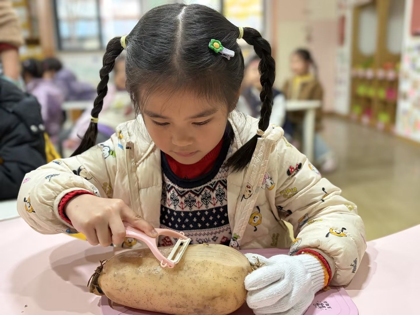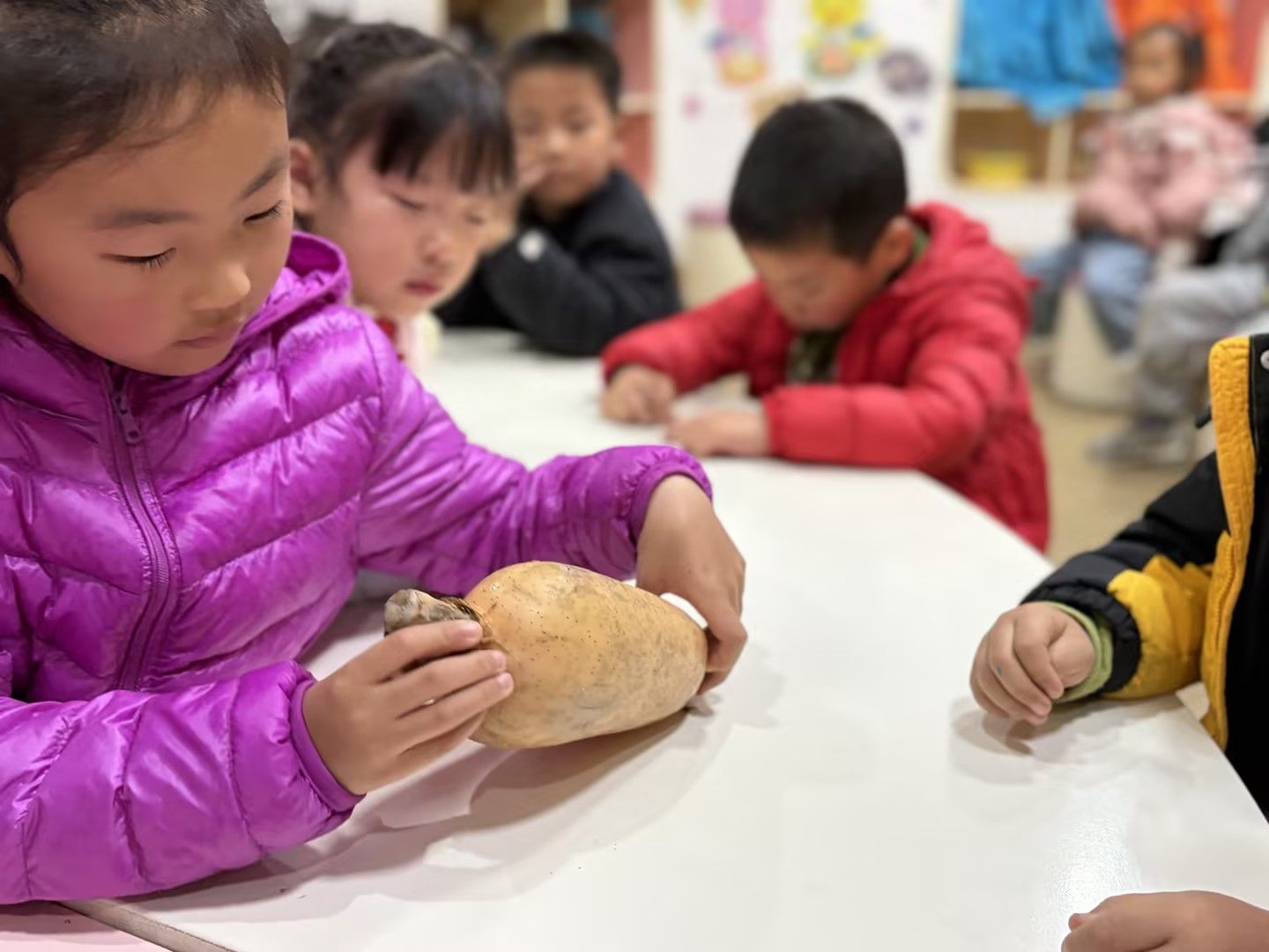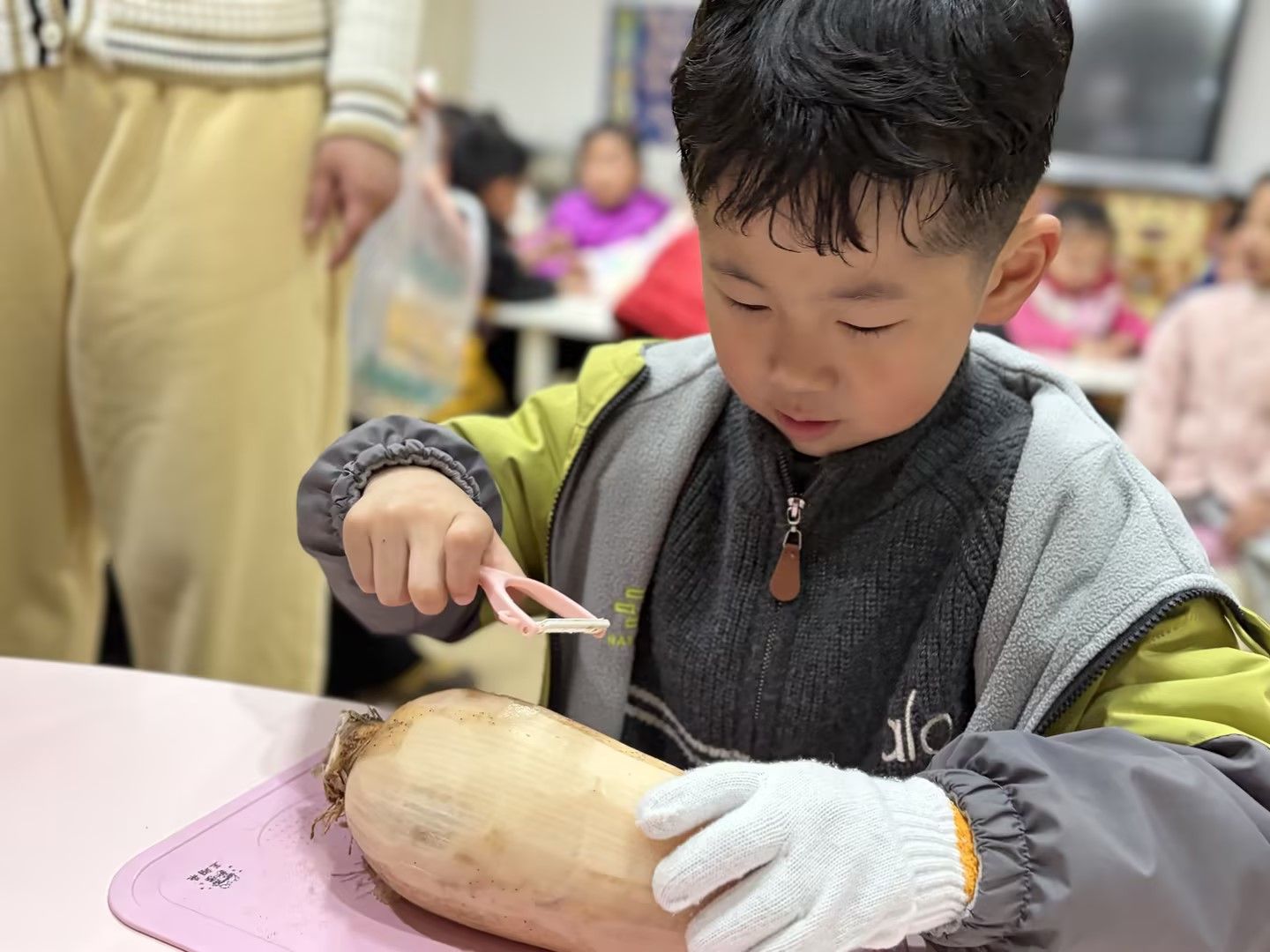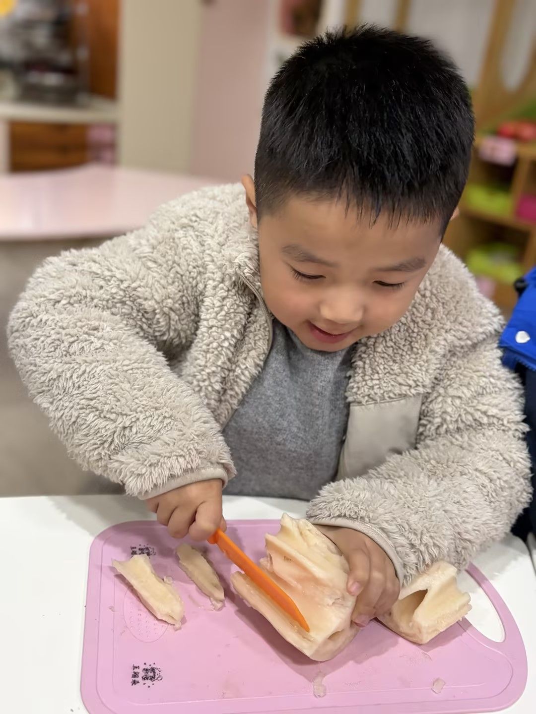 孩子们凑近藕仔细观察孔洞纹理,小手握着工具认真剥皮,又小心翼翼学着切藕,动作虽稚嫩却格外专注,在动手实践中解锁新技能,满眼都是探索的欢喜。