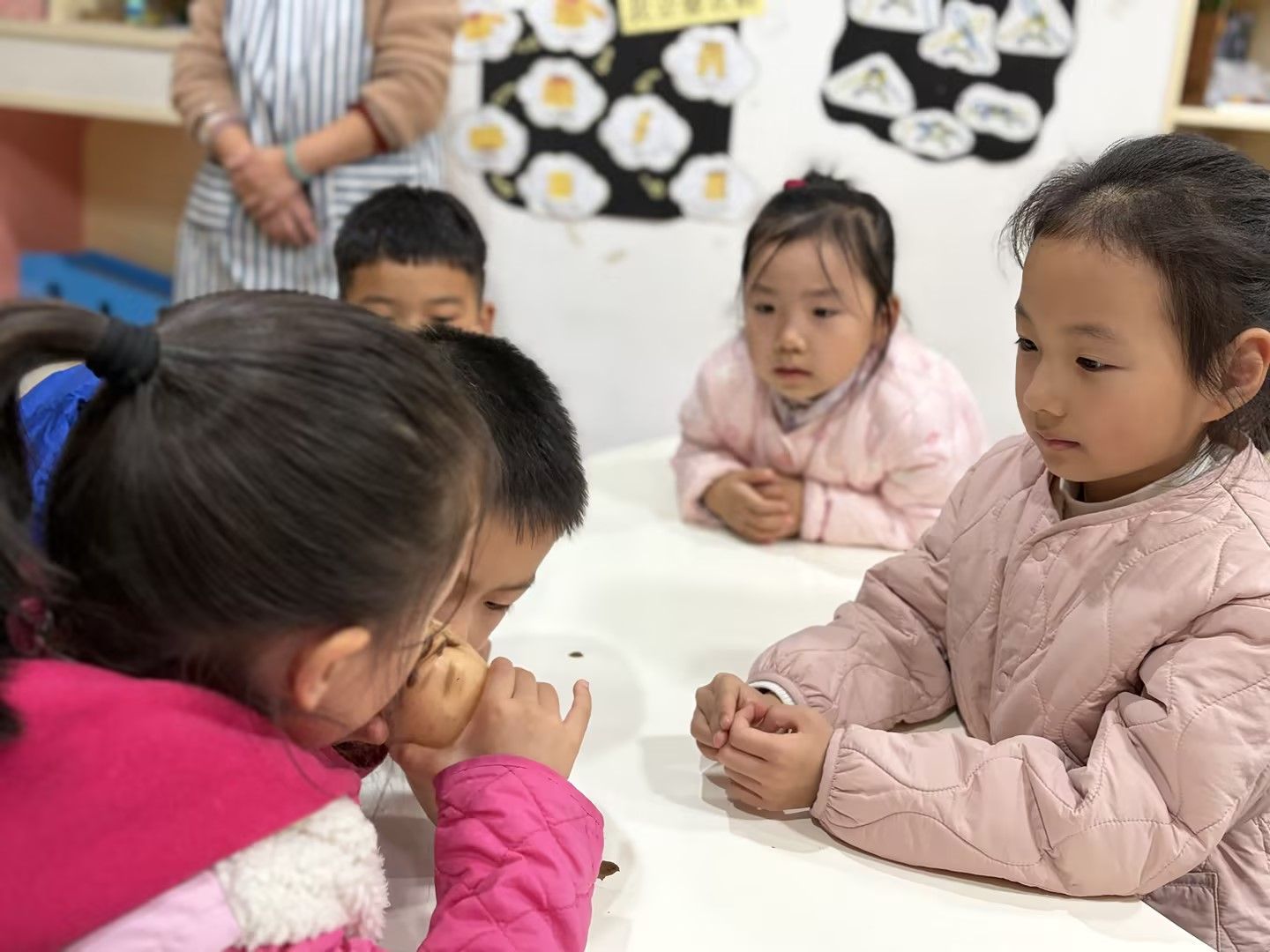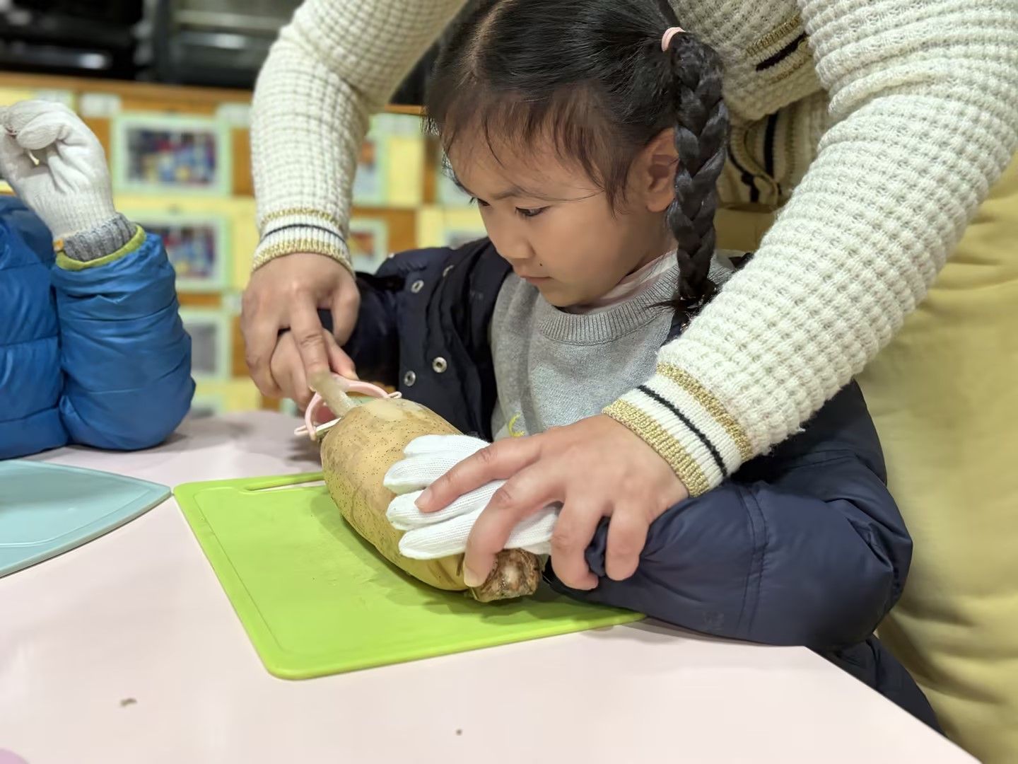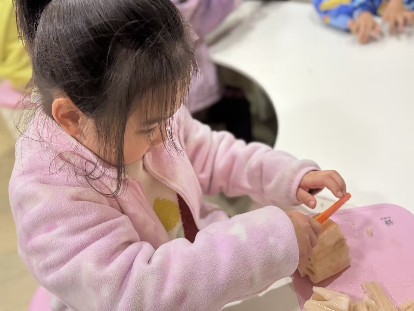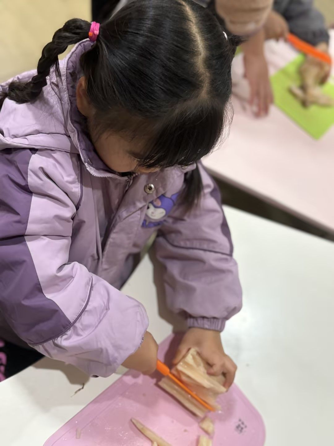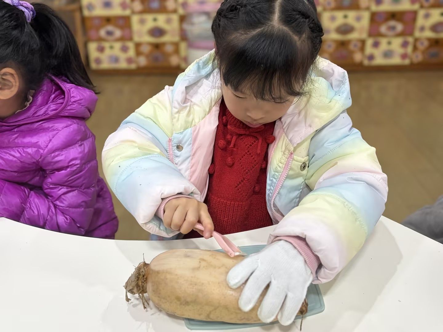 孩子们凑近藕仔细观察孔洞纹理,小手握着工具认真剥皮,又小心翼翼学着切藕,动作虽稚嫩却格外专注,在动手实践中解锁新技能,满眼都是探索的欢喜。