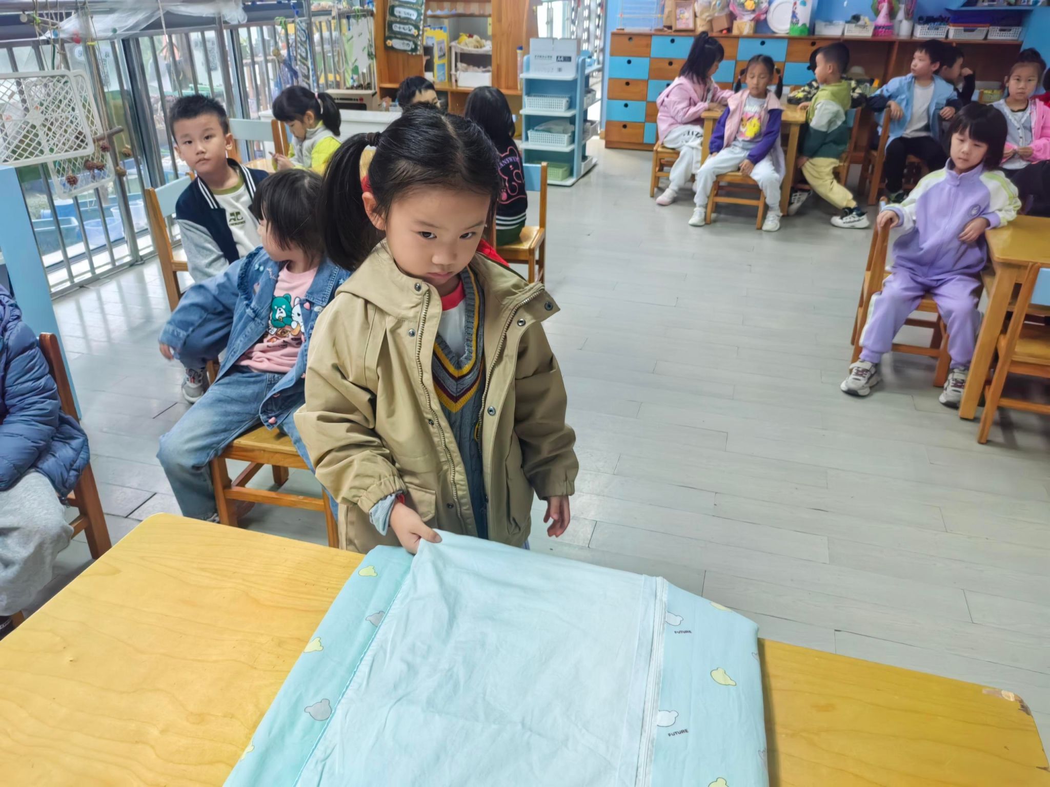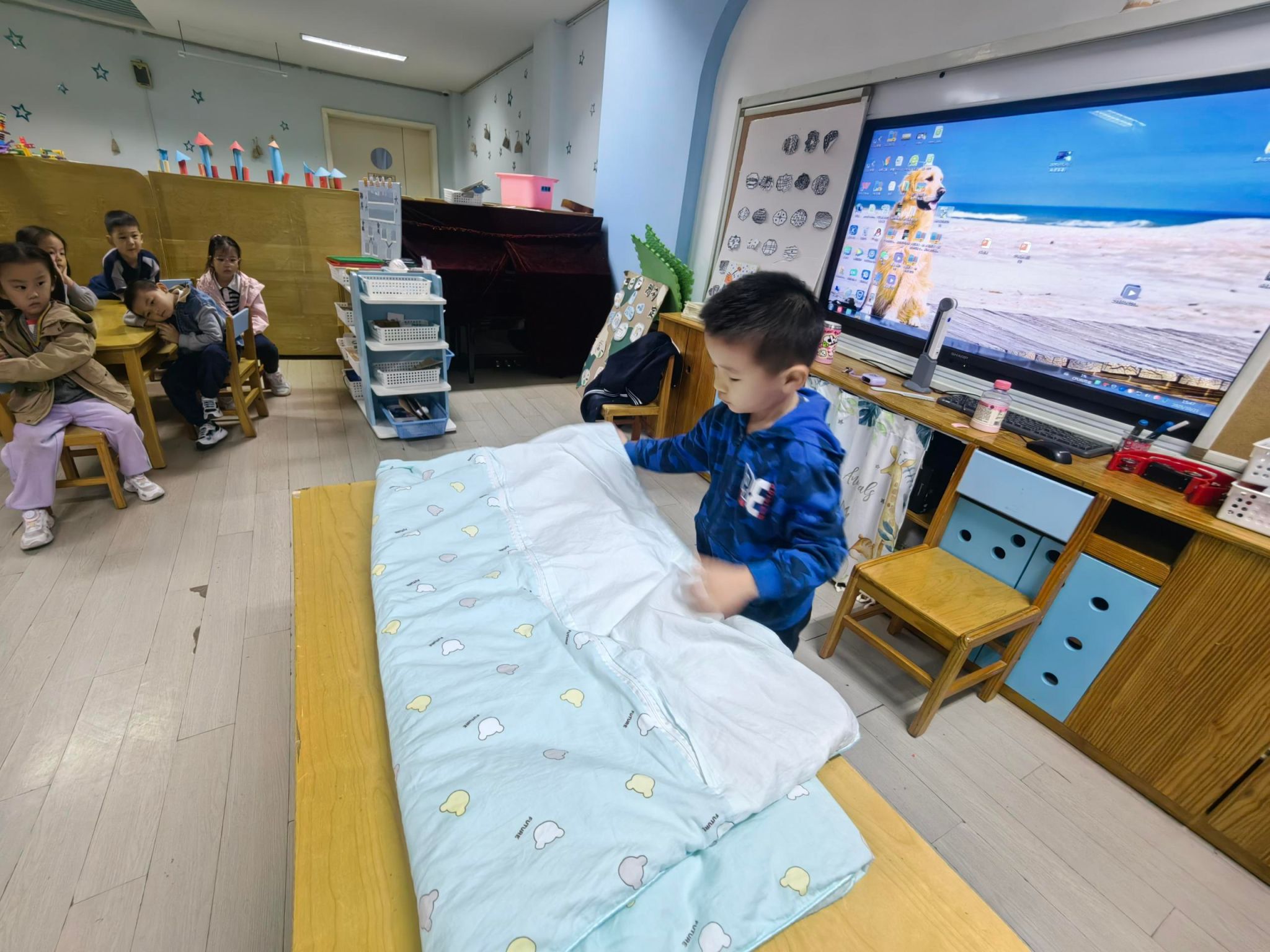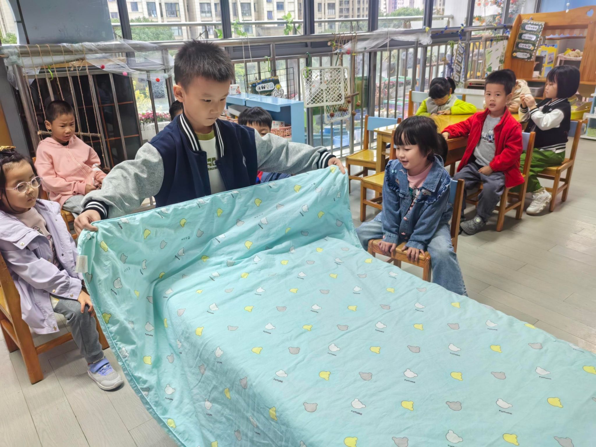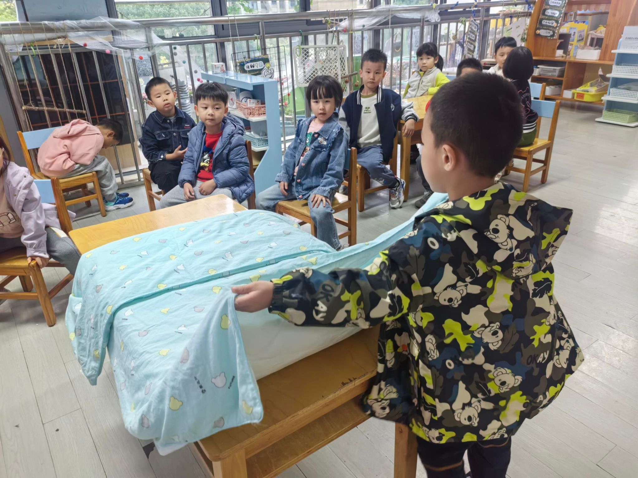 天气变冷了,我们不仅会叠毯子,还会叠厚厚的被子,我们可真是太厉害了!
