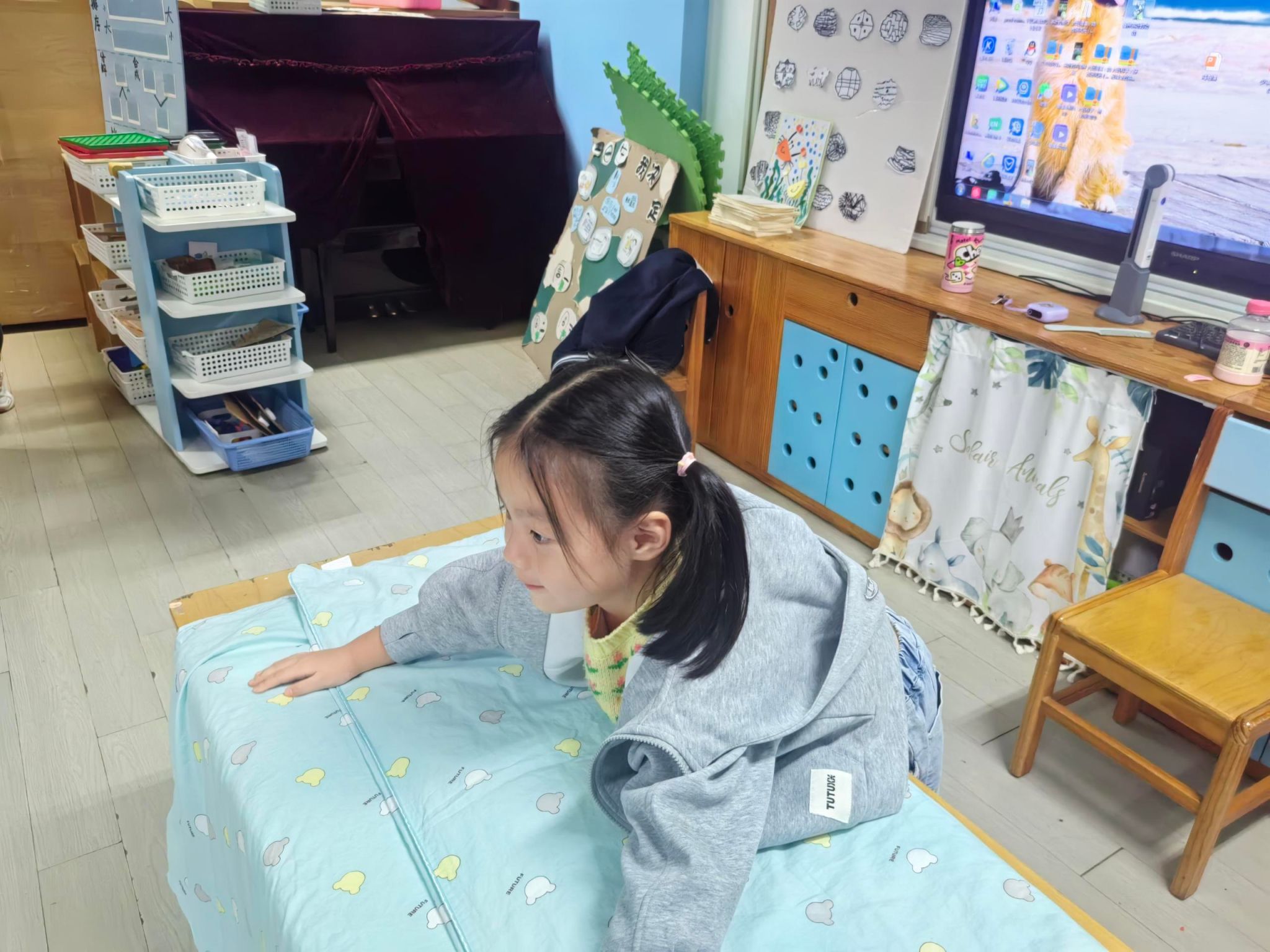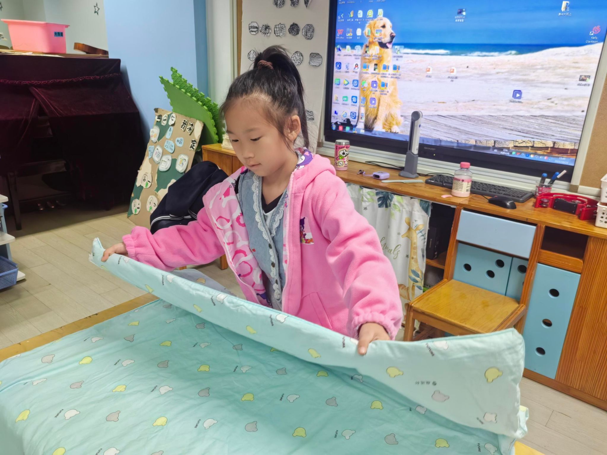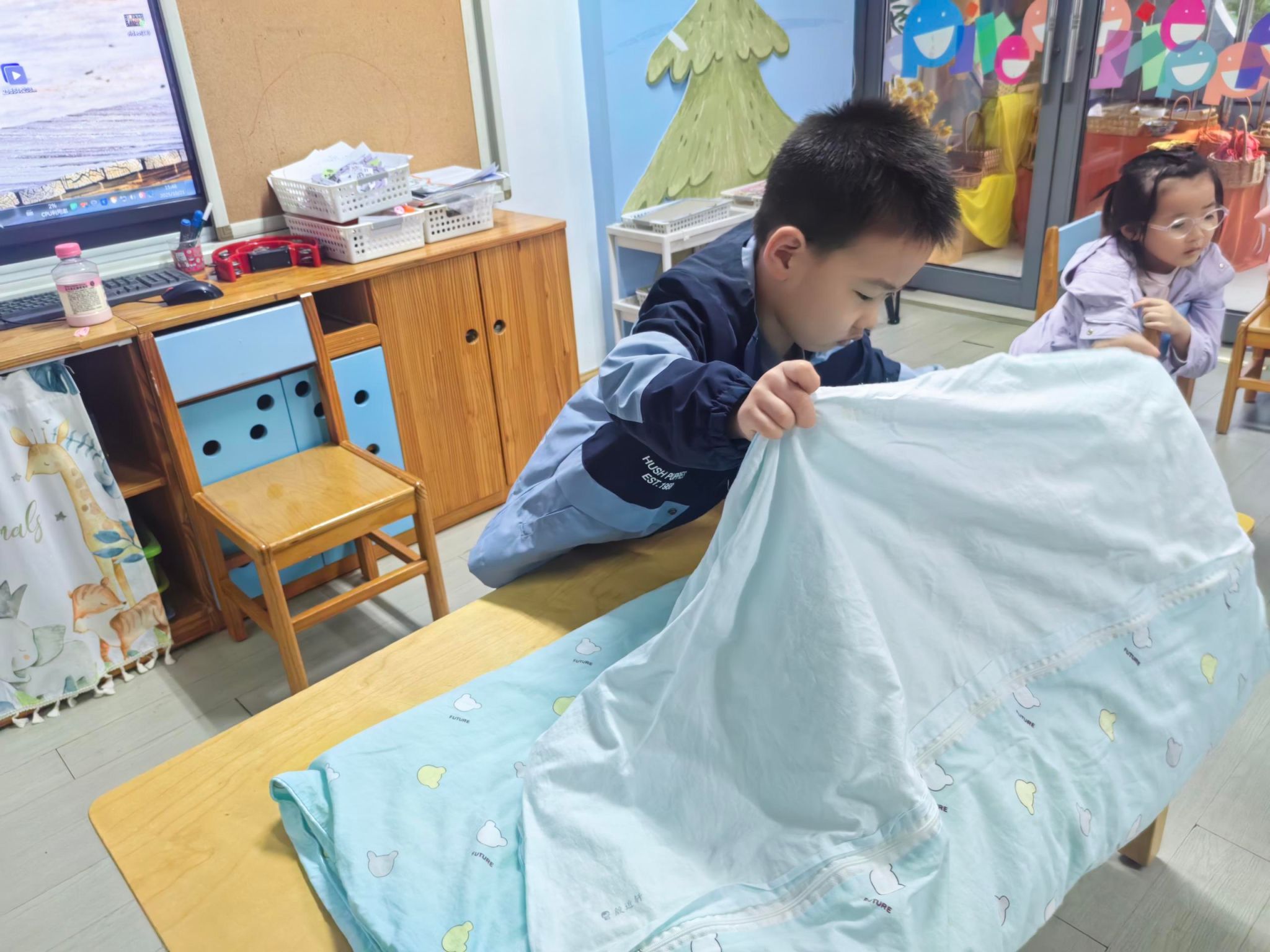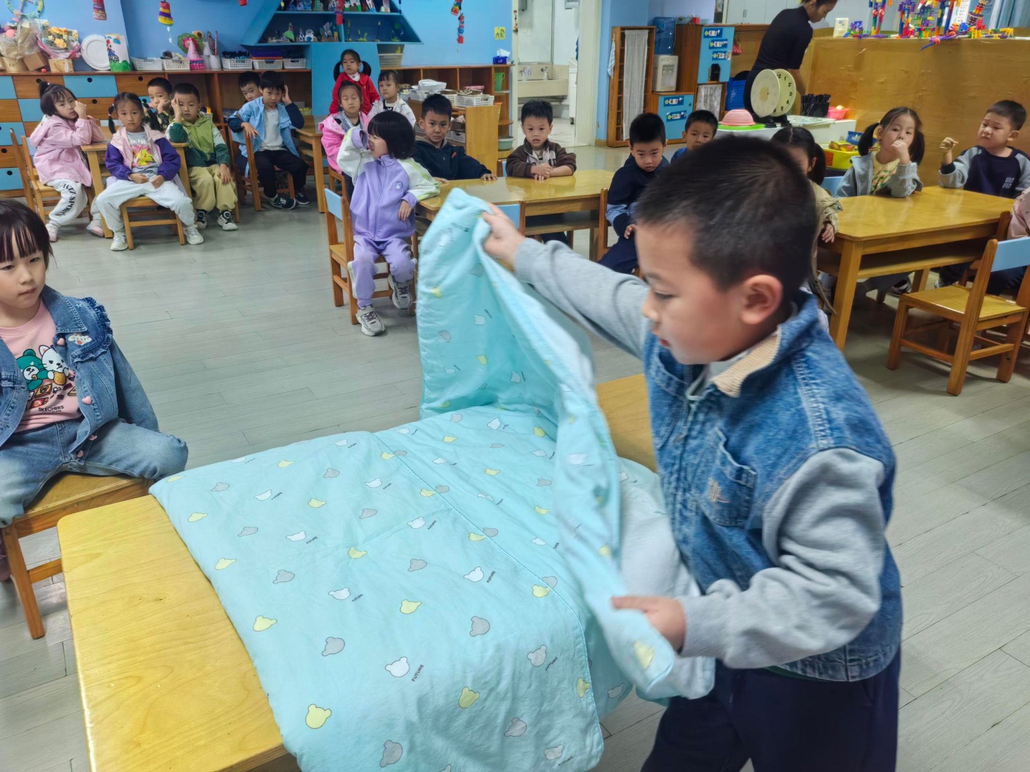 天气变冷了,我们不仅会叠毯子,还会叠厚厚的被子,我们可真是太厉害了!