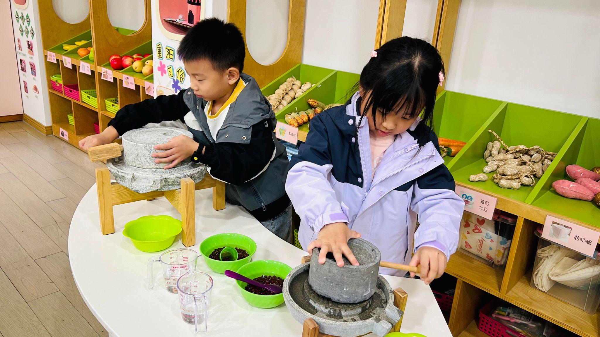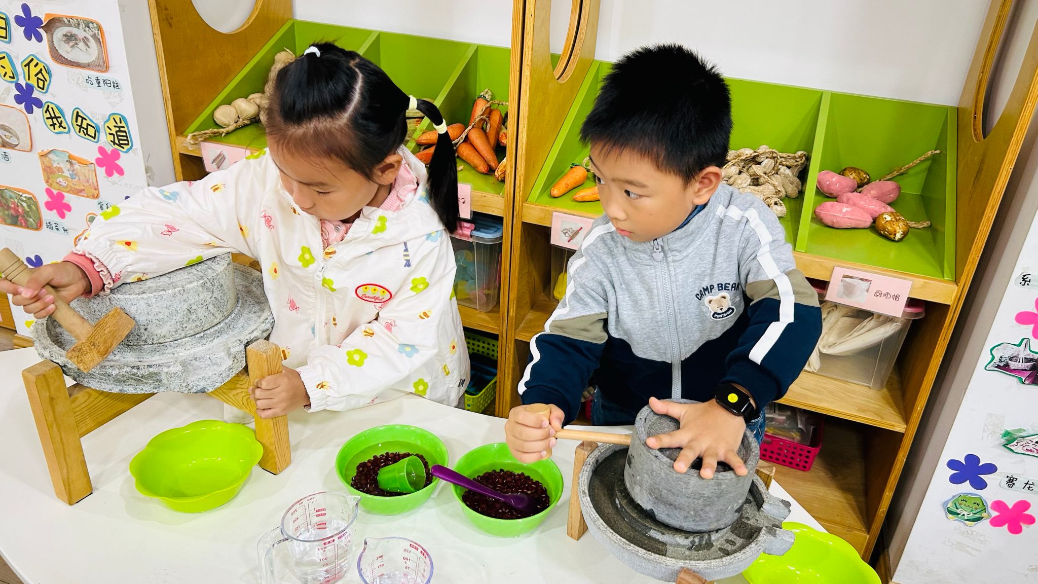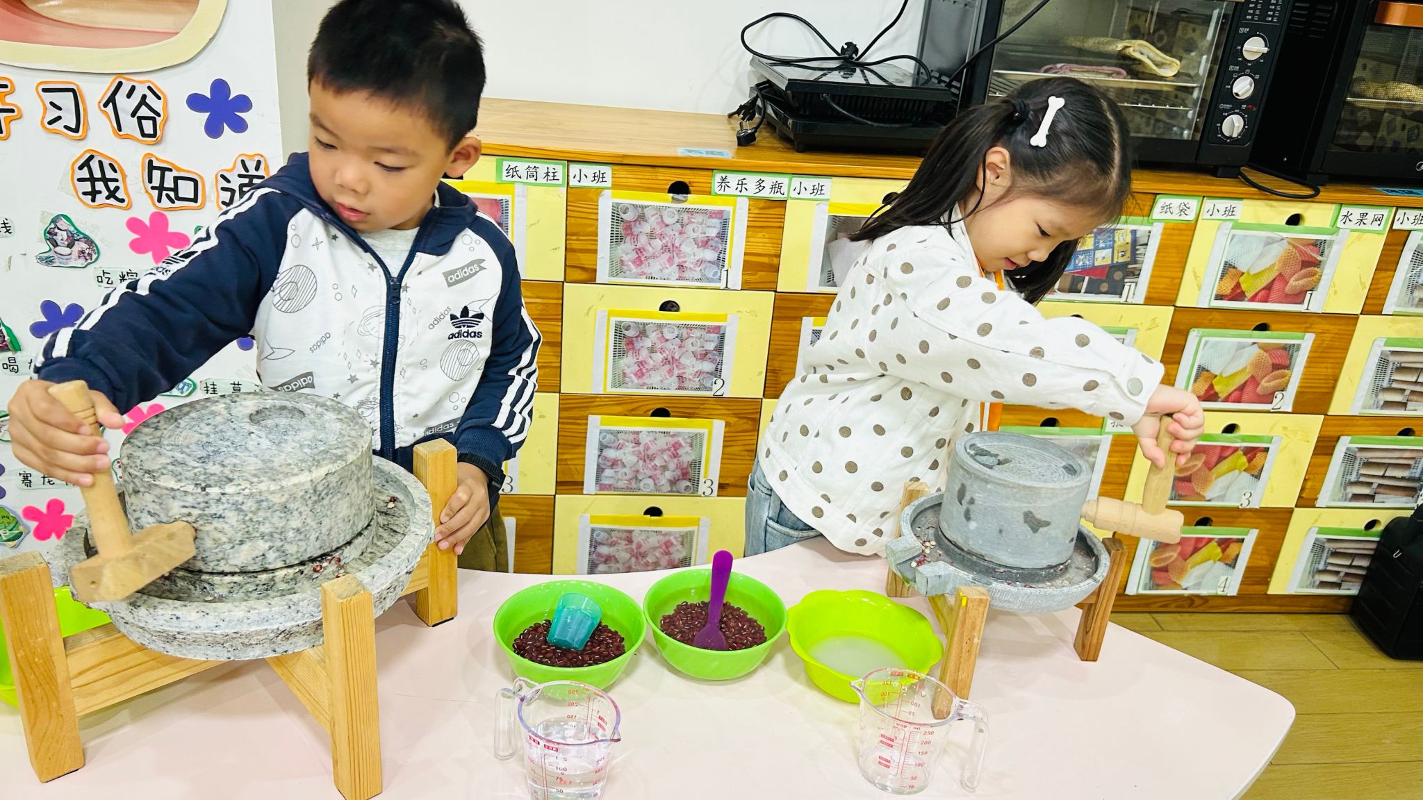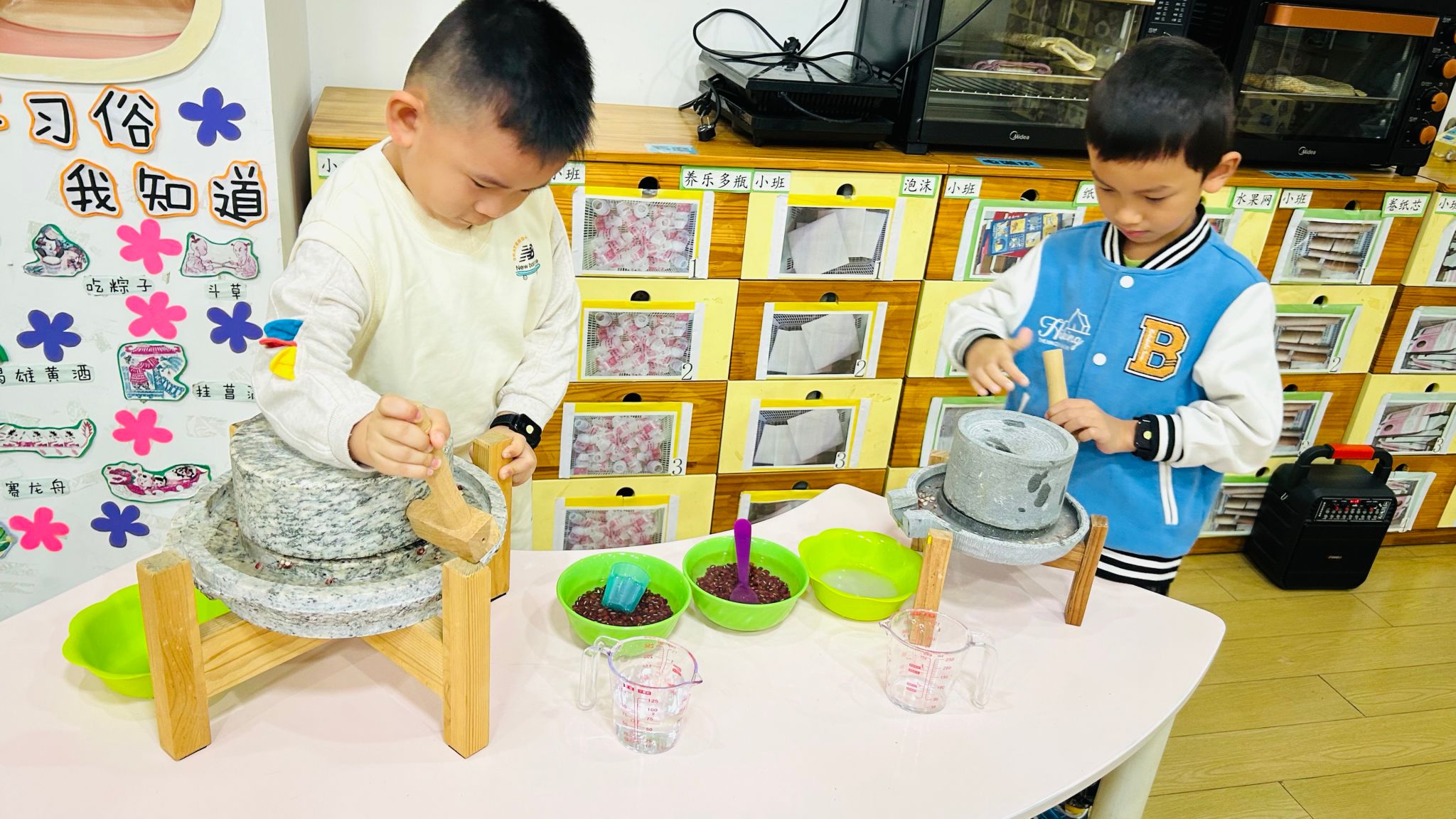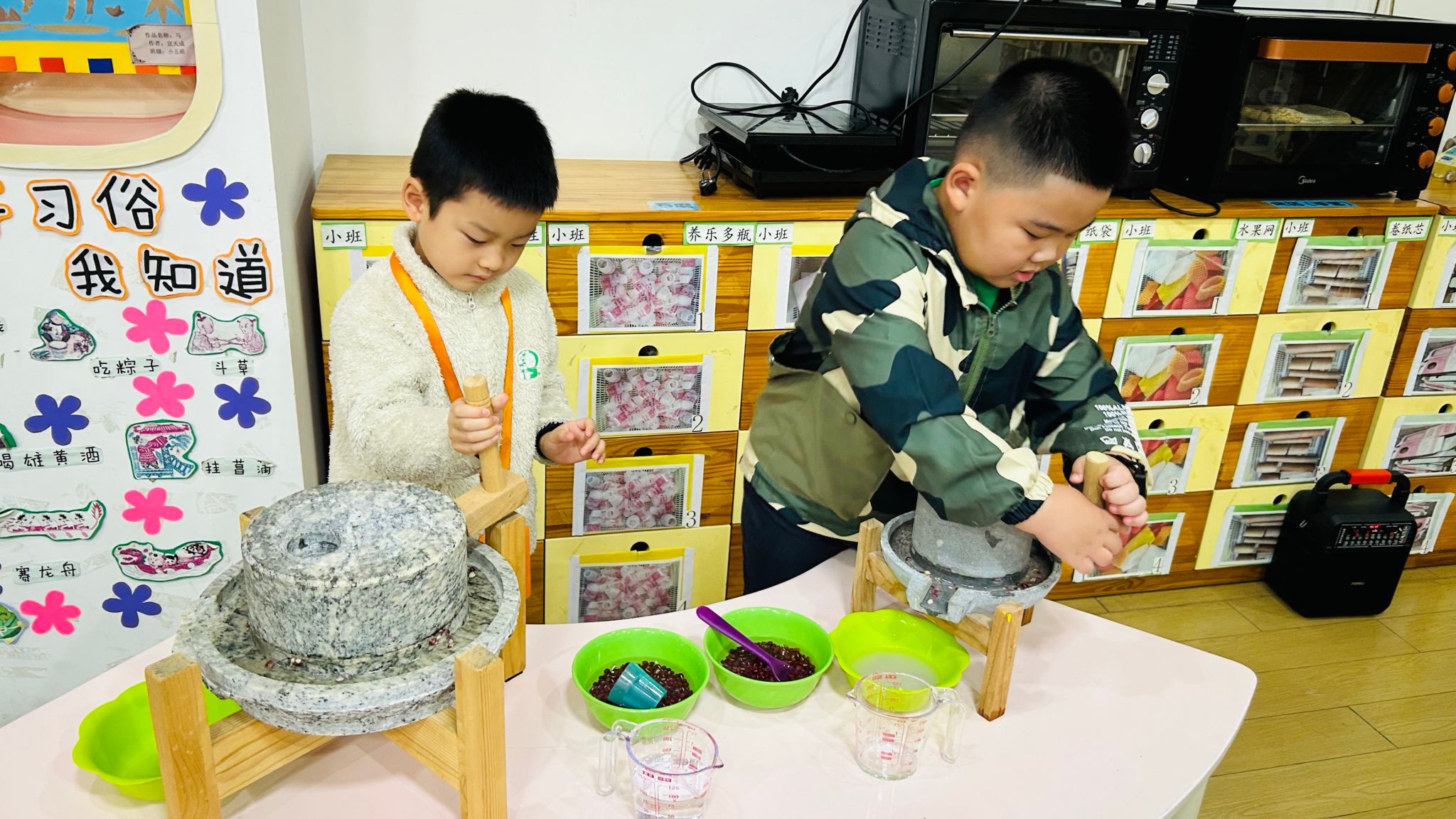 磨盘转动,豆浆沿着磨槽慢慢流出,