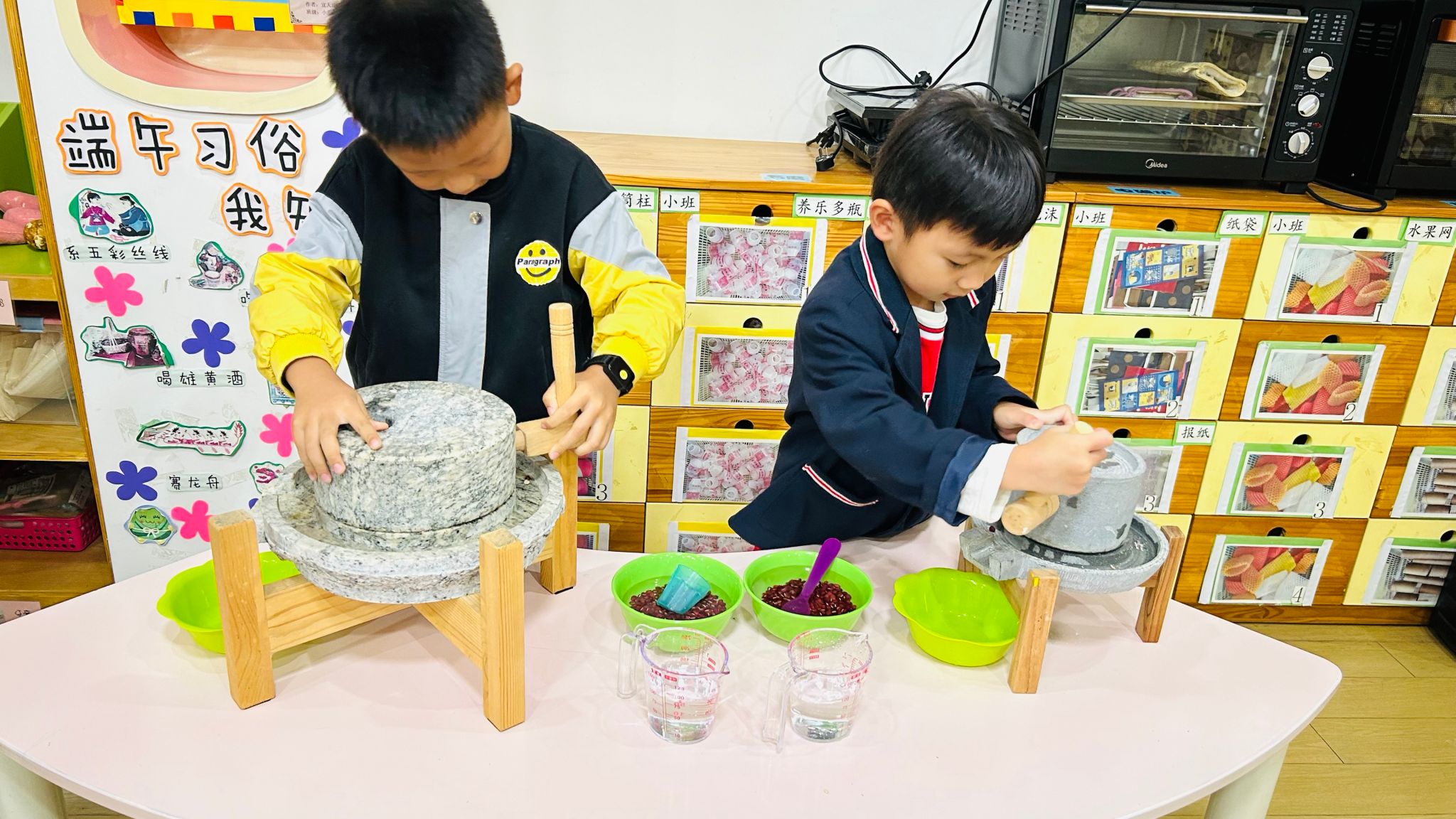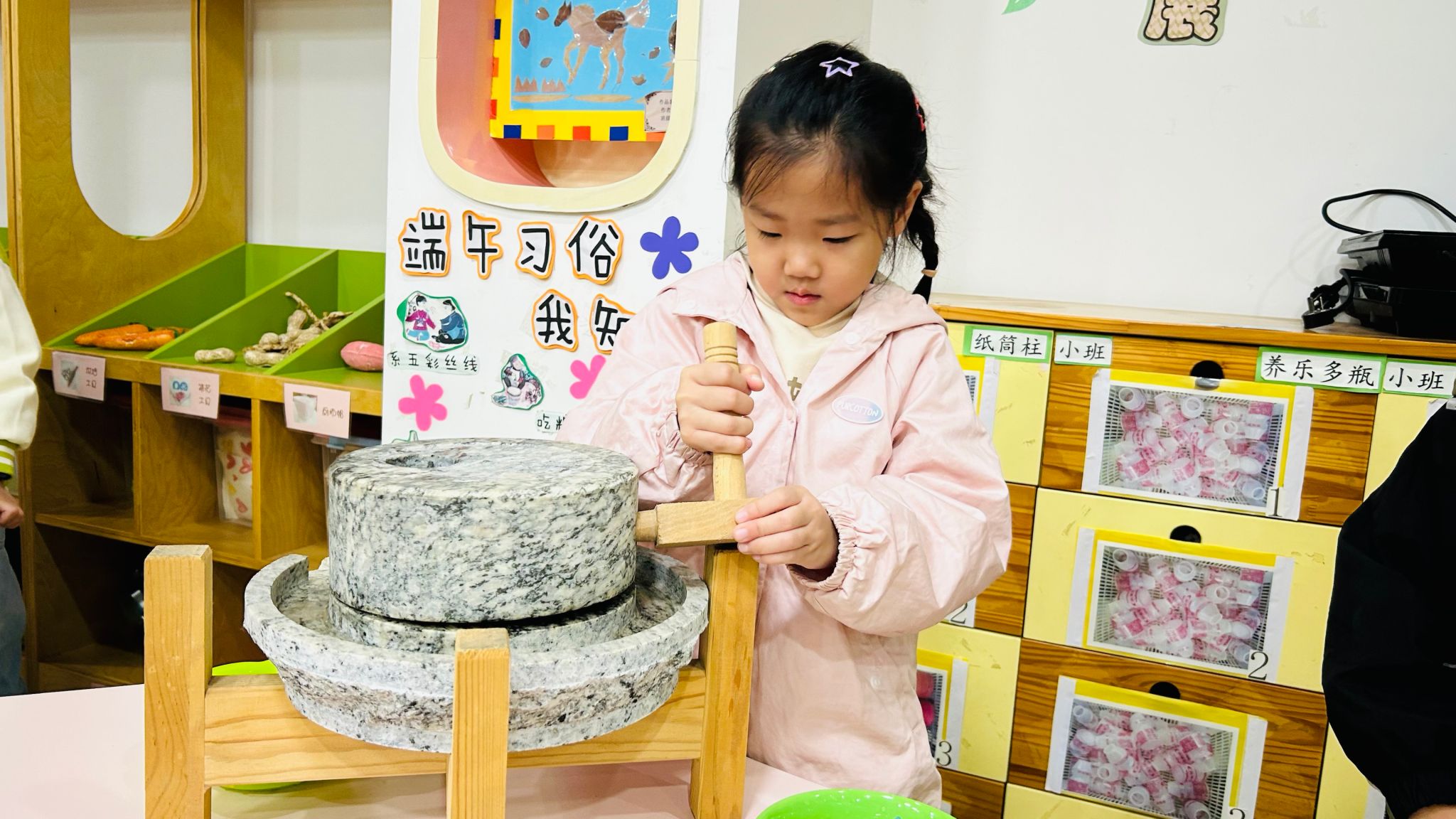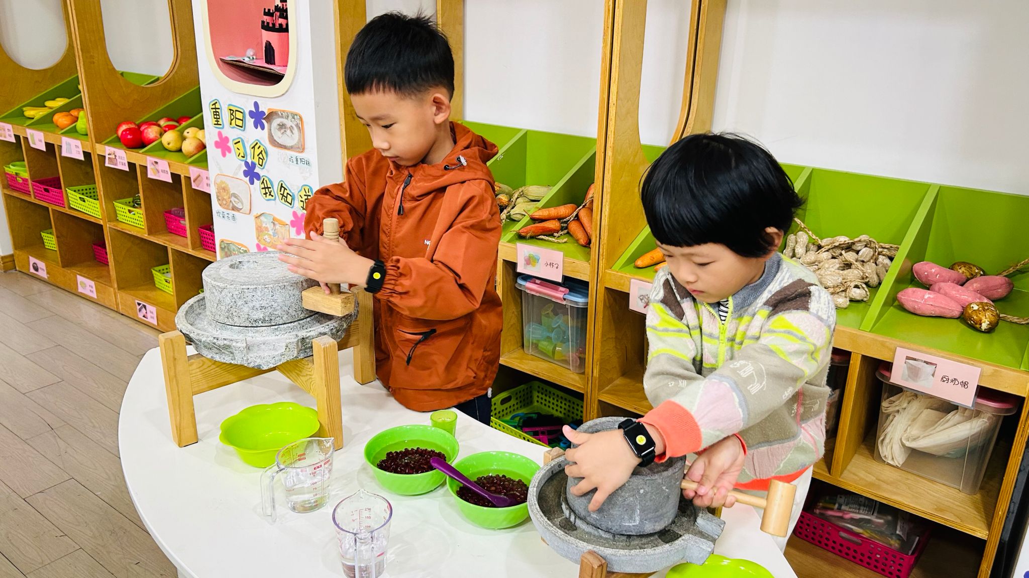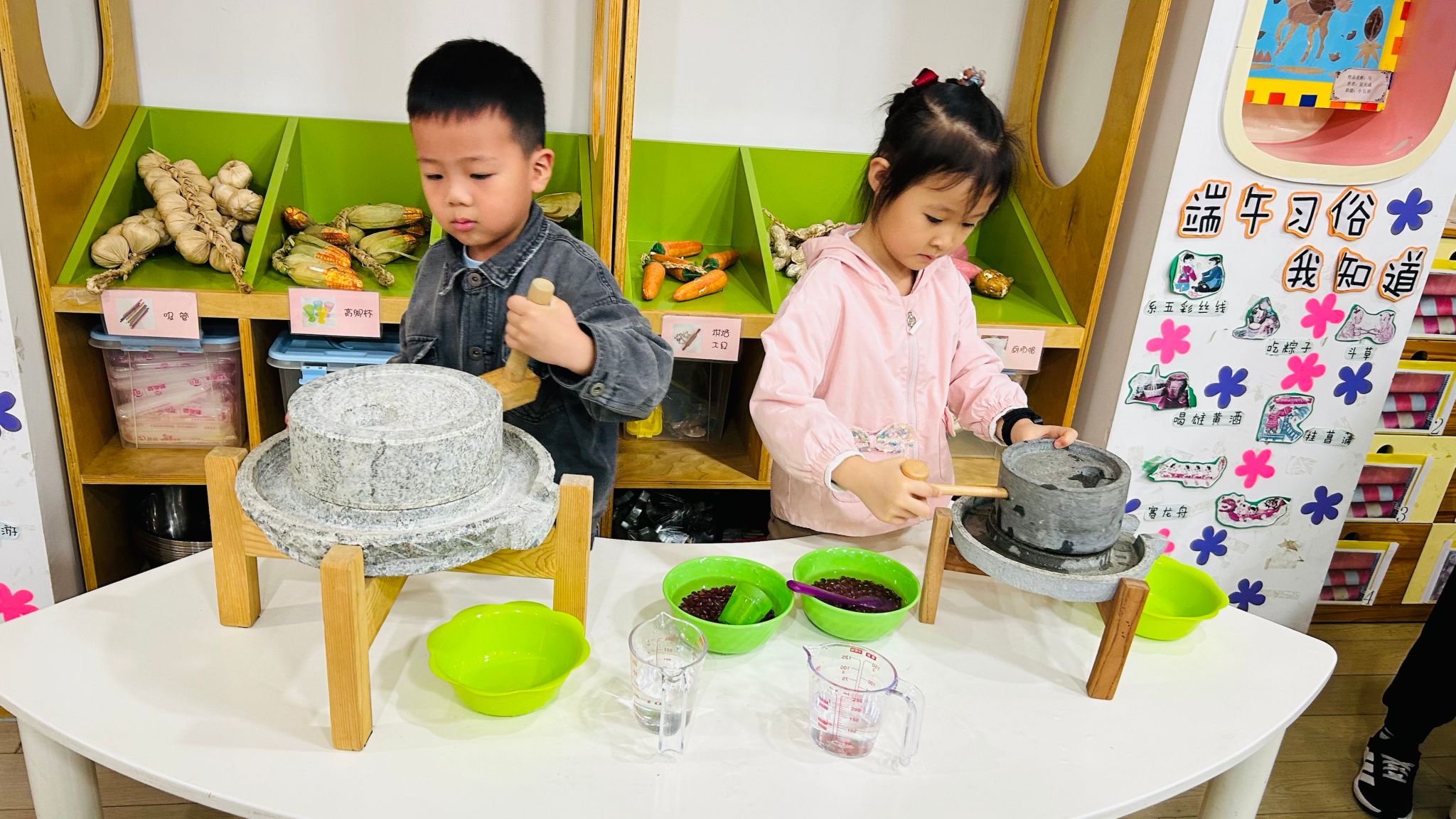 磨盘转动,豆浆沿着磨槽慢慢流出,