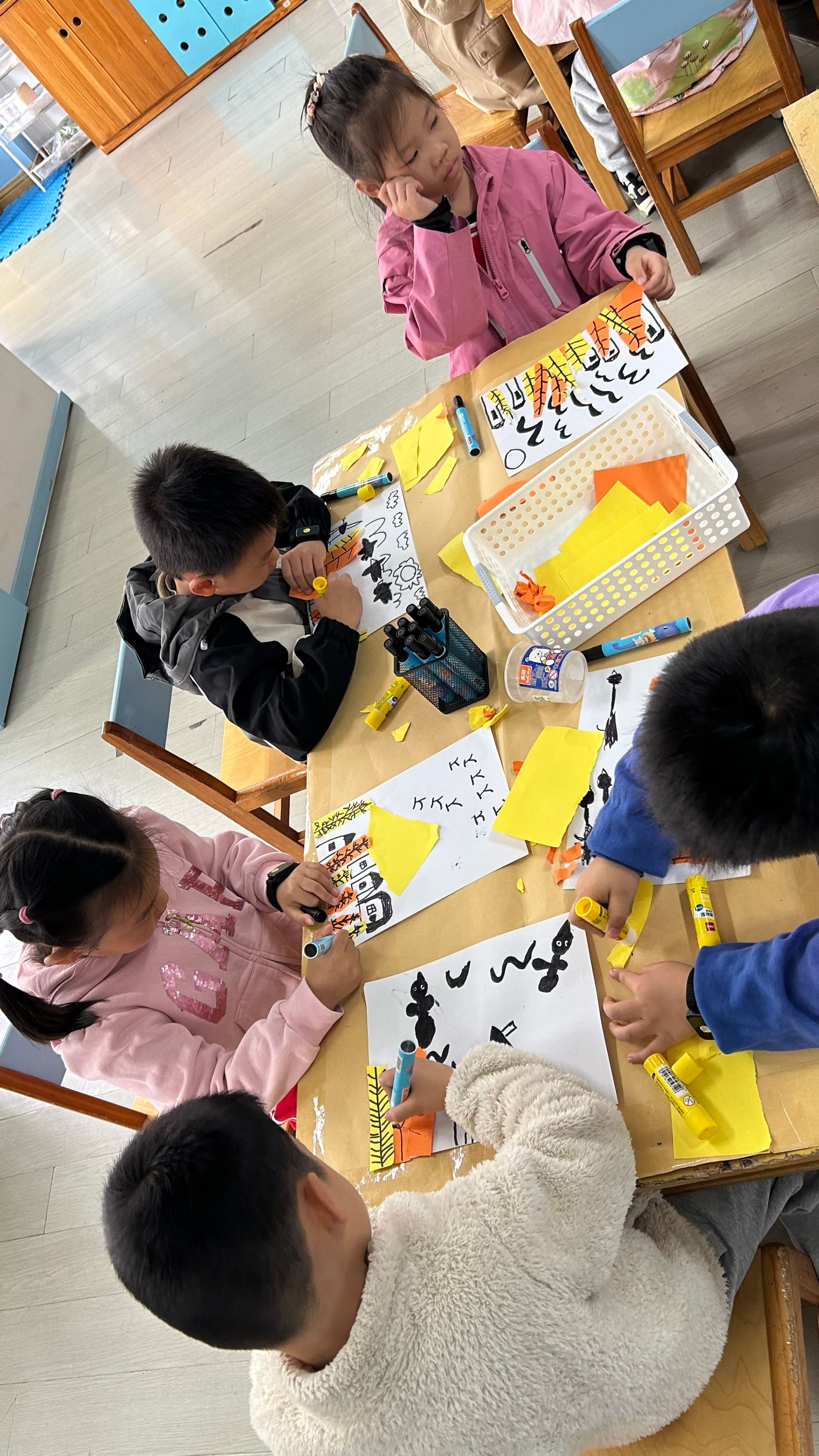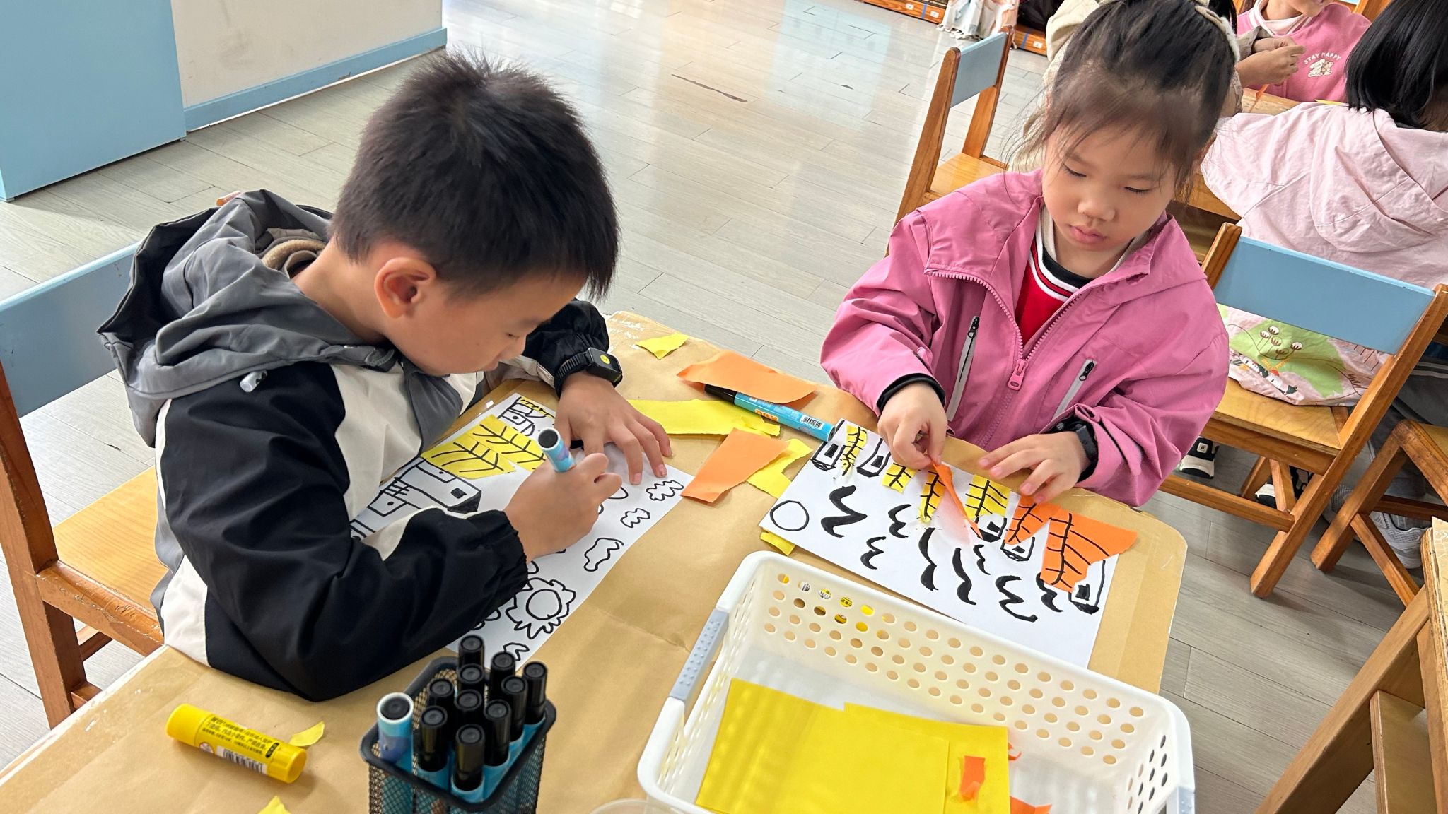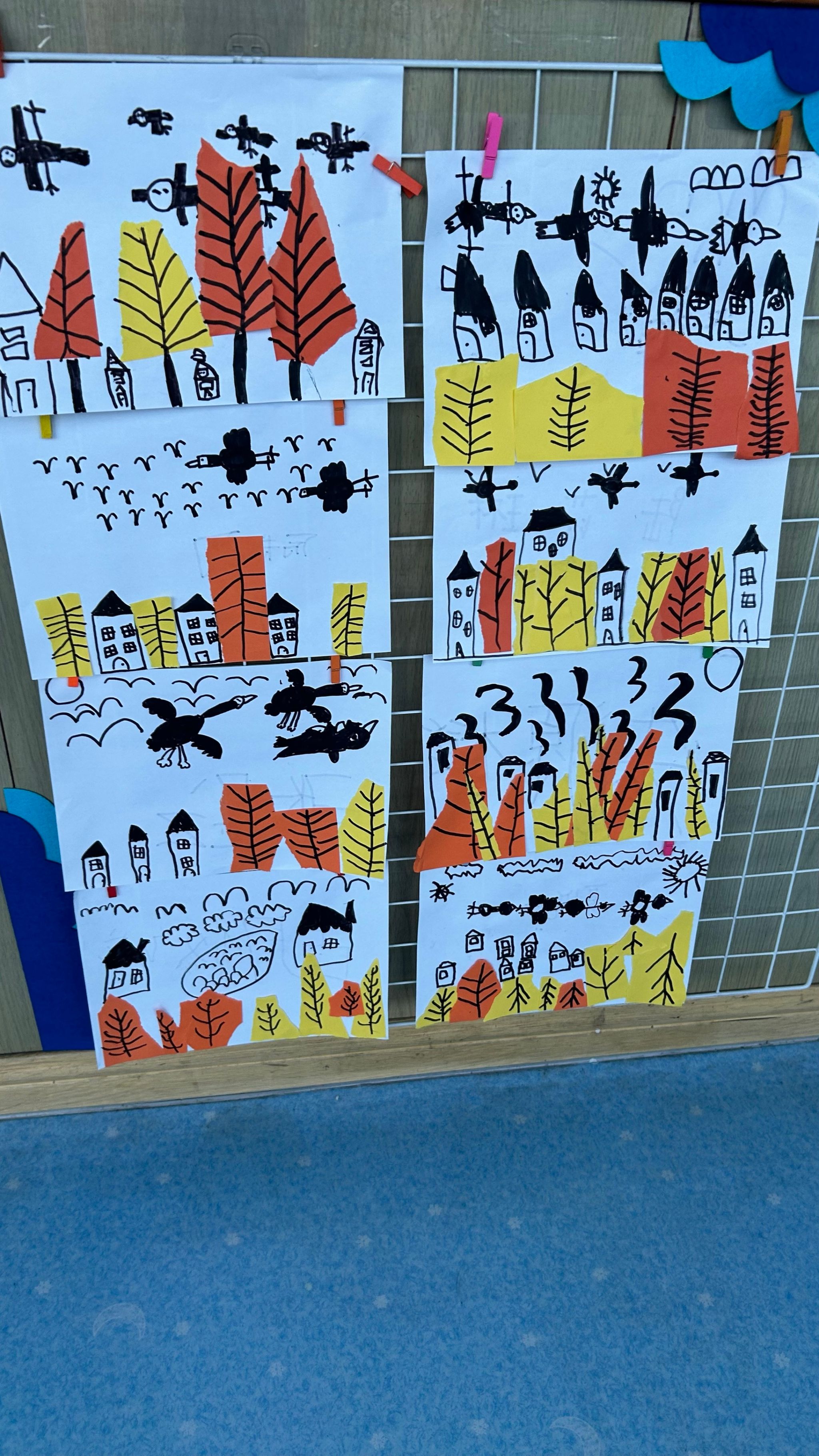 今日,孩子们通过画、撕、粘等方式创作大雁南飞的美好景象。