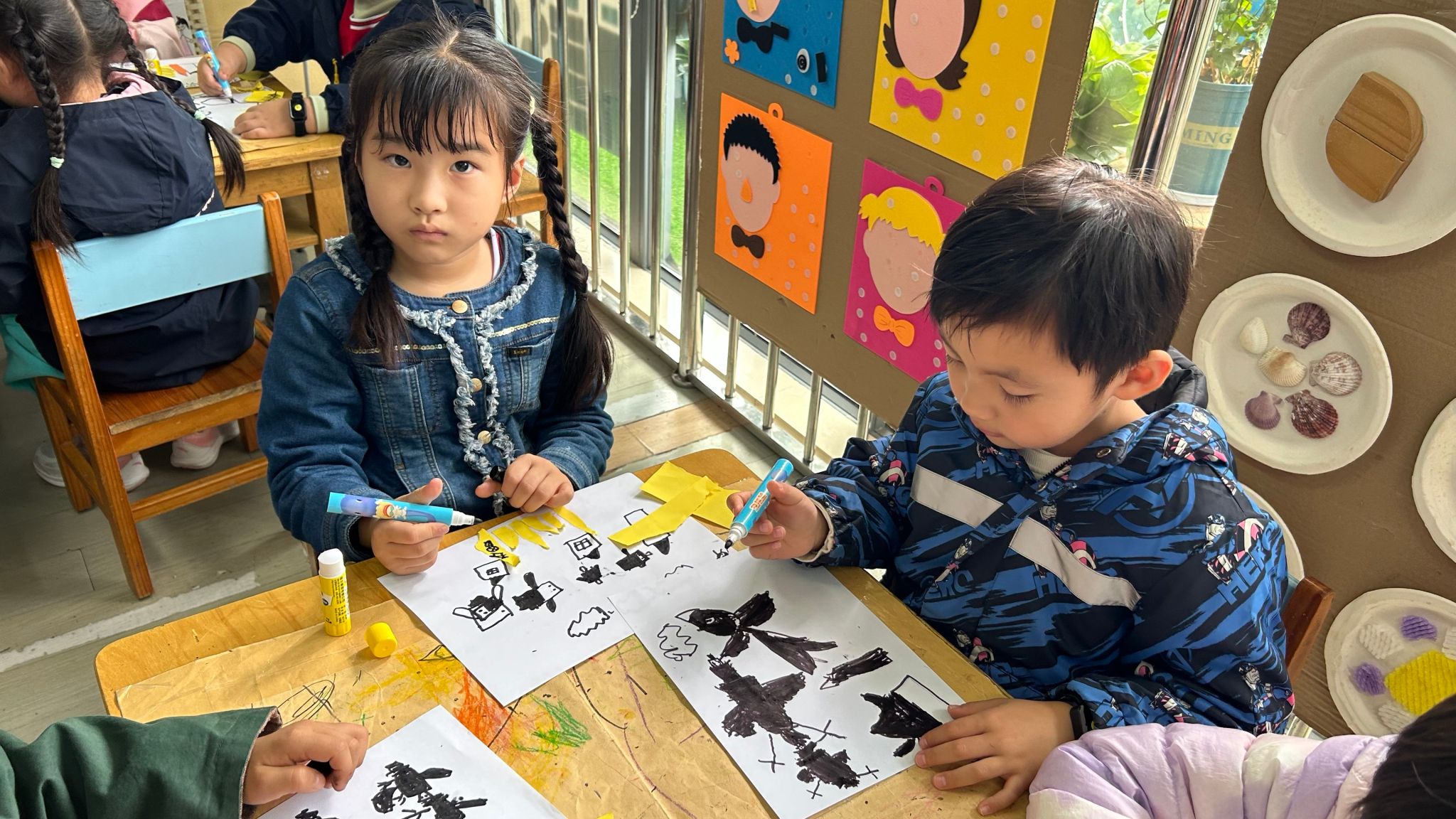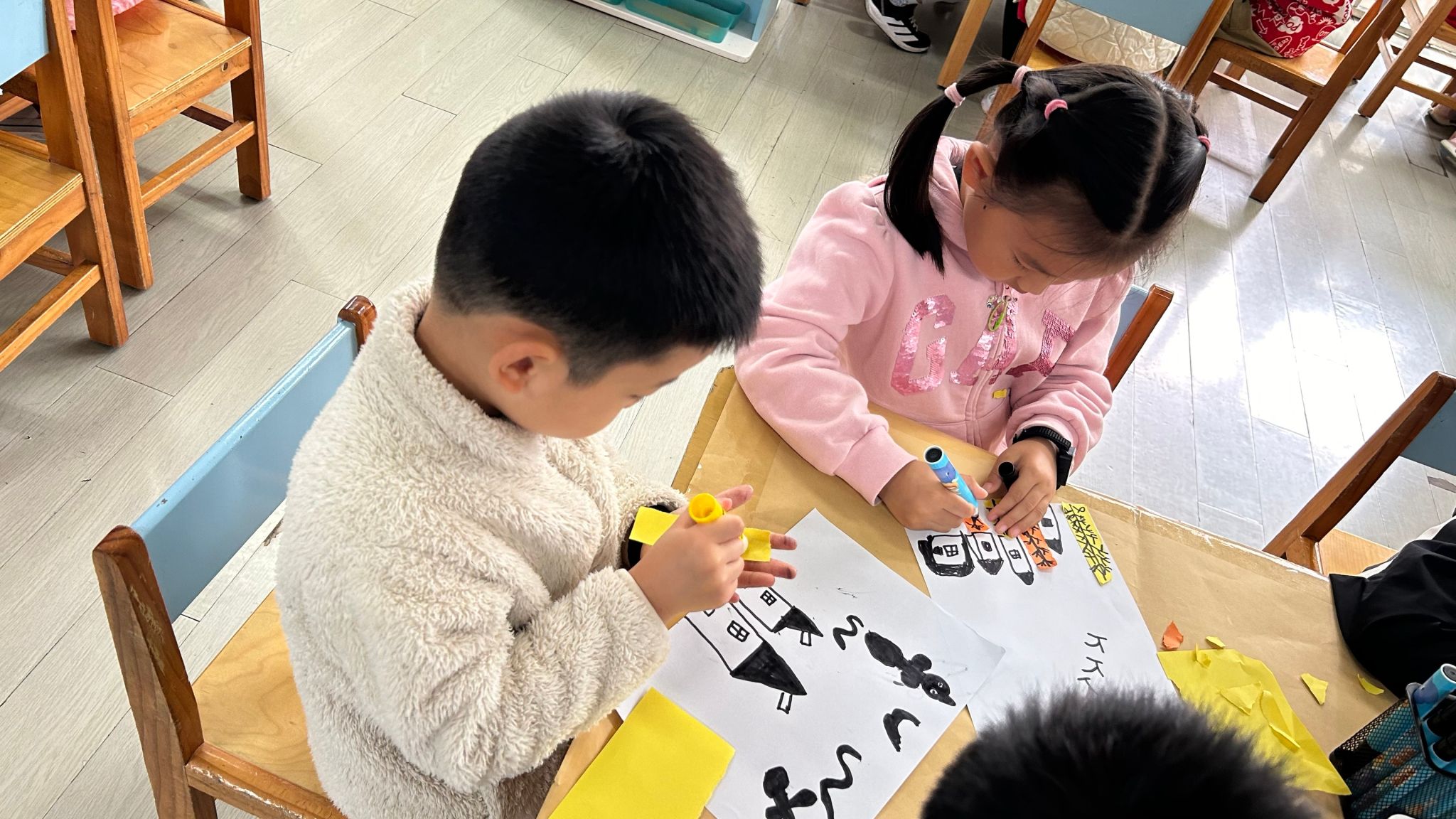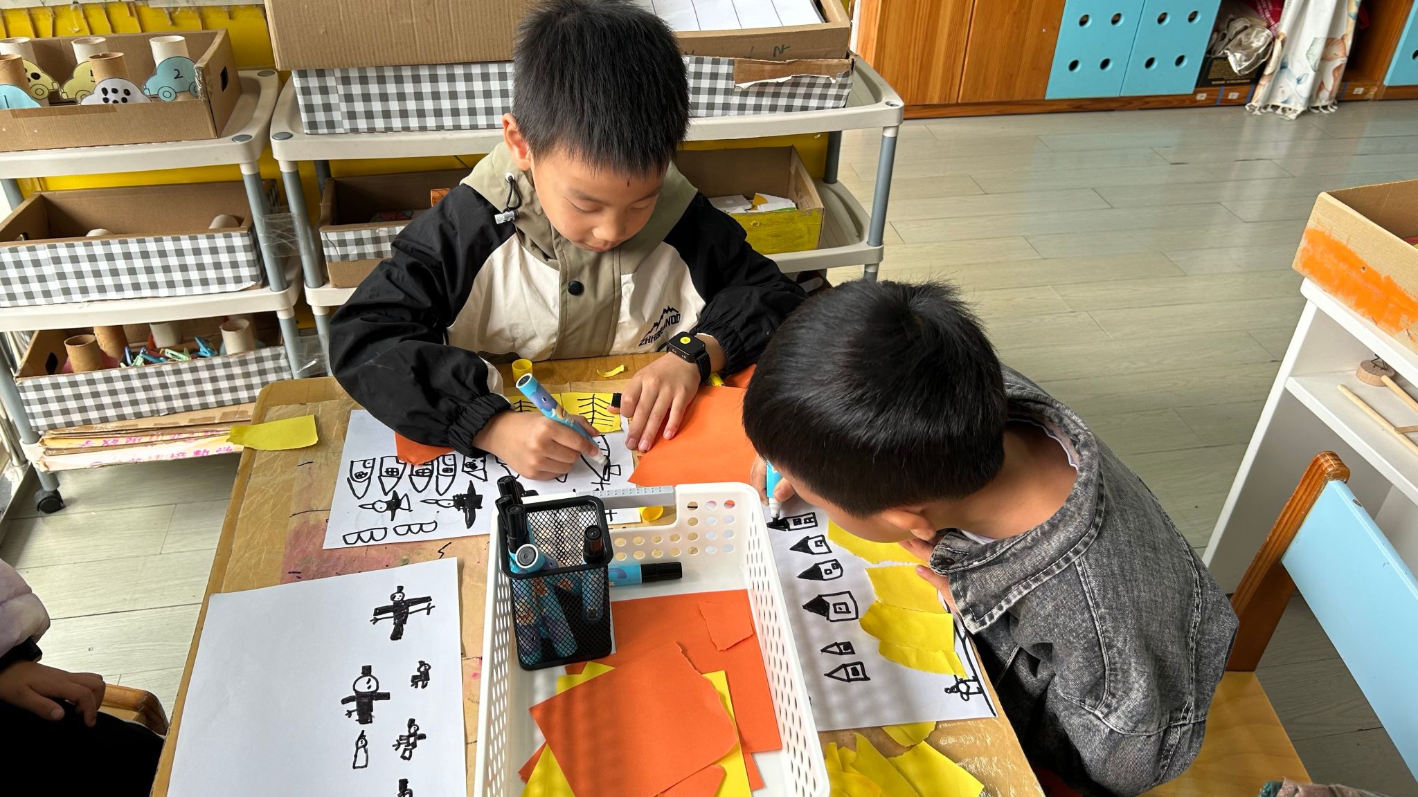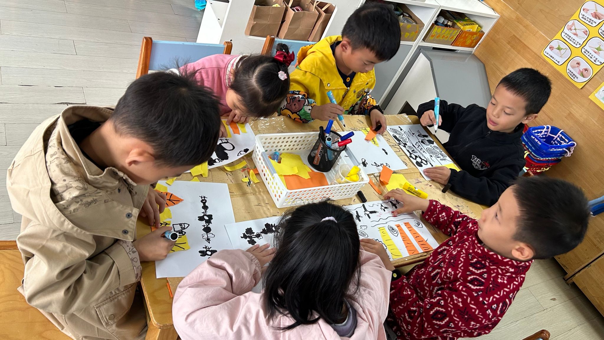 今日,孩子们通过画、撕、粘等方式创作大雁南飞的美好景象。