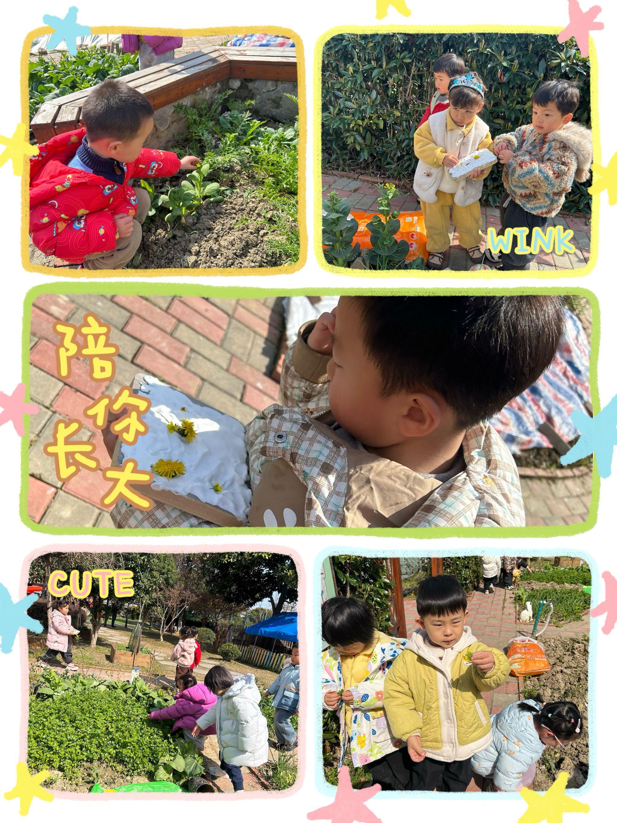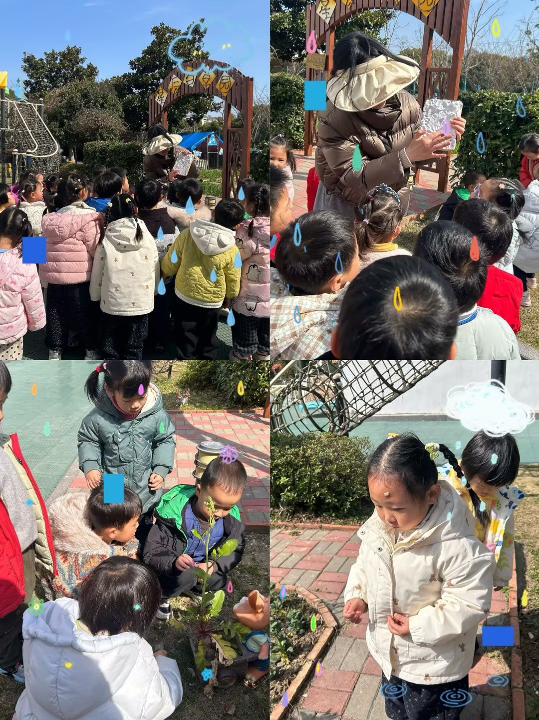 春天在哪里呀?我们在幼儿园里找春天!小草发芽了,花儿开花了,小鸟叽叽喳喳叫,风儿轻轻吹,太阳暖暖照。哇~春天来啦!