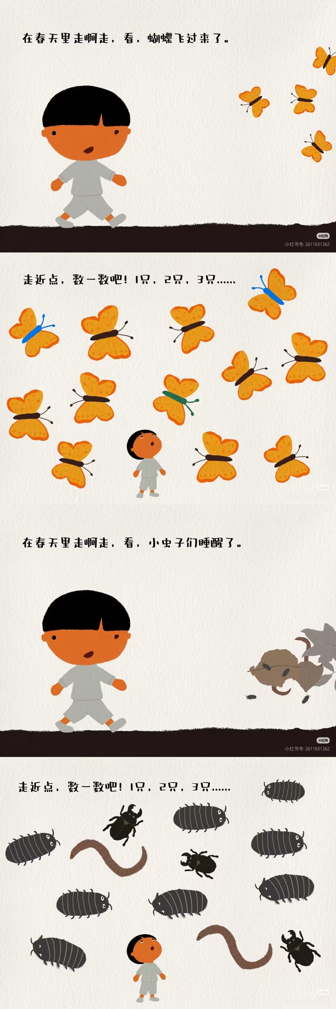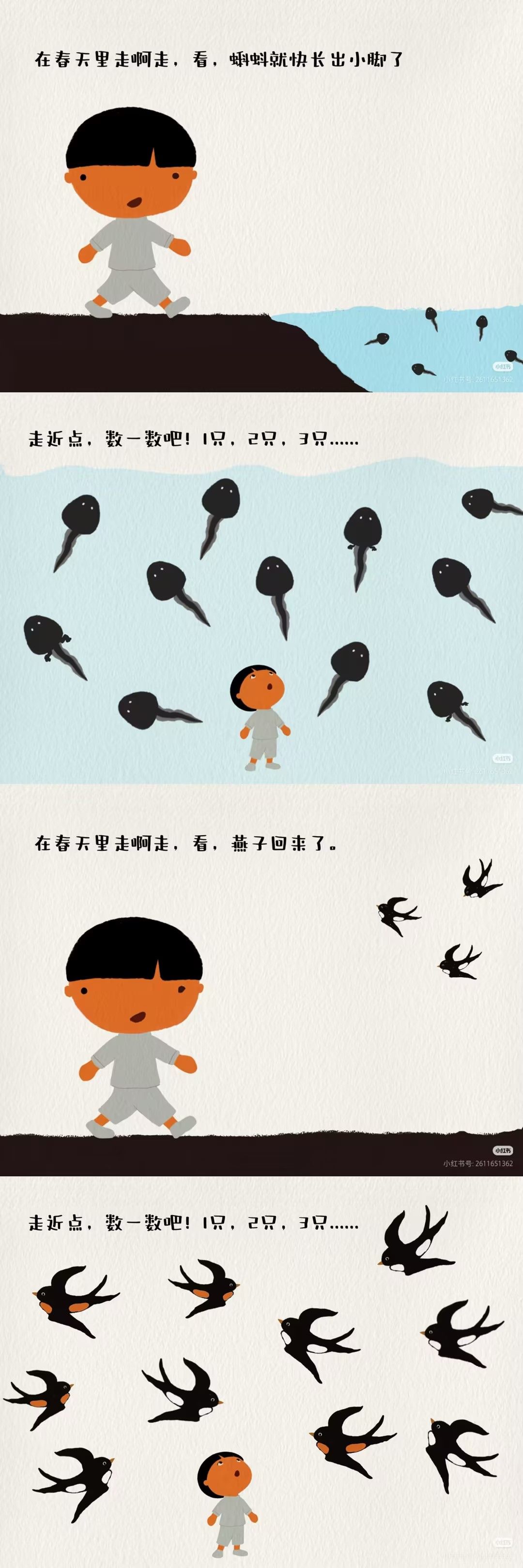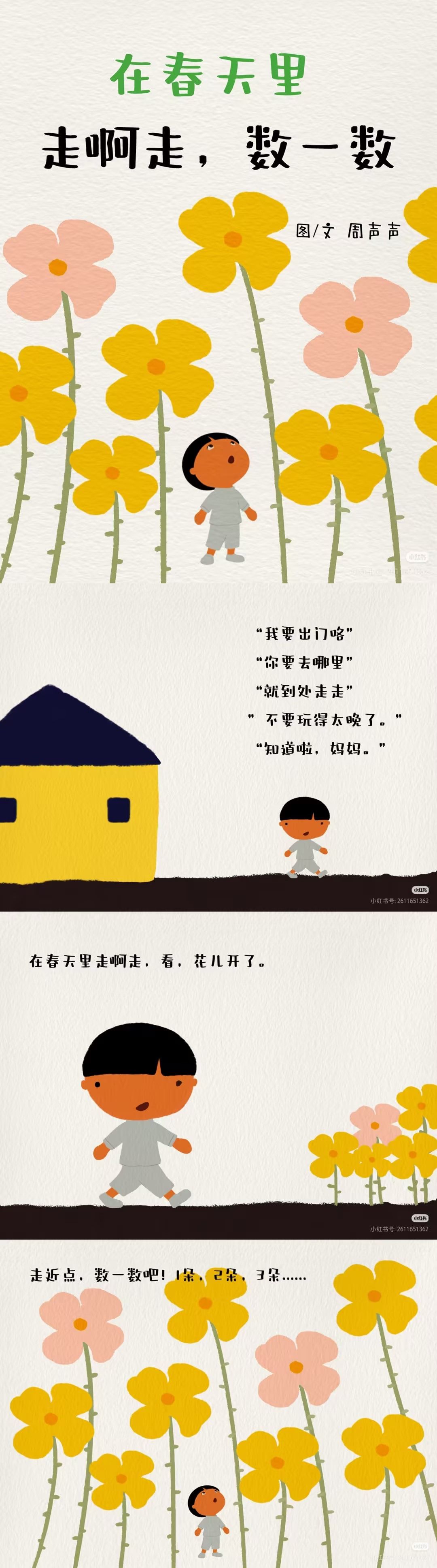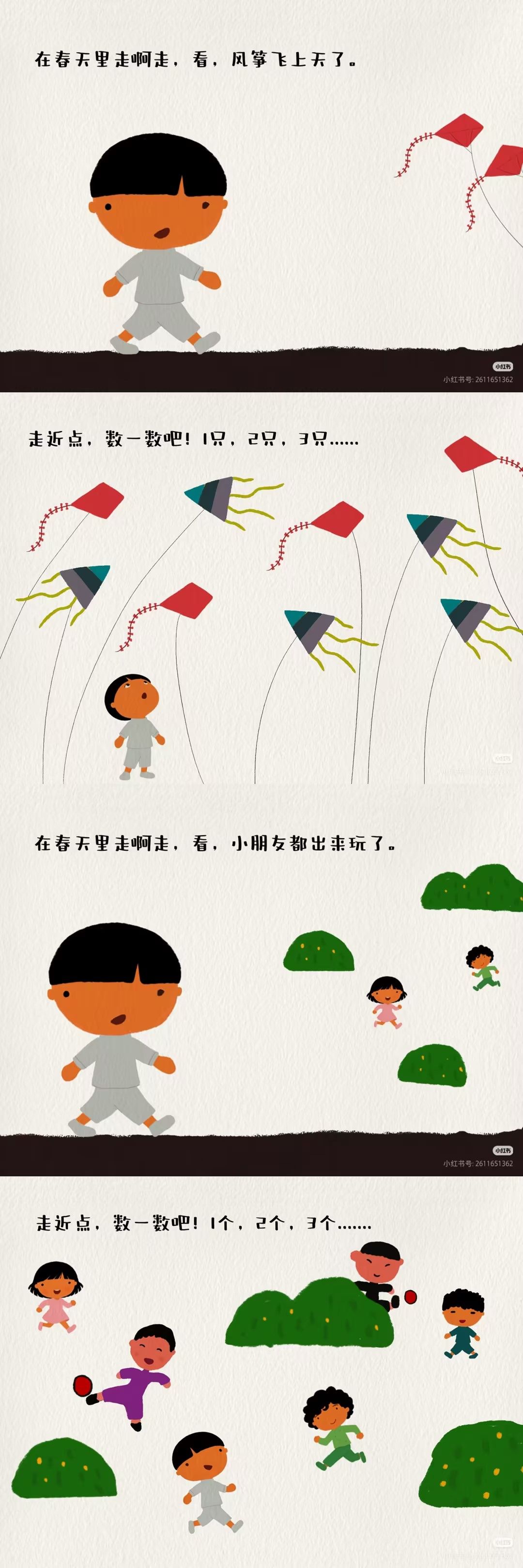 推荐理由:这是一本把春日童趣和数学启蒙完美融合的宝藏绘本!跟着小主人公的脚步,在春日田野、林间小径里走一走,一边邂逅冒芽的小草、飞舞的蝴蝶、枝头的花苞,一边轻松学数数。画面是清新治愈的春日色调,每一页都像把春天搬进了书里,孩子能直观感受春的生机。