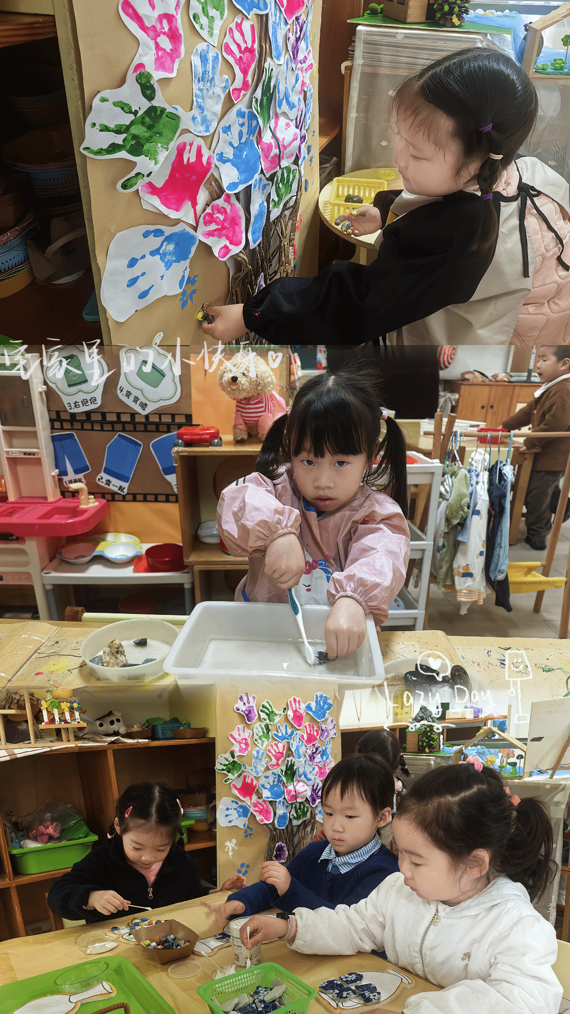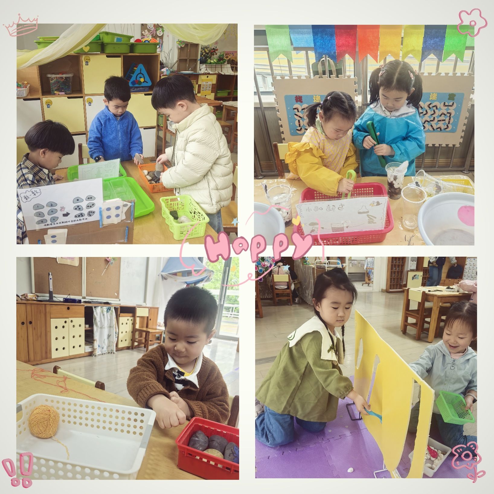 孩子们带来了各种各样的石头,今天在每个区角里孩子们和石头一起做游戏,探索石头的乐趣。