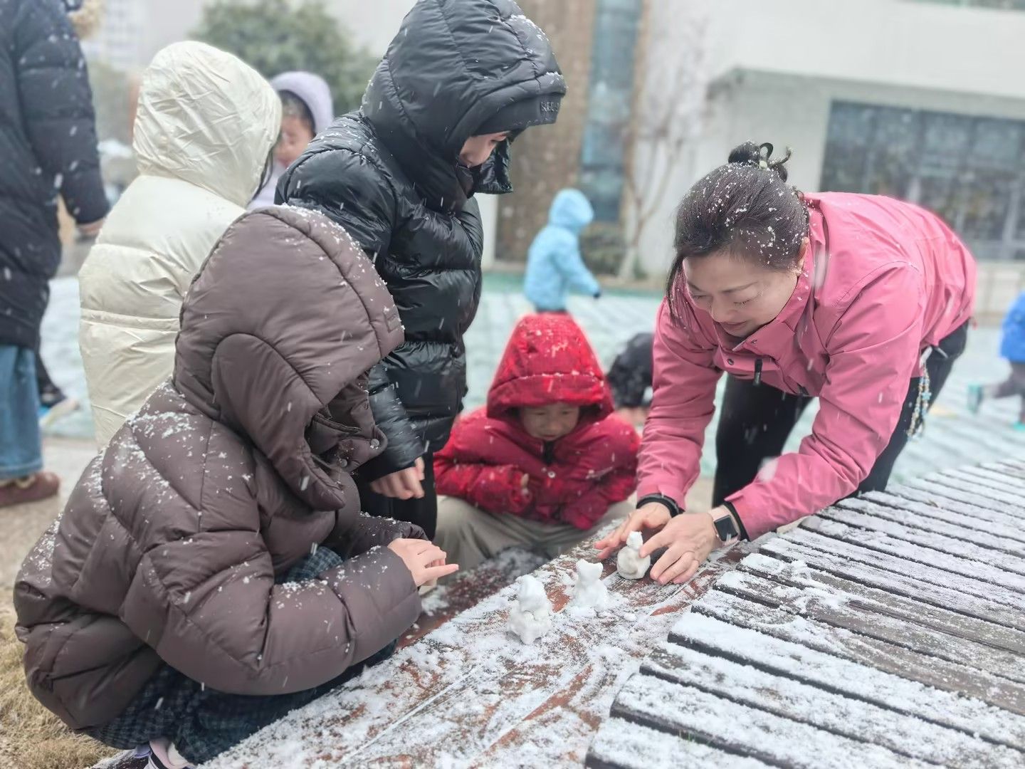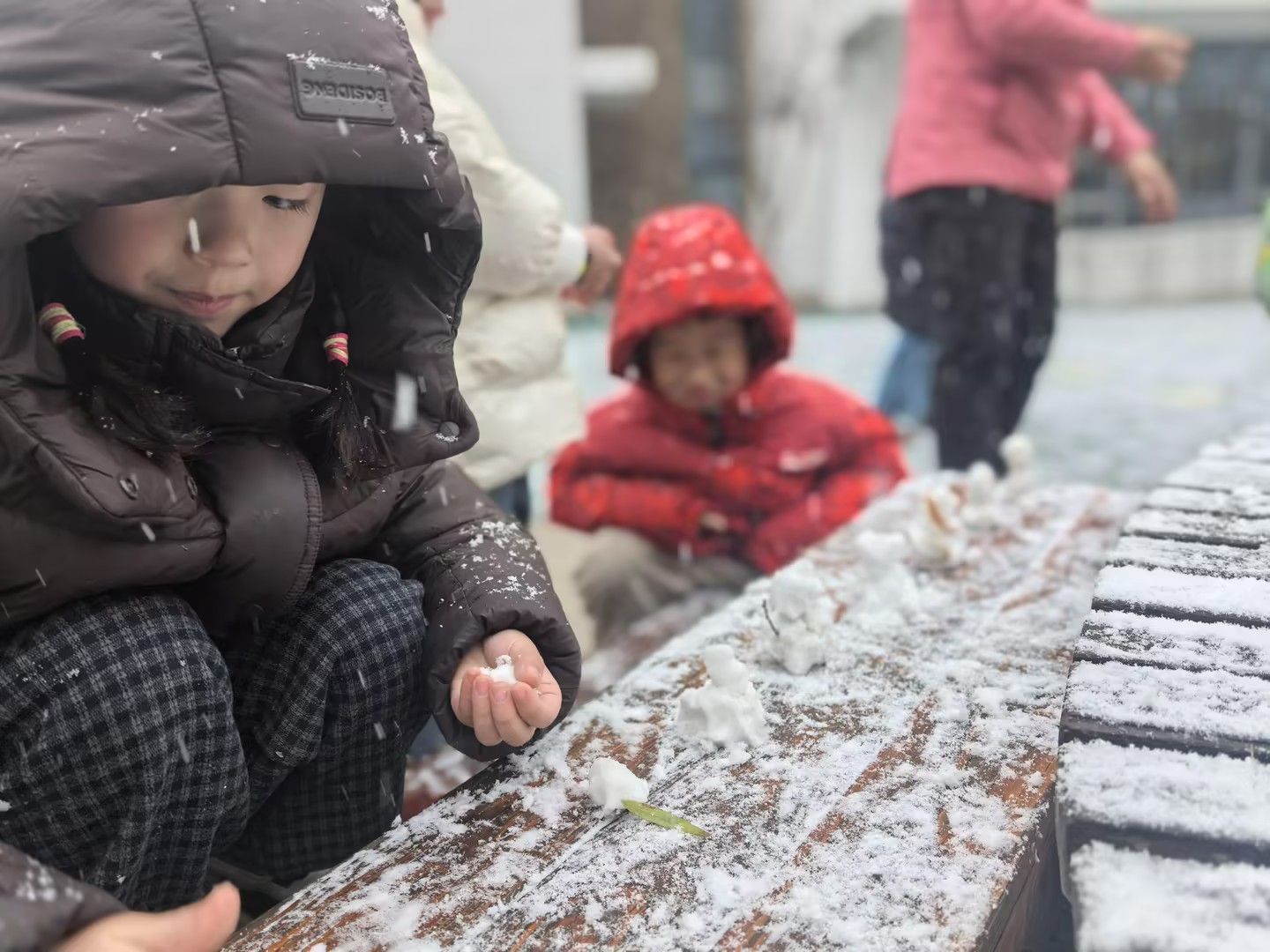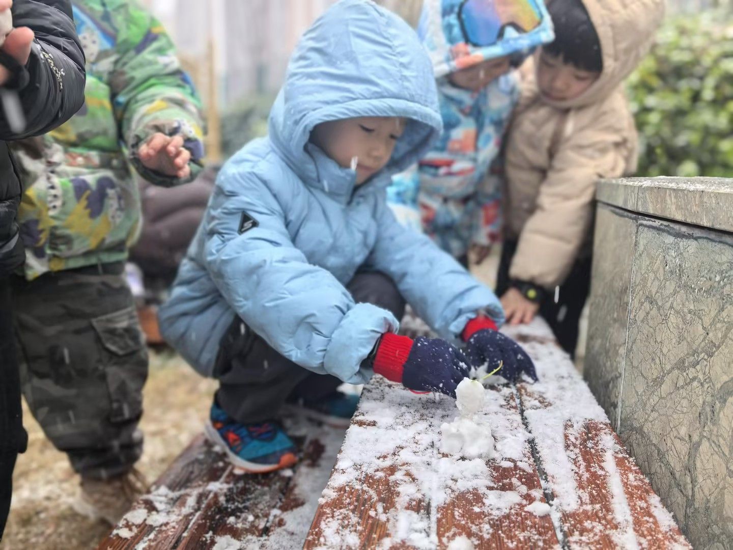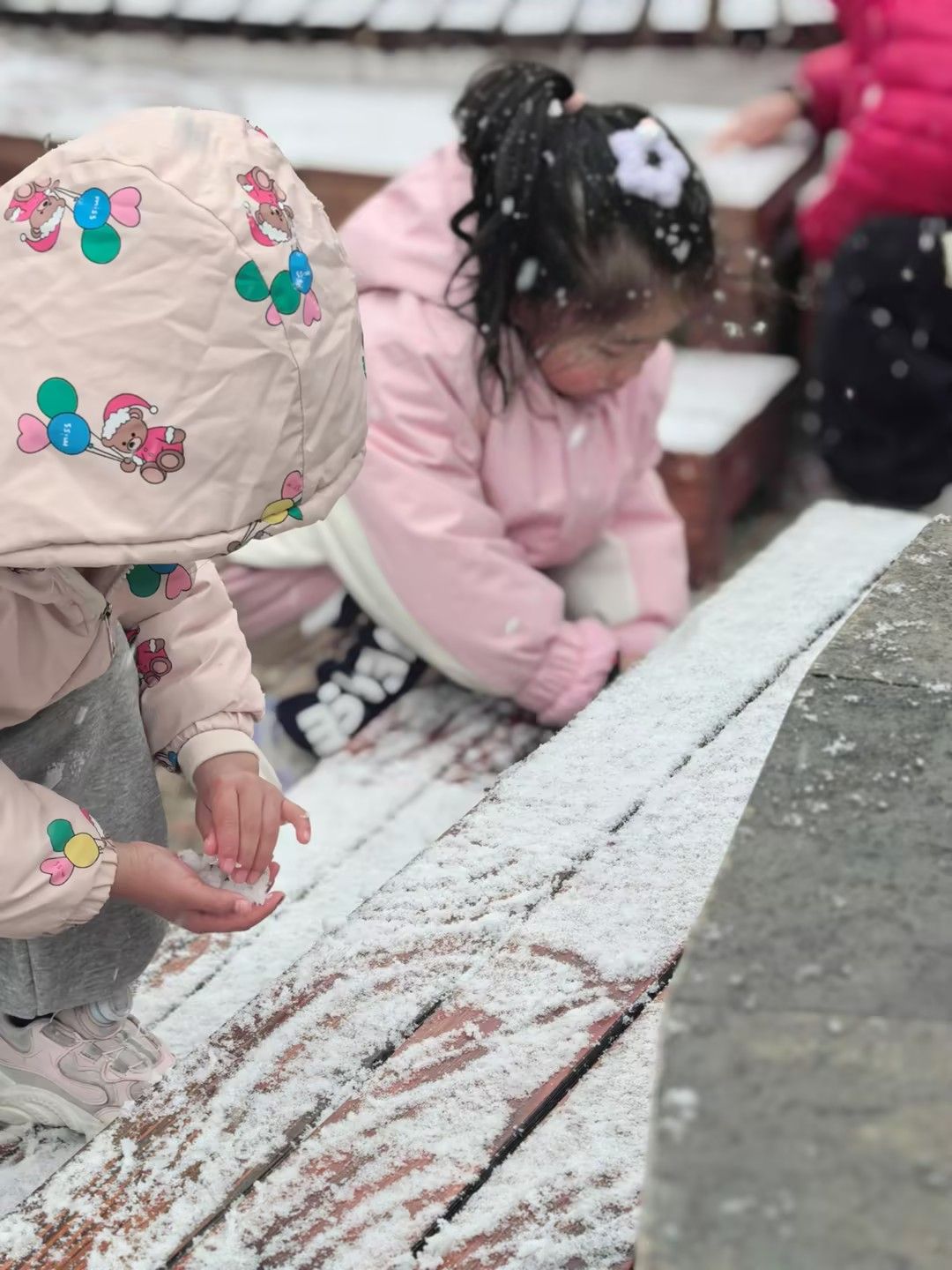 孩子们身着温暖的冬装,像一群快乐的小精灵涌入雪地。他们伸出小手迎接飘落的雪花,感受冬日的问候。在老师的引导和陪伴下,孩子们专注地团雪球、堆雪堆,发挥天马行空的想象力,合作塑造出一个个独具特色的“迷你雪人”。有的为雪人戴上彩纸做的小帽子,有的找来小石子当眼睛,每个作品都凝结着孩子们的创意与喜悦。活动现场,惊呼声、欢笑声与互助声此起彼伏,寒冷的天气完全被孩子们高涨的热情所驱散。