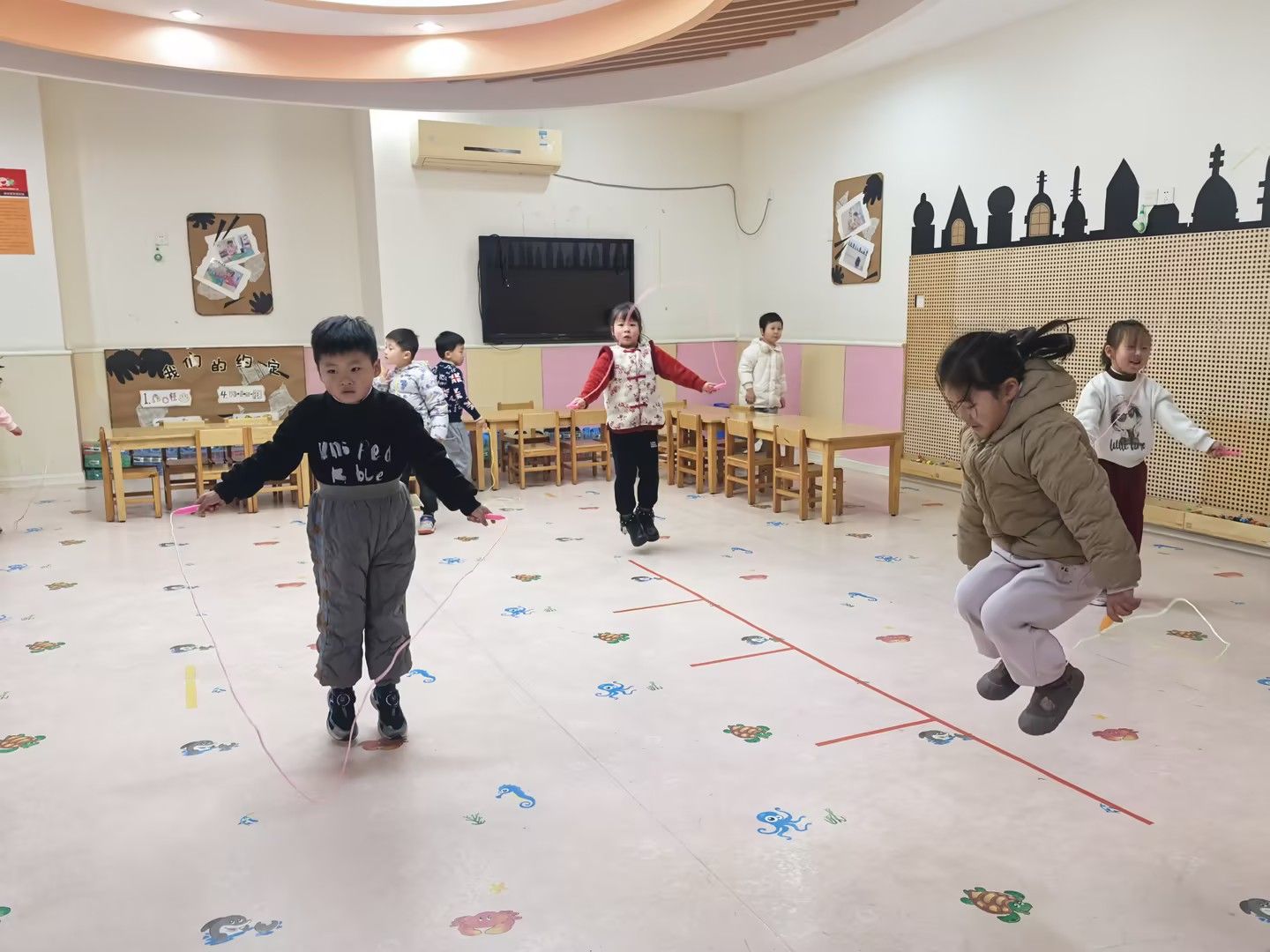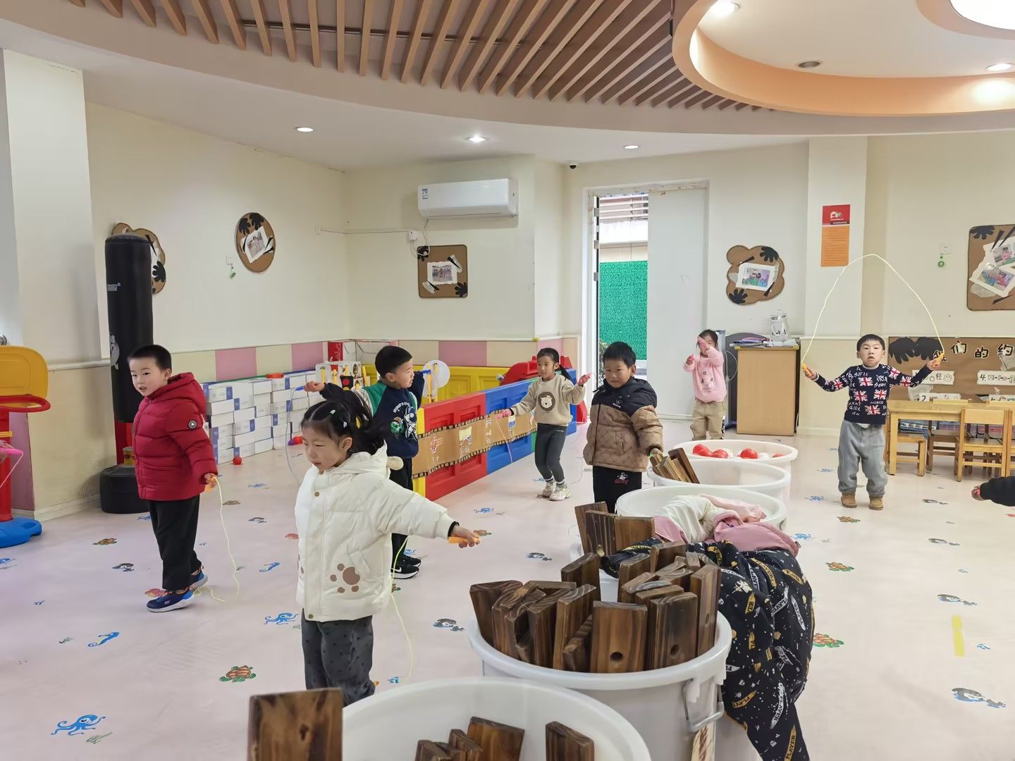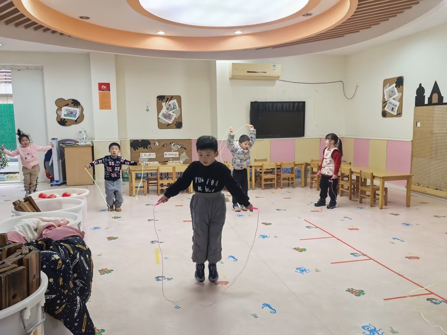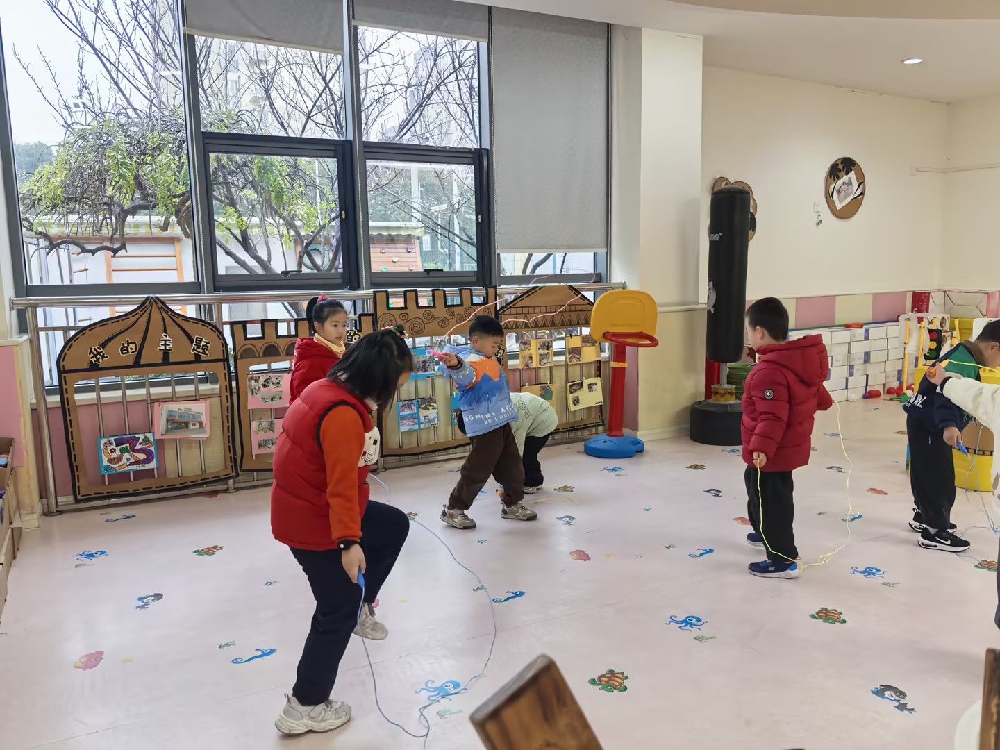 近日,受雾霾天气影响,户外活动暂缓。为确保孩子们每日运动量,我们充分利用平衡木、垫子、呼啦圈、粗绳等器材,精心设计了丰富多样的体锻项目。