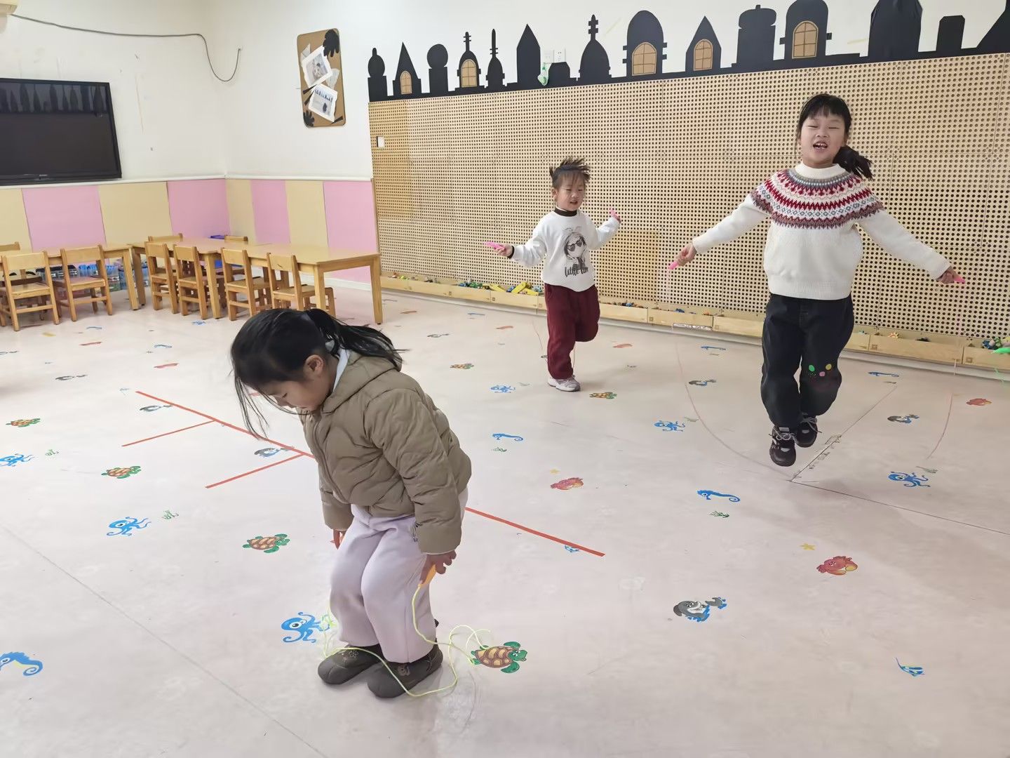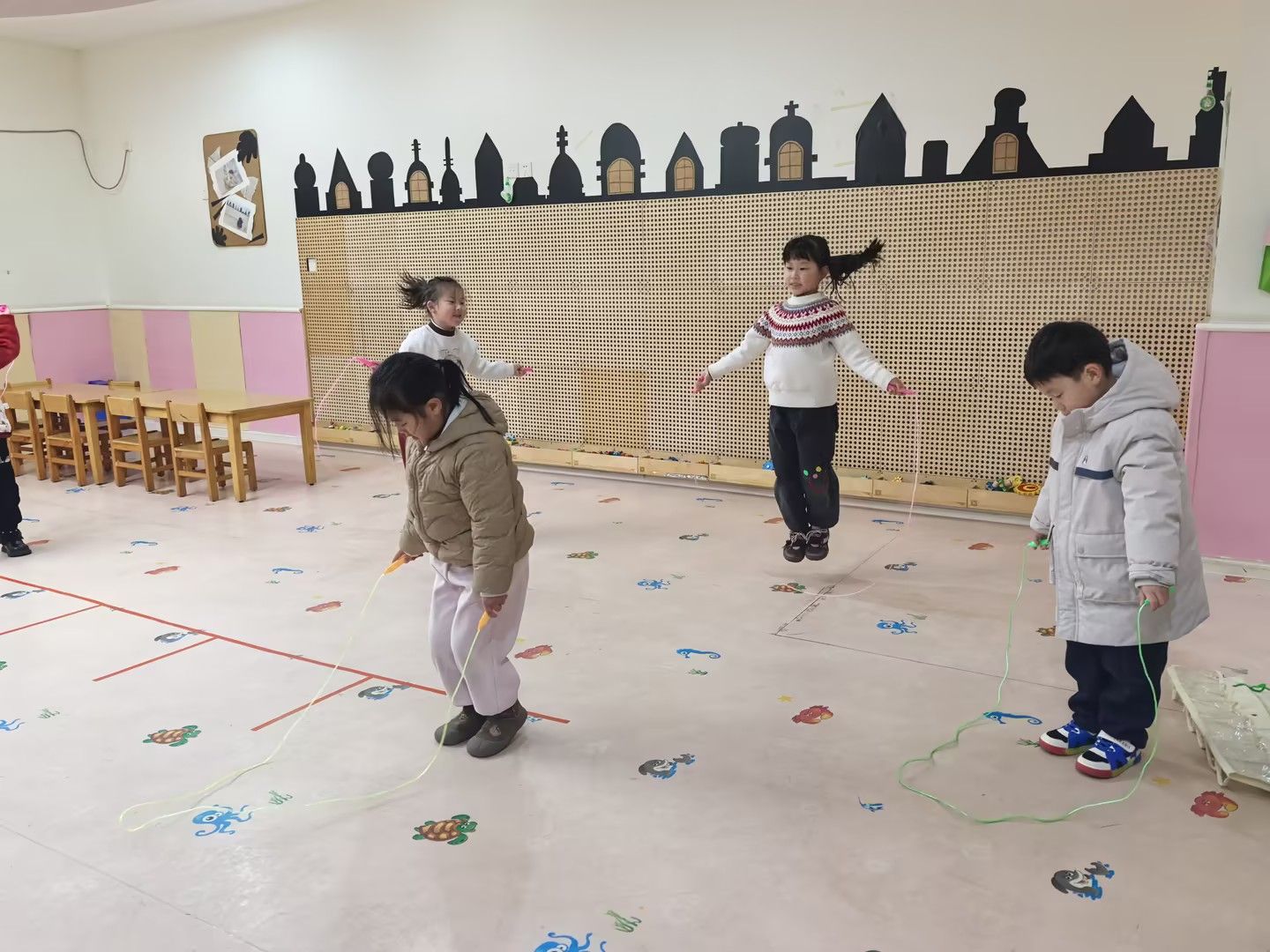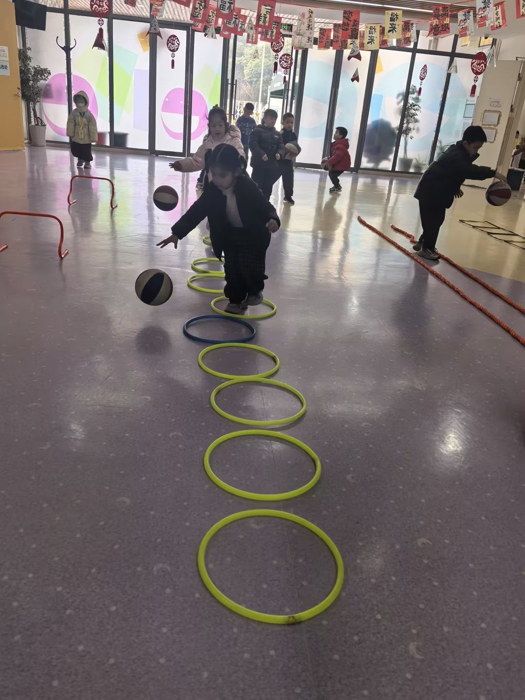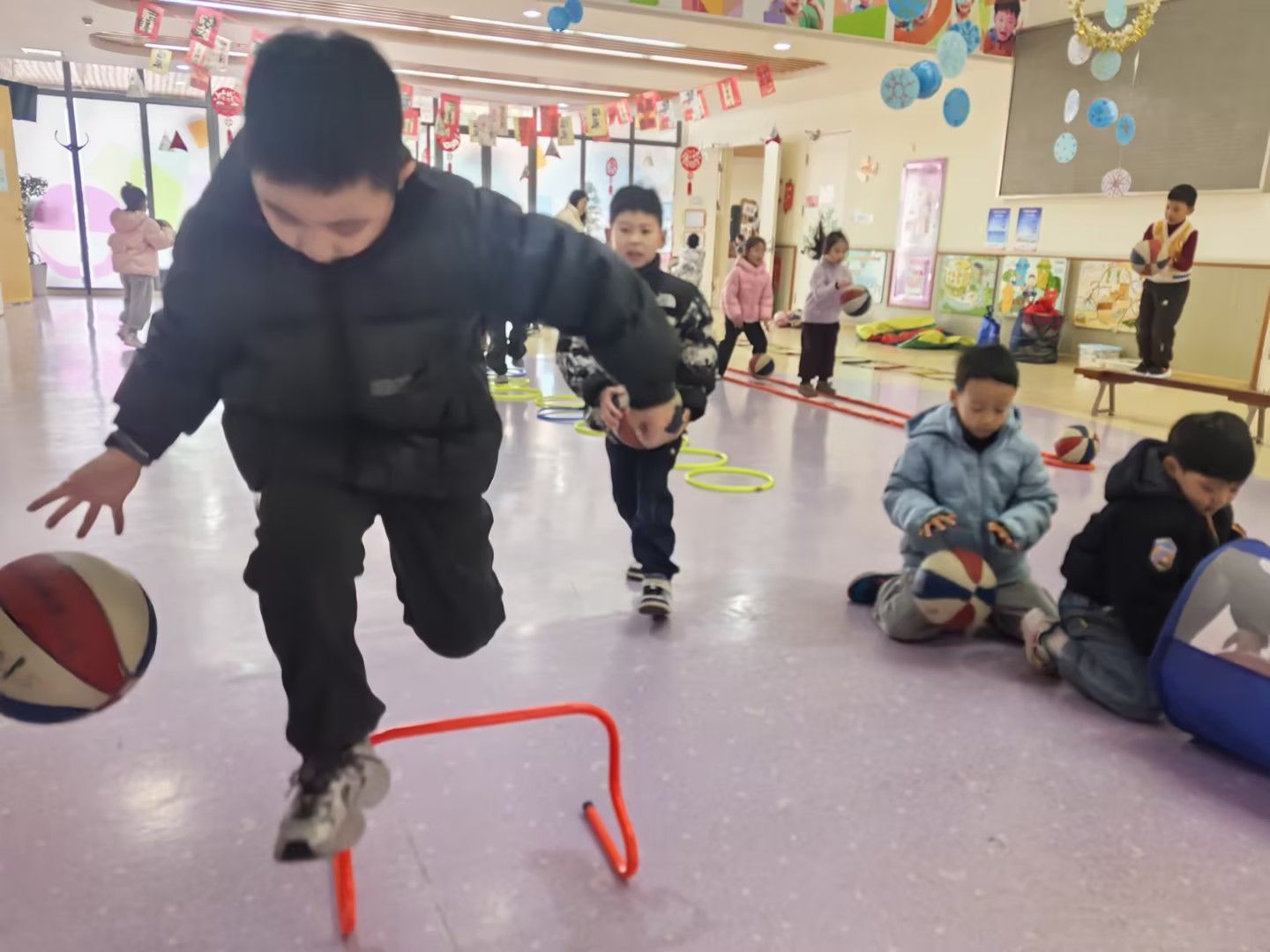 孩子们分组活动,有的轻盈跳绳,挑战连续跳跃;有的运球穿越由积木搭成的“障碍丛林”,锻炼手眼协调;还有的进行跨跳练习,或在低矮的“独木桥”上尝试平衡运球。活动现场气氛热烈,加油声、欢笑声响成一片。孩子们都能“动起来、嗨起来”,健康快乐地成长。