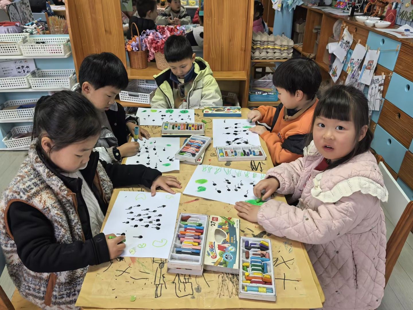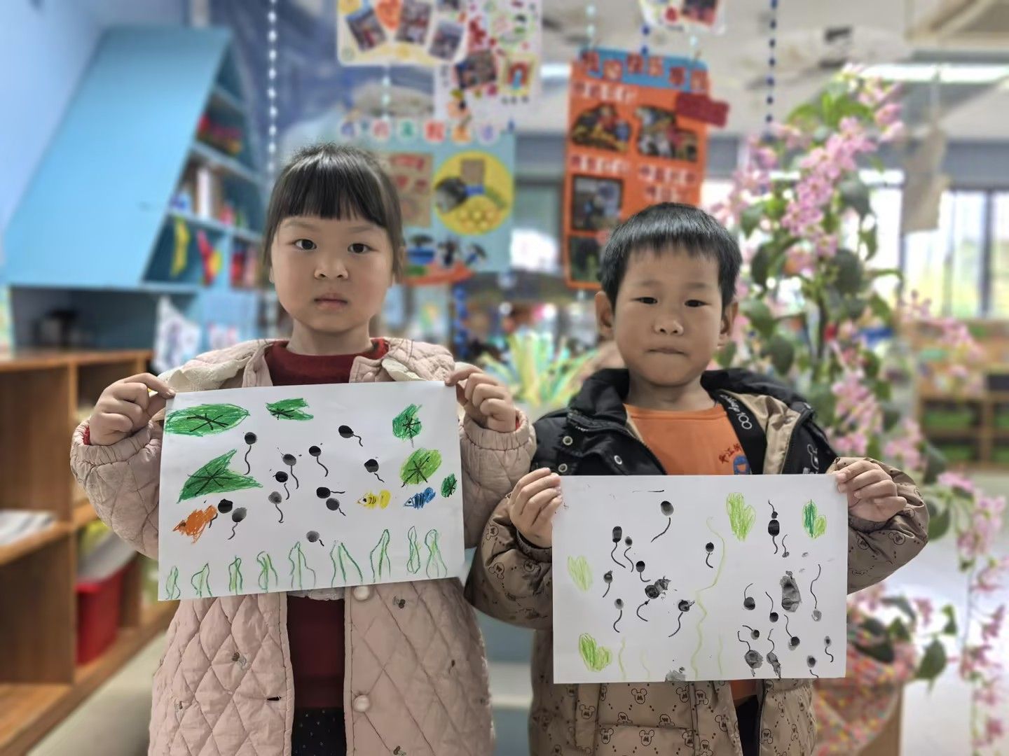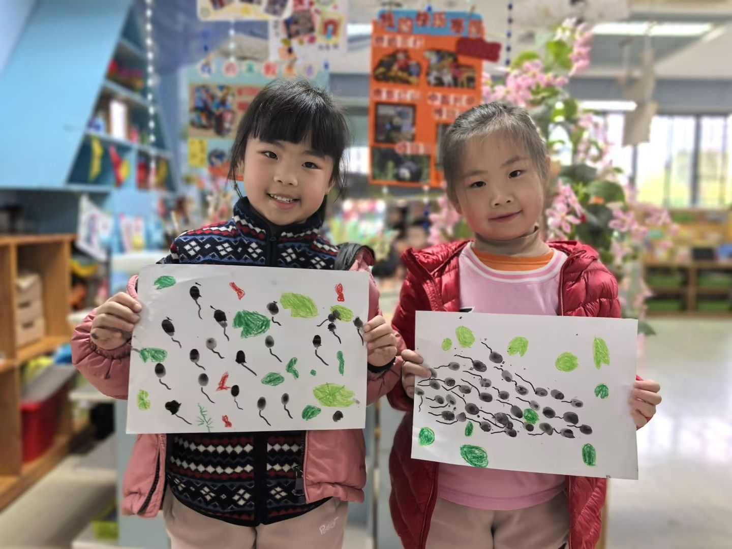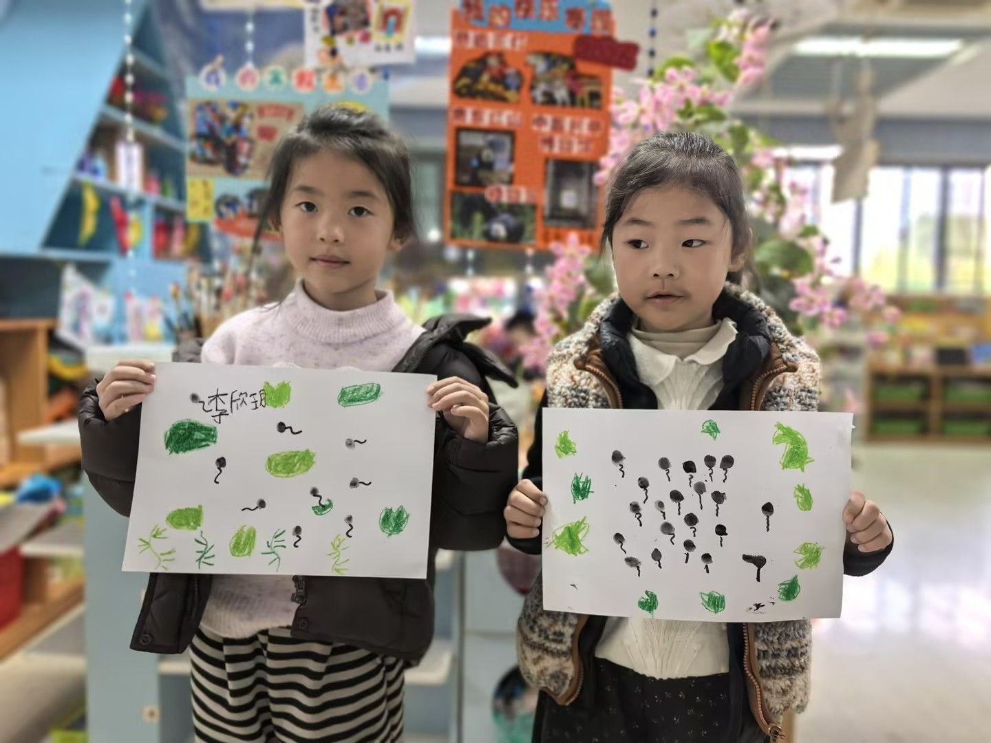 美术活动《小蝌蚪找妈妈》:以绘本故事引入,引导孩子们化身“小小艺术家”。孩子们运用水墨晕染表现蝌蚪的灵动,用撕贴拼画构建池塘生态,或用黏土塑造出青蛙妈妈的立体形象。在“长卷创作”环节,孩子们分工合作,用连续画面完整呈现小蝌蚪寻找妈妈的曲折历程。一幅幅作品中,歪斜的荷叶、鲜艳的水草、圆润的蝌蚪群,无不跃动着稚拙天真的童心。